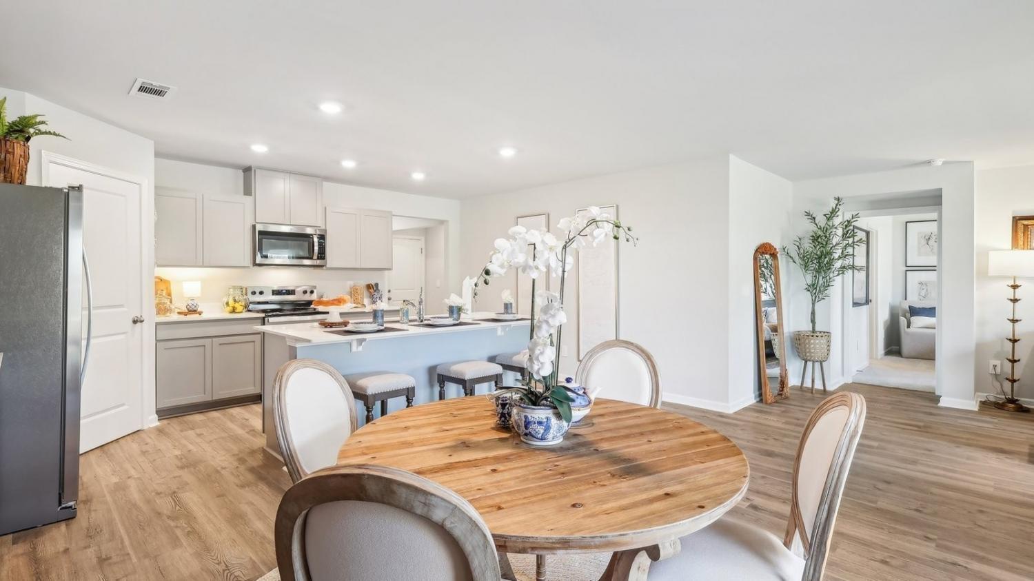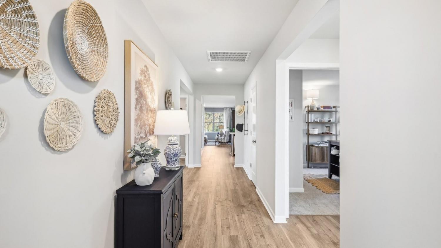 Welcome to the Cali, a stunning new home in Savannah Lakes, Lewisburg, TN. This popular one-story design offers 4 bedrooms, a 2-car garage, and spacious living with four exterior elevation options and modern interior features that make it stand out. Inside, the Cali shines with 8’ ceilings, quartz countertops in the kitchen and bathrooms, and Whirlpool stainless-steel appliances. The kitchen boasts a large island perfect for bar-style dining or entertaining, a walk-in pantry, and ample cabinets and counter space. The dining and living areas open to a covered porch, ideal for relaxing or hosting guests. The roomy primary bedroom at the back ensures privacy and fits a king-size bed comfortably. It features an ensuite bathroom with a double vanity, a huge walk-in closet, and a separate linen closet. Three additional bedrooms share a second bathroom, all with quartz countertops. The two-car garage connects to the front hallway with a laundry room and extra storage closet. The Cali also includes a Home is Connected smart home system, offering control of your home from anywhere. Beautiful landscaping keeps your yard looking great year-round. Discover why the Cali is a fan favorite, schedule a tour today at Savannah Lakes, Lewisburg, TN.