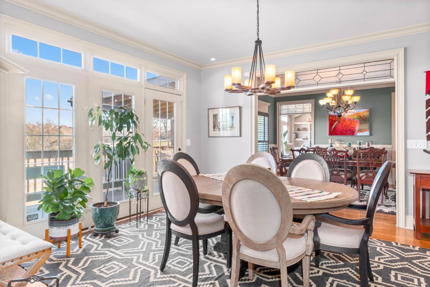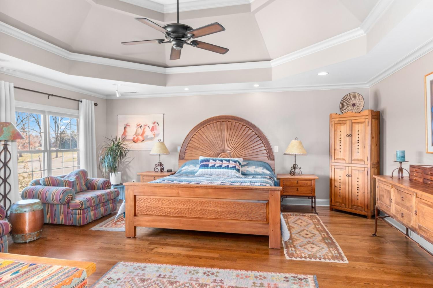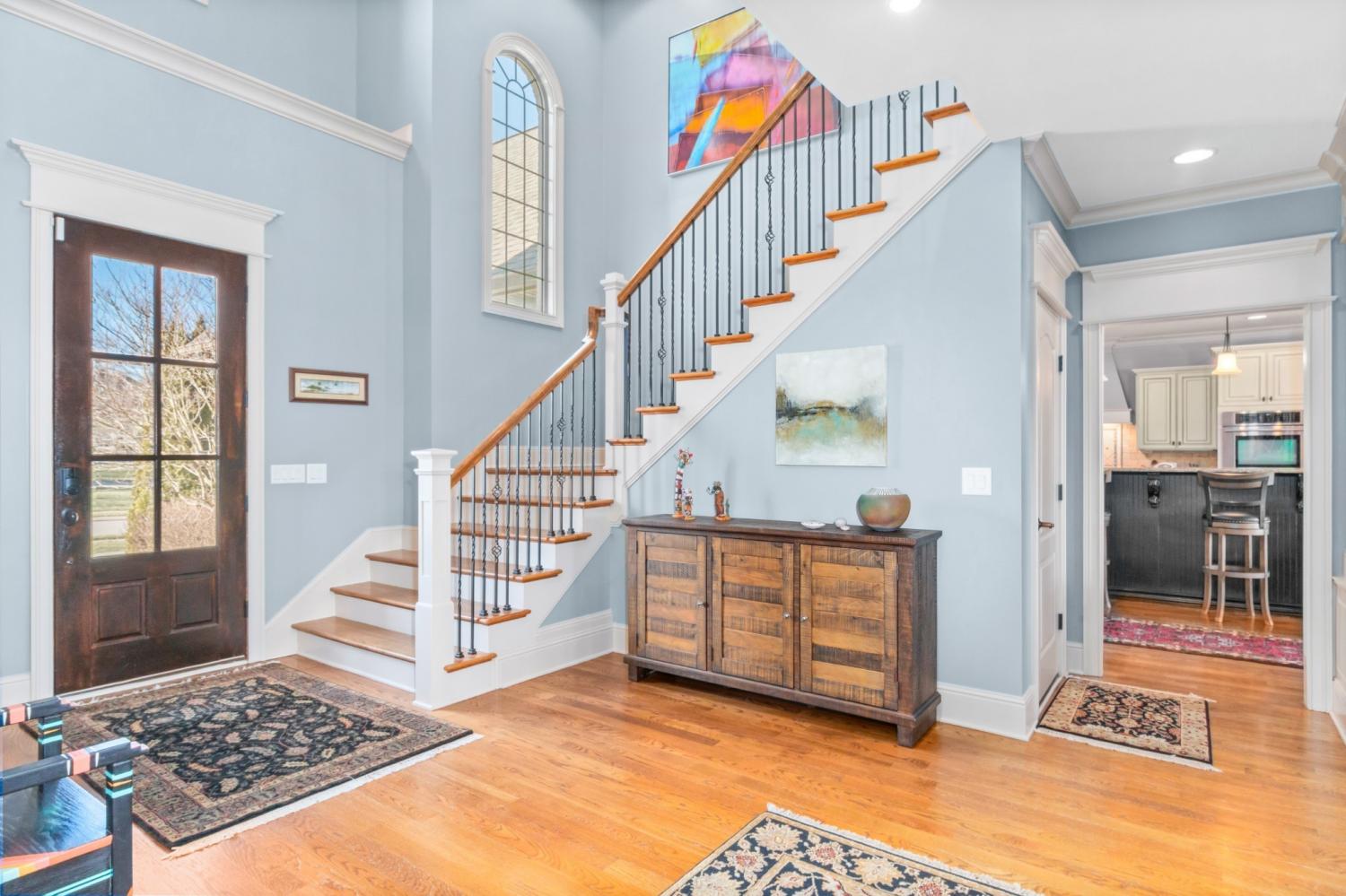 Beautifully Landscaped Brick Home with a View! This home features stunning sunrise views over the pond from floor to ceiling windows, beautiful wood floors and custom cabinetry throughout. The main floor has a 2-story entry opening to an open floor plan that includes a spacious living room with gas fireplace, formal dining room and even an eat-in kitchen with a wood-burning fireplace! You will also find a large pantry, Jenn-air cooktop, double ovens and ice maker in this lovely kitchen. Also on the main floor is the utility room and an office.Upstairs you will find a guest room with an en-suite bath and a Jack and Jill bedroom sharing a full bath. Then there is the Primary Suite Retreat! Only Wow can describe this luxurious space! Huge bedroom with trey ceiling and great view of the pond with its lighted fountain. Adjoining spa like bath has jetted tub, large shower and wrap around vanity with double sinks, then there is the closet of your dreams! Moving to the finished, walk-out basement and you will see an historical bar, large bonus/media room with access to the back yard, 2 bedrooms, one of which adjoins the brand new full bath and has access to the back yard. There is a sink, microwave and wine refrigerator, very large storage area and a maintenance room/shop area with refrigerator, built-in cabinets for projects and tool storage. What a great space! All this in a fantastic location! This gem combines luxurious living, gorgeous views and many thoughtful interior upgrades. Don’t miss it!