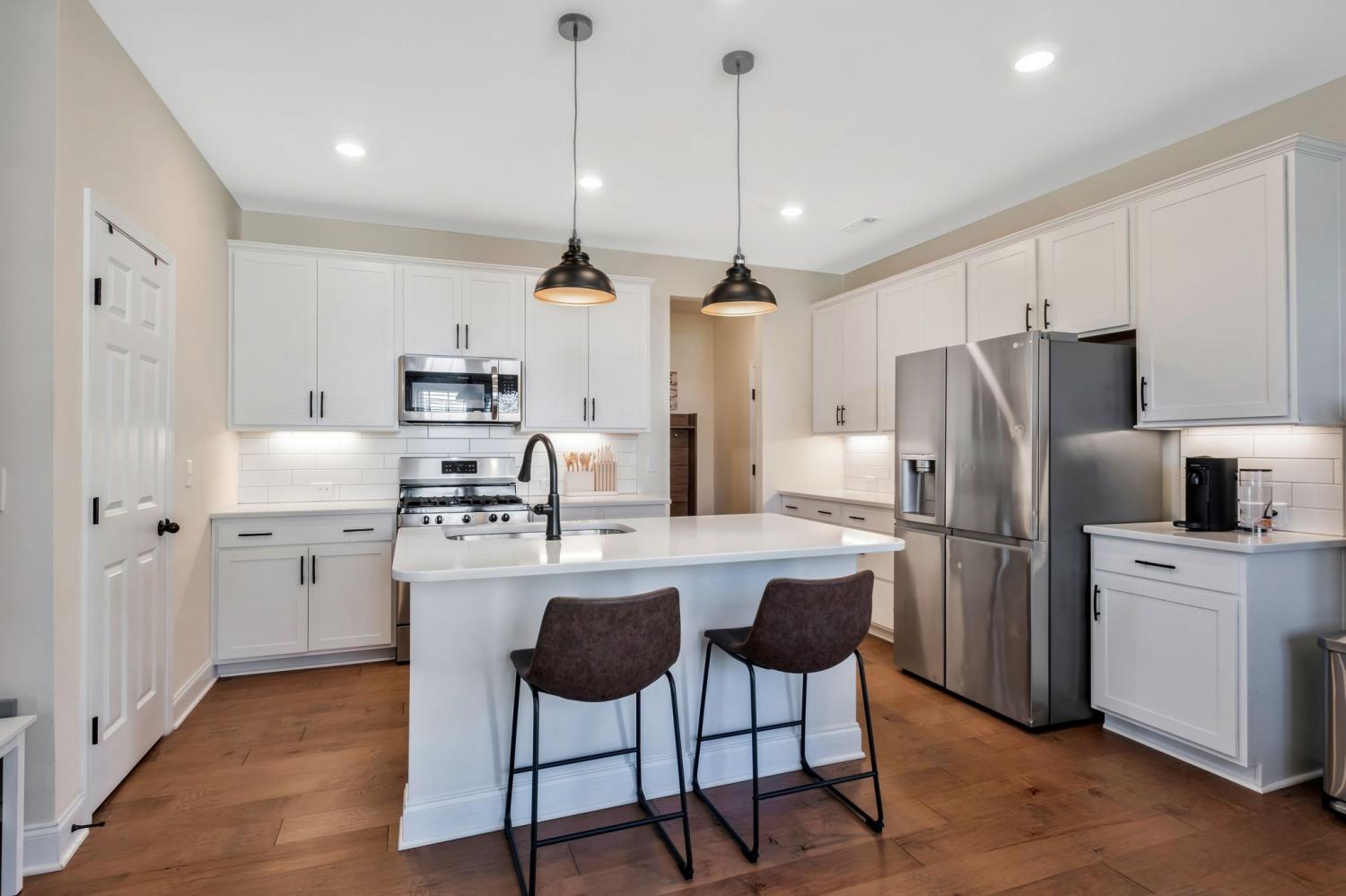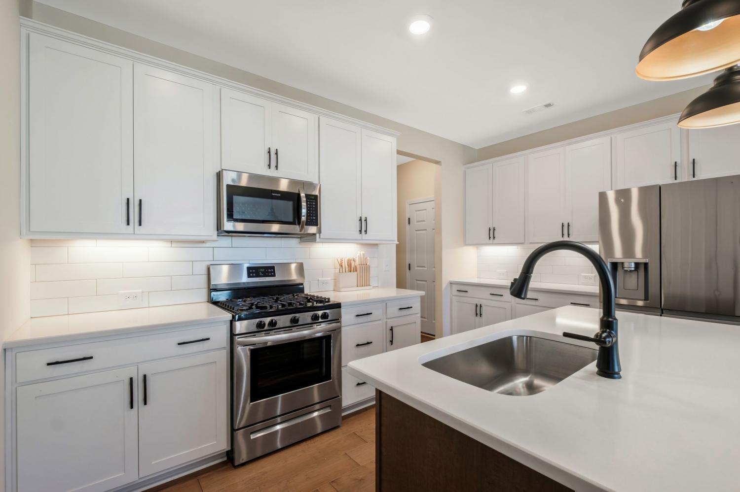 Discover modern living in The Preserve at Belle Pointe with this beautifully designed Hunter floorplan, built in 2023 and loaded with stylish upgrades. This 4BR/2.5BA home features a sought-after layout with the primary suite conveniently located on the main level, while upstairs offers three additional bedrooms, a full bath, and a spacious bonus room—perfect for a playroom, media room, or home office. The bright, open kitchen is a showstopper with quartz countertops, stainless steel appliances, farmhouse sink, a gas range, tile backsplash, dark cabinetry, and recessed & pendant lighting that elevates the space. The living room is warm and inviting with a stacked stone gas fireplace, creating the perfect setting for relaxing or entertaining. Enjoy outdoor living on the covered patio, and appreciate the convenience of a 2-car garage, low HOA fees, and a wealth of community amenities including a clubhouse, fitness center, park, playground, pool, and underground utilities. A stunning, move-in ready home in a vibrant community—this one truly has it all!