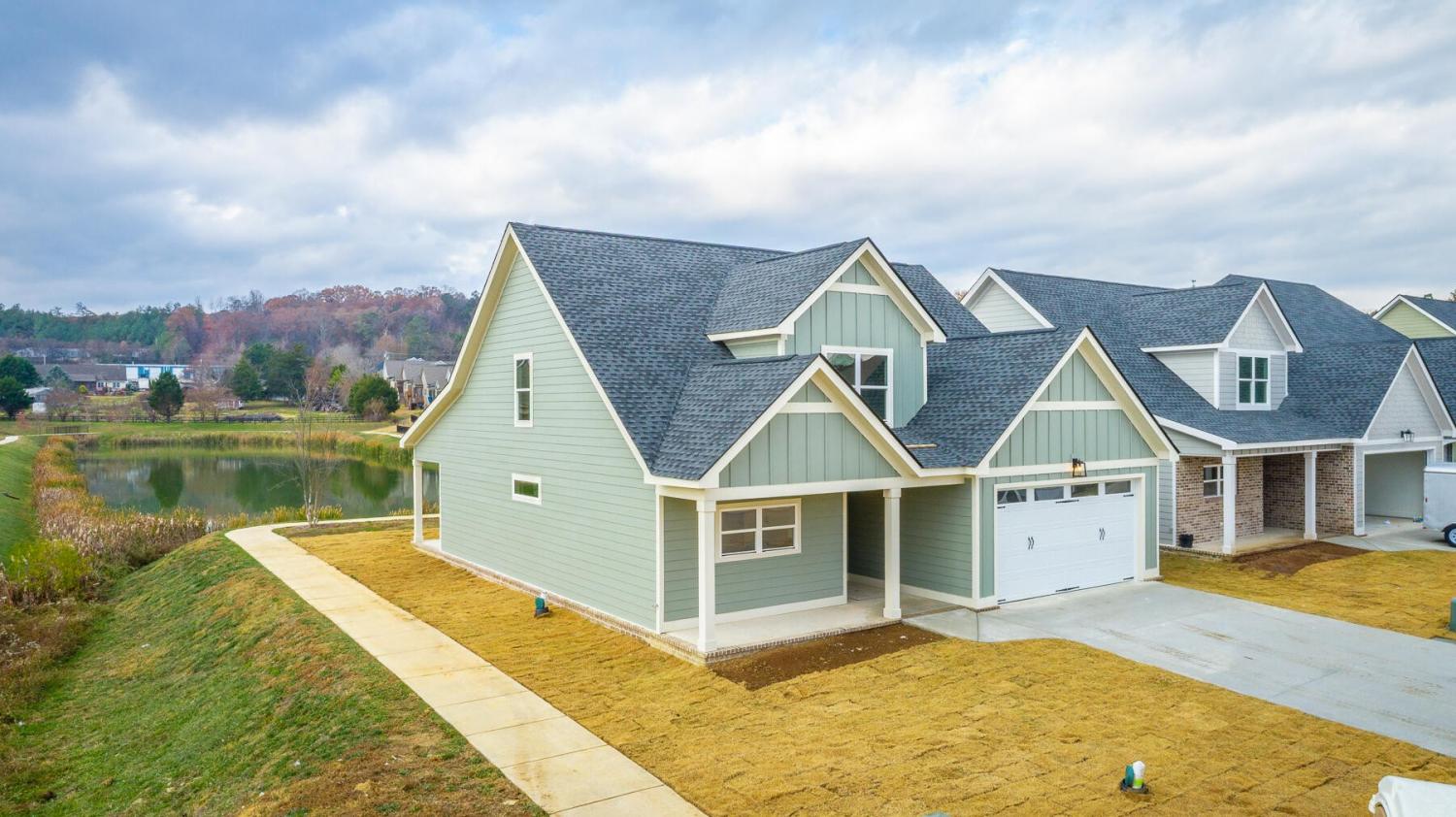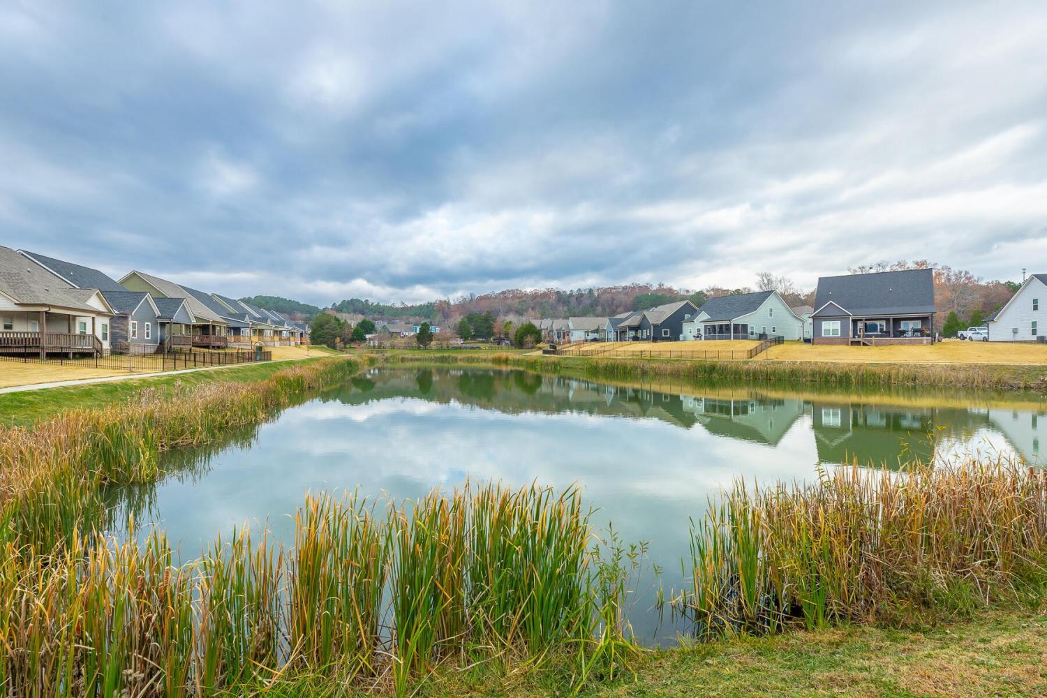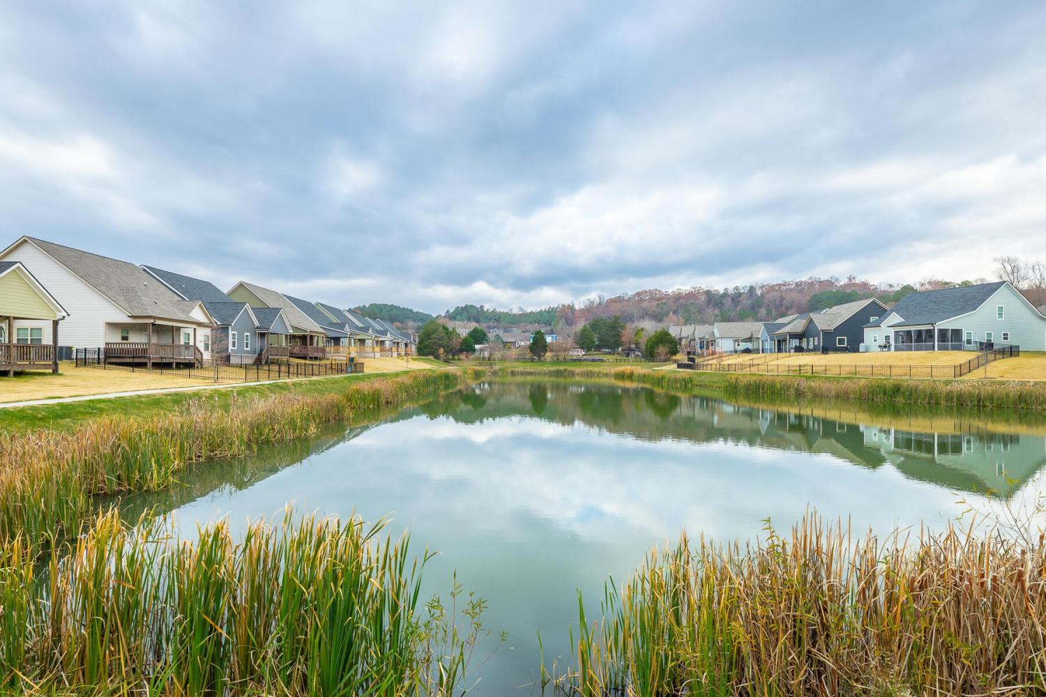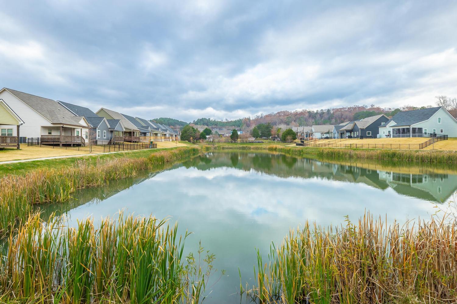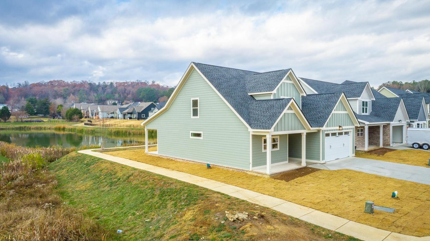 Neighborhood Open House Saturday 1-3pm and Sunday 2-4pm! This brand-new 4 bedroom home in The Grove offers 2 full baths, 2 half baths, and 2,050 square feet of comfortable living space. Nestled on a premium homesite with an open community lot to the left (no neighbor the left side), it provides additional privacy and unobstructed views over the community pond - with stunning sunset views to enjoy! Located in the highly desirable Heritage school zone, The Grove is just minutes from the intersection of Battlefield Parkway and Pine Grove Road, only 2.7 miles from I-75, 19 minutes from downtown Chattanooga, and 23 minutes from Dalton. The charming, sidewalk-lined community features an inground swimming pool, walking paths, and the picturesque pond right at your back doorstep. The exterior of this home features low-maintenance fiber cement siding and brick, energy-efficient low-E vinyl windows, a zero-entry raised slab foundation (no steps to enter the home) and a fully sodded, professionally landscaped yard. Step inside to an inviting foyer that flows into an open-concept main level filled with natural light and direct pond views. Luxury vinyl plank flooring in a warm wood tone runs seamlessly throughout, complemented by soft Shoji White walls. The spacious living and dining areas feature abundant windows for ample natural light and views. The upgraded kitchen is a standout, boasting extensive cabinetry, pantry, granite countertops, a tiled backsplash, custom cabinet hood, slide-in range, pendant lighting over the peninsula, a slide-in range, and a convenient microwave drawer. A stylish half bath with wood vanity, granite countertop, and classic checkerboard flooring is tucked near the owner's entry from the two-car garage, alongside a well-appointed laundry room. Tucked at the rear of the home for maximum tranquility, the vaulted main-level primary suite enjoys abundant natural light and direct pond views.