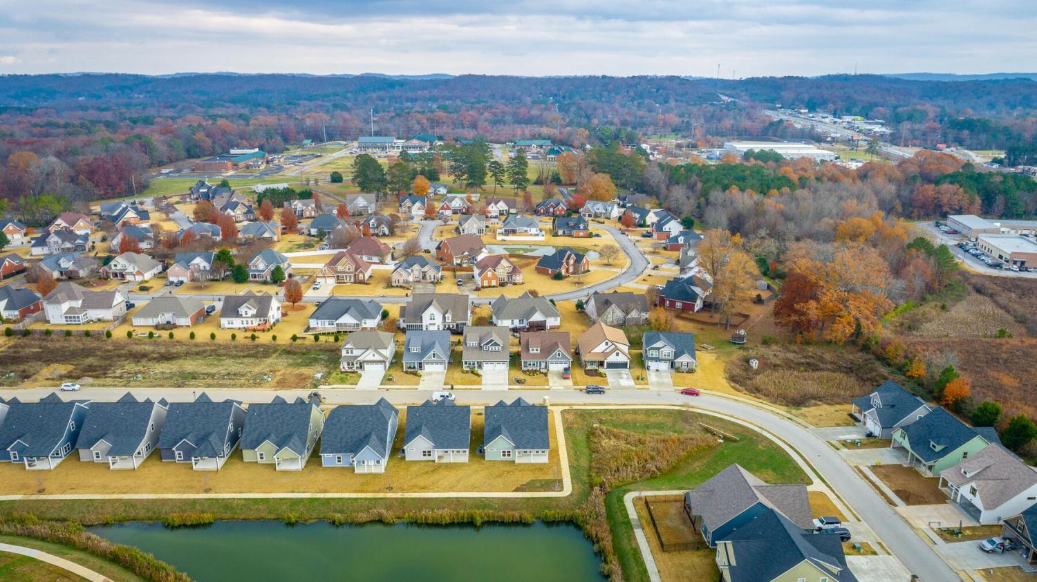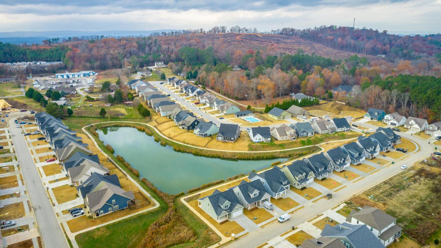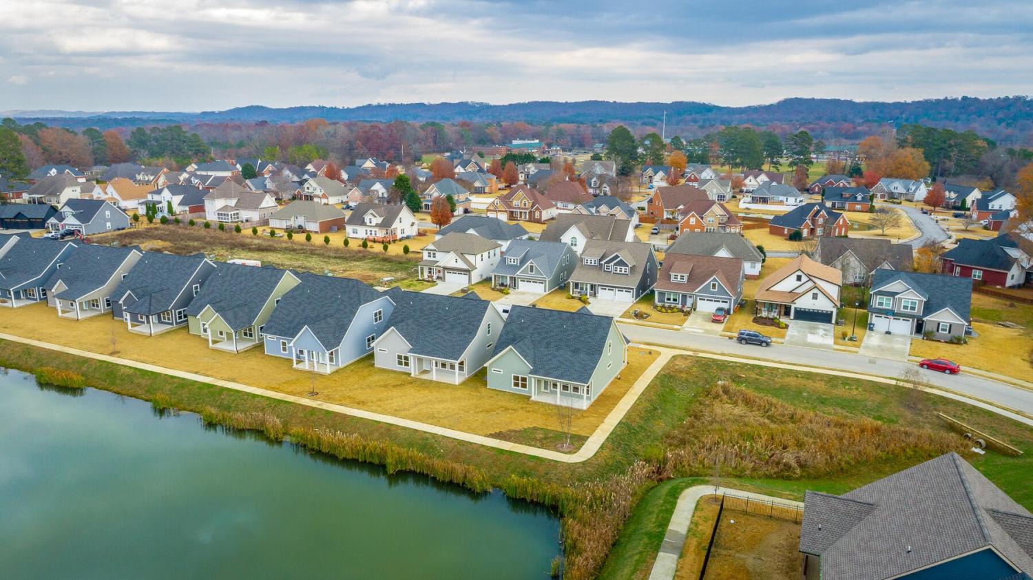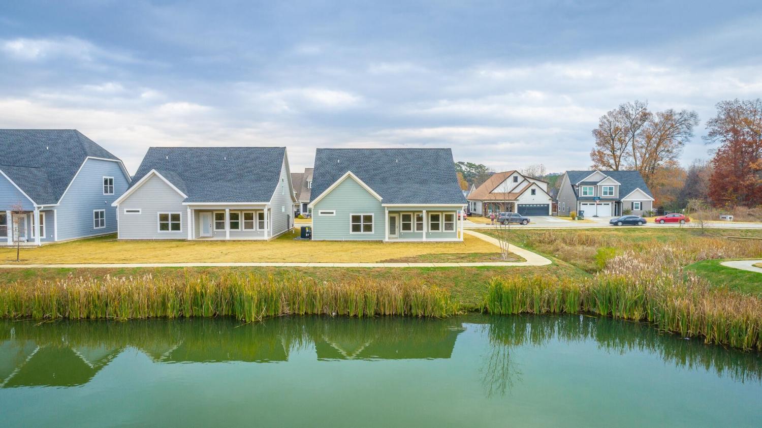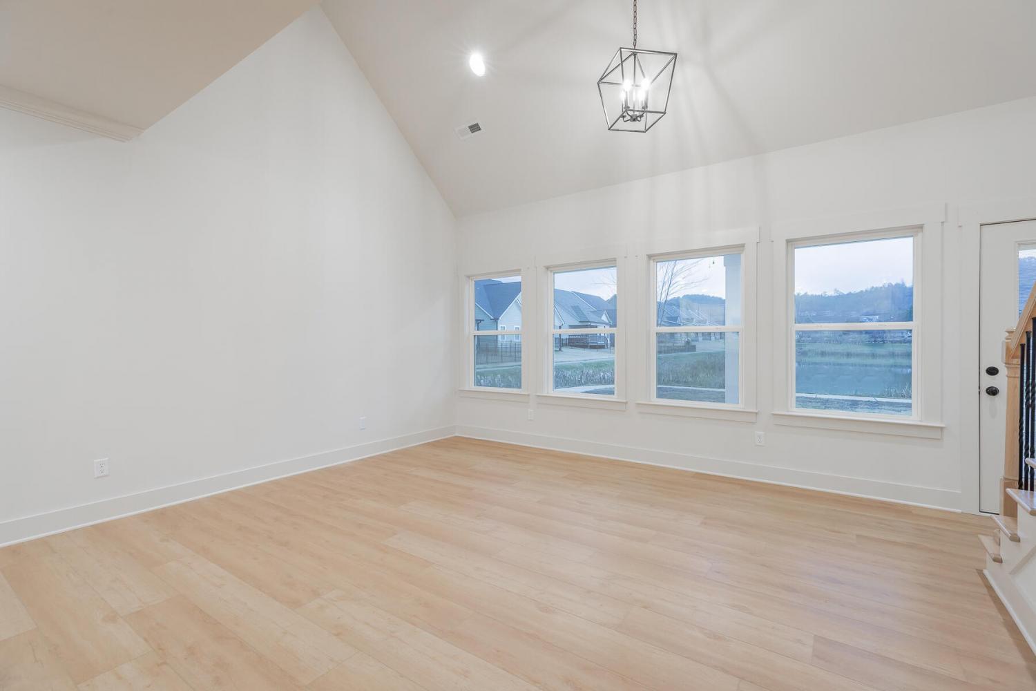 Neighborhood Open House Saturday 1-3pm and Sunday 2-4pm! This brand-new 4 bedroom home in The Grove offers 2 full baths, 2 half baths, and 2,050 square feet of comfortable living space. Nestled on a premium homesite with an open community lot to the left (no neighbor the left side), it provides additional privacy and unobstructed views over the community pond - with stunning sunset views to enjoy! Located in the highly desirable Heritage school zone, The Grove is just minutes from the intersection of Battlefield Parkway and Pine Grove Road, only 2.7 miles from I-75, 19 minutes from downtown Chattanooga, and 23 minutes from Dalton. The charming, sidewalk-lined community features an inground swimming pool, walking paths, and the picturesque pond right at your back doorstep. The exterior of this home features low-maintenance fiber cement siding and brick, energy-efficient low-E vinyl windows, a zero-entry raised slab foundation (no steps to enter the home) and a fully sodded, professionally landscaped yard. Step inside to an inviting foyer that flows into an open-concept main level filled with natural light and direct pond views. Luxury vinyl plank flooring in a warm wood tone runs seamlessly throughout, complemented by soft Shoji White walls. The spacious living and dining areas feature abundant windows for ample natural light and views. The upgraded kitchen is a standout, boasting extensive cabinetry, pantry, granite countertops, a tiled backsplash, custom cabinet hood, slide-in range, pendant lighting over the peninsula, a slide-in range, and a convenient microwave drawer. A stylish half bath with wood vanity, granite countertop, and classic checkerboard flooring is tucked near the owner's entry from the two-car garage, alongside a well-appointed laundry room. Tucked at the rear of the home for maximum tranquility, the vaulted main-level primary suite enjoys abundant natural light and direct pond views.