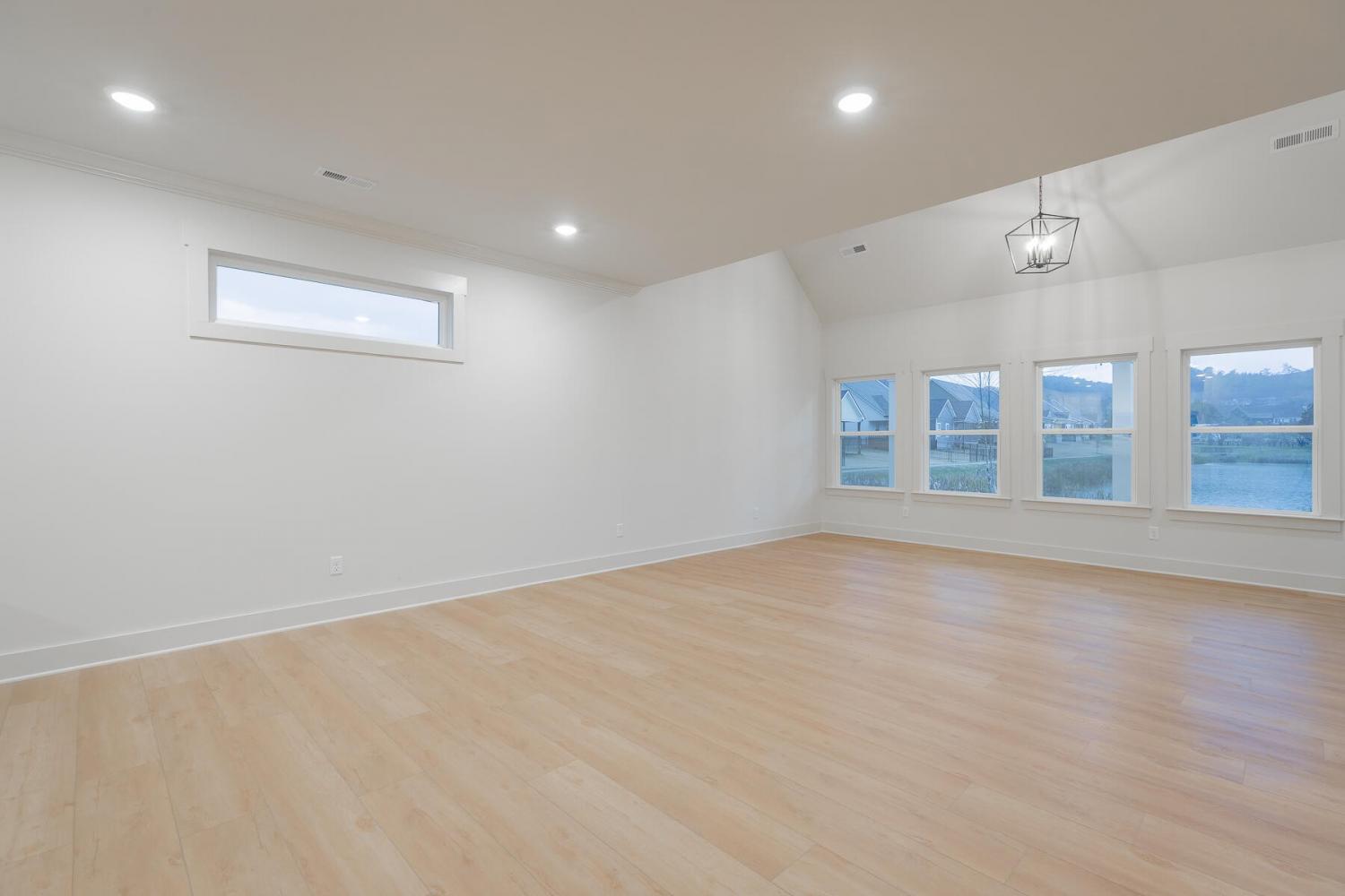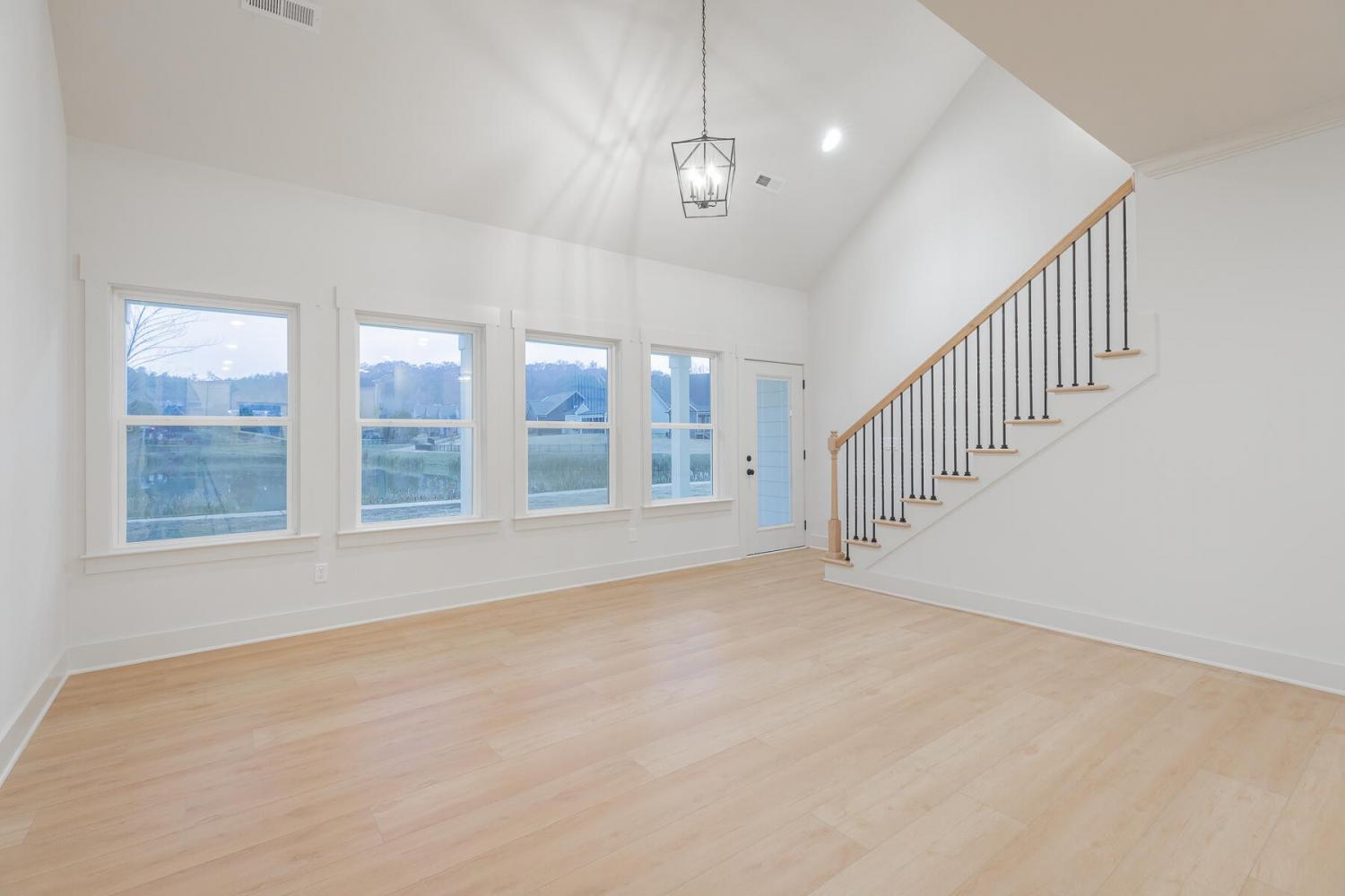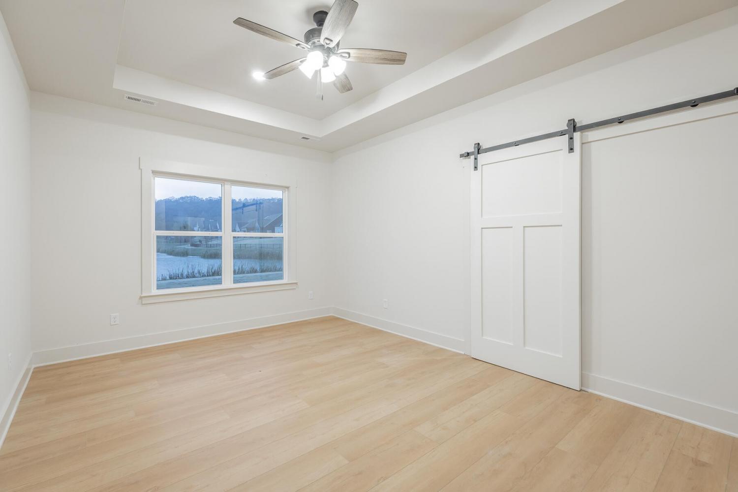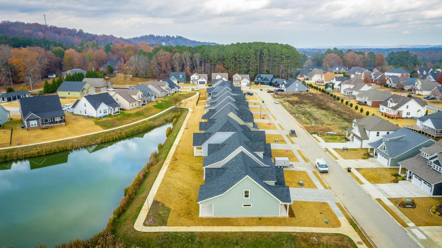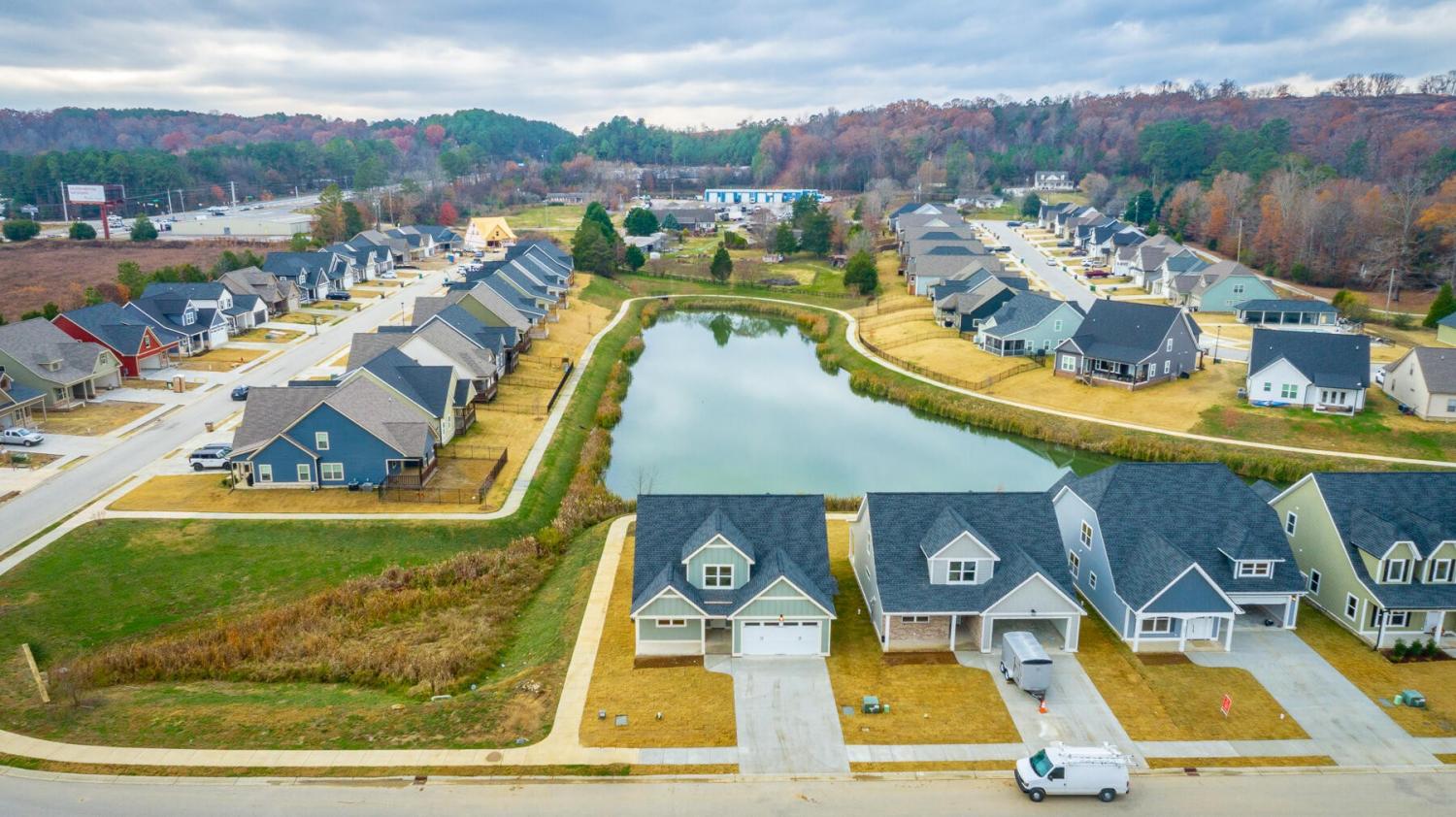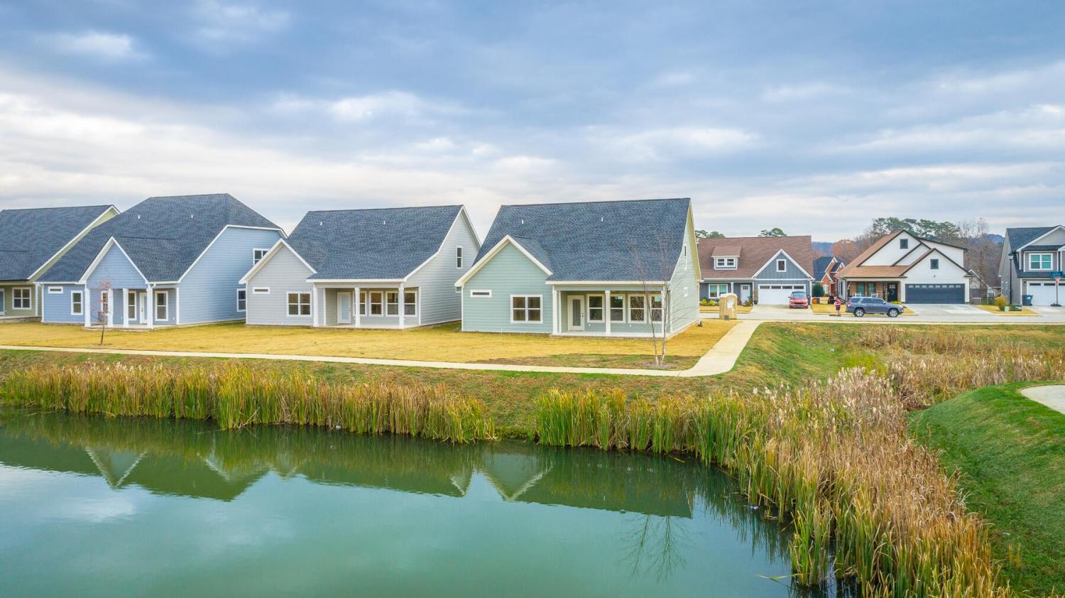 Neighborhood Open House Saturday 1-3pm and Sunday 2-4pm! This brand-new 4 bedroom home in The Grove offers 2 full baths, 2 half baths, and 2,050 square feet of comfortable living space. Nestled on a premium homesite with an open community lot to the left (no neighbor the left side), it provides additional privacy and unobstructed views over the community pond - with stunning sunset views to enjoy! Located in the highly desirable Heritage school zone, The Grove is just minutes from the intersection of Battlefield Parkway and Pine Grove Road, only 2.7 miles from I-75, 19 minutes from downtown Chattanooga, and 23 minutes from Dalton. The charming, sidewalk-lined community features an inground swimming pool, walking paths, and the picturesque pond right at your back doorstep. The exterior of this home features low-maintenance fiber cement siding and brick, energy-efficient low-E vinyl windows, a zero-entry raised slab foundation (no steps to enter the home) and a fully sodded, professionally landscaped yard. Step inside to an inviting foyer that flows into an open-concept main level filled with natural light and direct pond views. Luxury vinyl plank flooring in a warm wood tone runs seamlessly throughout, complemented by soft Shoji White walls. The spacious living and dining areas feature abundant windows for ample natural light and views. The upgraded kitchen is a standout, boasting extensive cabinetry, pantry, granite countertops, a tiled backsplash, custom cabinet hood, slide-in range, pendant lighting over the peninsula, a slide-in range, and a convenient microwave drawer. A stylish half bath with wood vanity, granite countertop, and classic checkerboard flooring is tucked near the owner's entry from the two-car garage, alongside a well-appointed laundry room. Tucked at the rear of the home for maximum tranquility, the vaulted main-level primary suite enjoys abundant natural light and direct pond views.