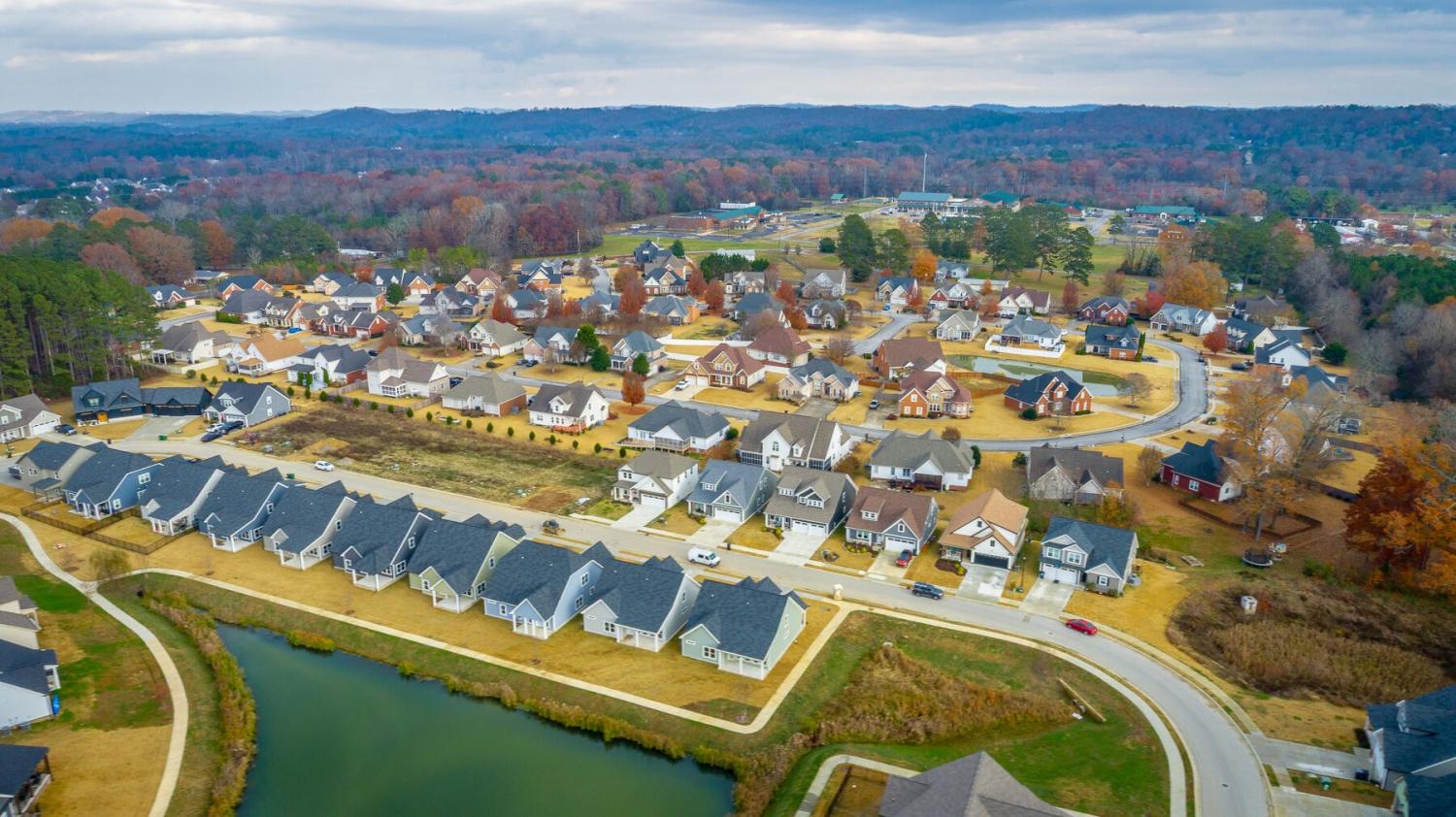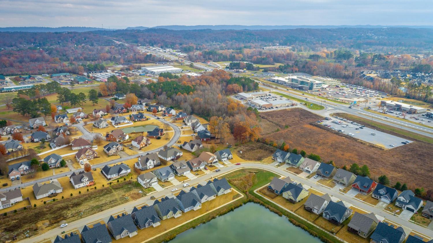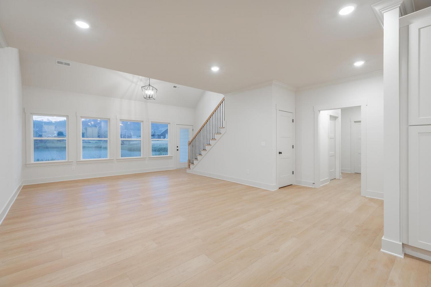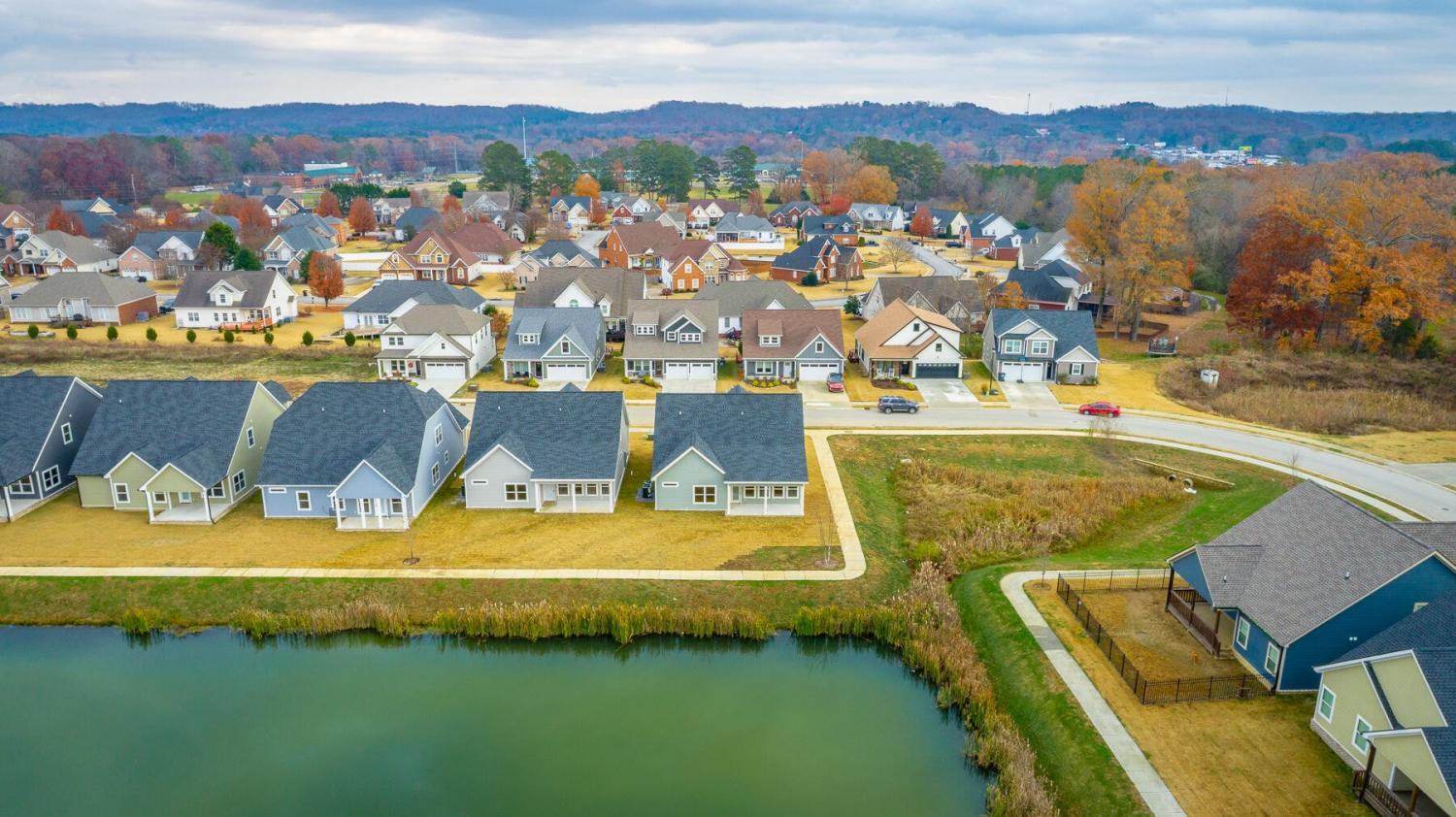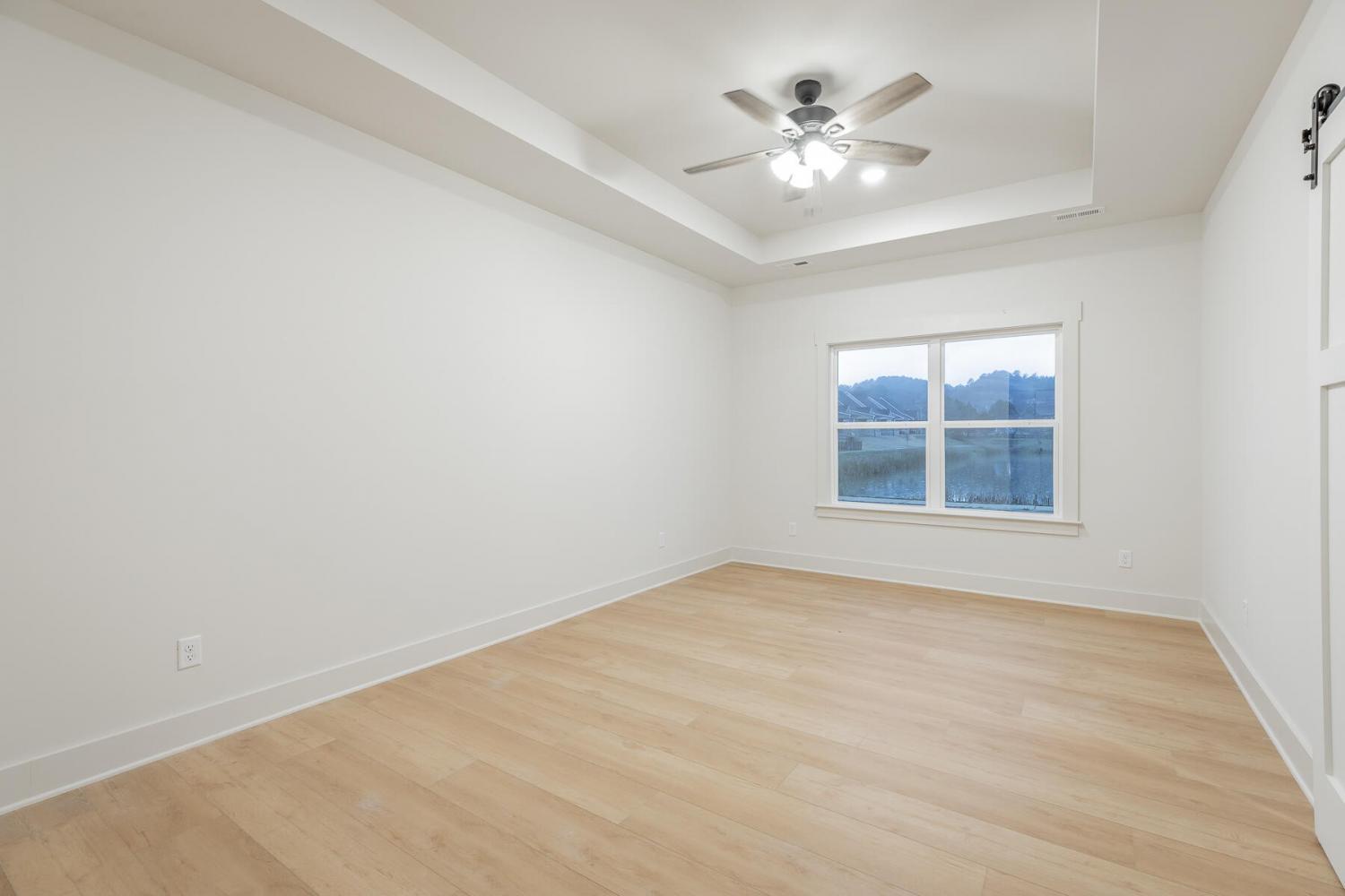Neighborhood Open House Saturday 1-3pm and Sunday 2-4pm! This brand-new 4 bedroom home in The Grove offers 2 full baths, 2 half baths, and 2,050 square feet of comfortable living space. Nestled on a premium homesite with an open community lot to the left (no neighbor the left side), it provides additional privacy and unobstructed views over the community pond - with stunning sunset views to enjoy! Located in the highly desirable Heritage school zone, The Grove is just minutes from the intersection of Battlefield Parkway and Pine Grove Road, only 2.7 miles from I-75, 19 minutes from downtown Chattanooga, and 23 minutes from Dalton. The charming, sidewalk-lined community features an inground swimming pool, walking paths, and the picturesque pond right at your back doorstep. The exterior of this home features low-maintenance fiber cement siding and brick, energy-efficient low-E vinyl windows, a zero-entry raised slab foundation (no steps to enter the home) and a fully sodded, professionally landscaped yard. Step inside to an inviting foyer that flows into an open-concept main level filled with natural light and direct pond views. Luxury vinyl plank flooring in a warm wood tone runs seamlessly throughout, complemented by soft Shoji White walls. The spacious living and dining areas feature abundant windows for ample natural light and views. The upgraded kitchen is a standout, boasting extensive cabinetry, pantry, granite countertops, a tiled backsplash, custom cabinet hood, slide-in range, pendant lighting over the peninsula, a slide-in range, and a convenient microwave drawer. A stylish half bath with wood vanity, granite countertop, and classic checkerboard flooring is tucked near the owner's entry from the two-car garage, alongside a well-appointed laundry room. Tucked at the rear of the home for maximum tranquility, the vaulted main-level primary suite enjoys abundant natural light and direct pond views.