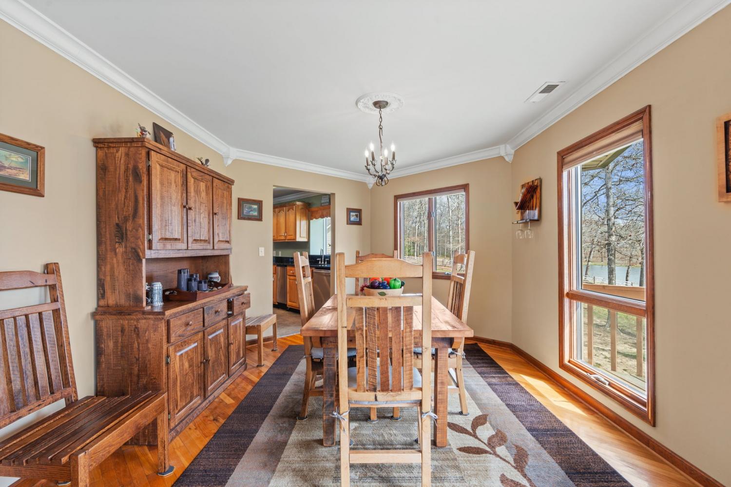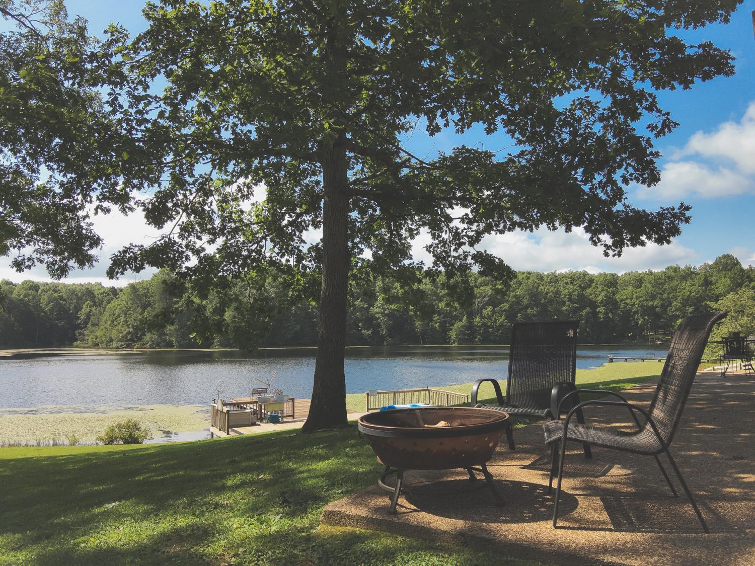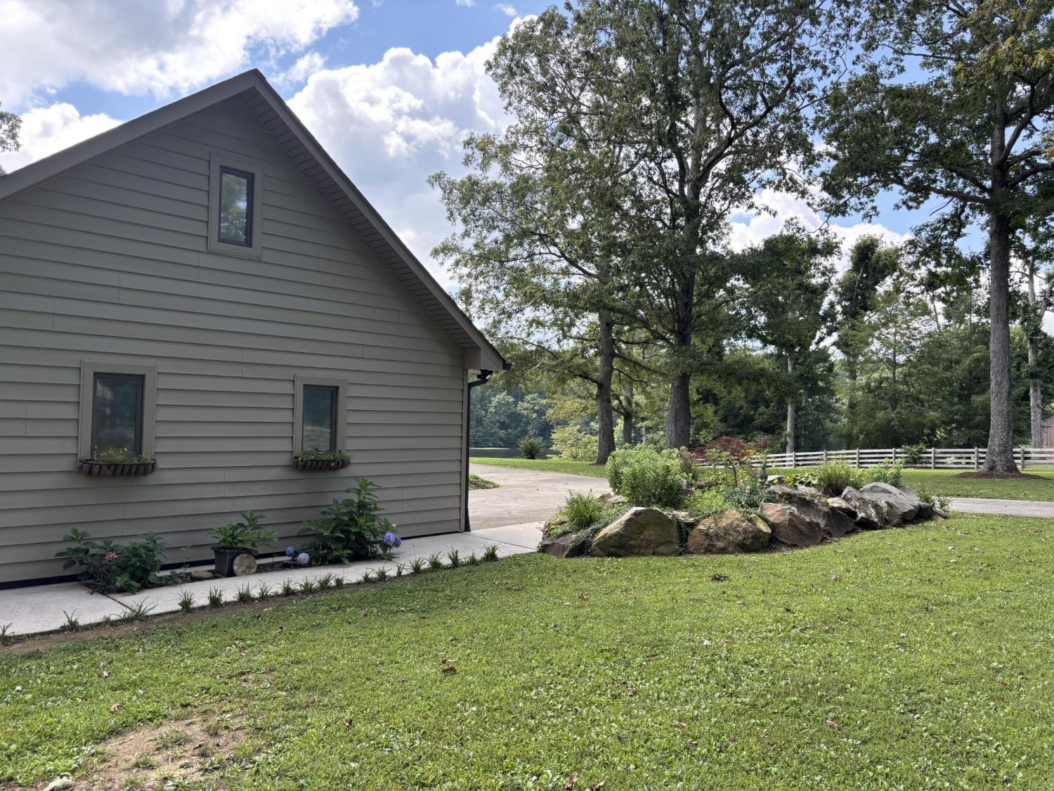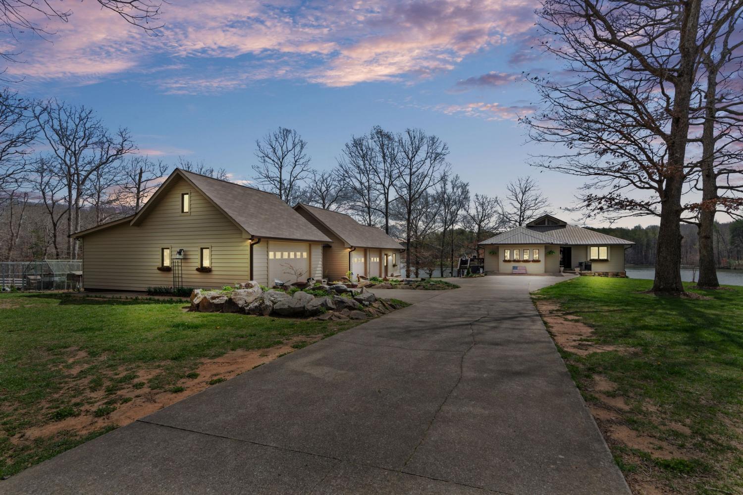 Lakeside living at its finest for those who want to relax and play. This stunning 4-bedroom, 3,408-square-foot home nestled on 1.73 fenced in acres of serene lakefront property on Big Creek Lake. Thoughtfully designed for all who love nature and comfort. Step inside to a warm and inviting living room featuring a striking stone fireplace and beautiful wooden soaring ceilings surrounded by windows to enjoy the views of the lake. The spacious layout includes a separate dining room and a chef-ready kitchen accented with granite, new appliances featuring an b/in oven, microwave, warmer & pantry.The main-level master suite is a true retreat, offering an en suite bath and an oversized, luxury suite-style closet and direct access to the deck to enjoy the lake views from. Other touches throughout the home, trey ceilings and vaulted ceilings add architectural elegance with hardwood & tile. Stepping downstairs to the walk out basement level you will find a large den with its own fireplace that opens to a walk-out patio—perfect for entertaining or enjoying quiet evenings by the water. A generous deck off of the main level overlooking the lake provides additional outdoor living space with breathtaking views. You can watch the family playing or fishing and wildlife out on the water from the main deck, another small grilling deck is located just off of the kitchen for easy access. This property also includes a oversized detached three-car garage/ boat room -heat & cooled, tool room & complete with a finished office and a large attic for ample storage and its own private covered patio area.. Enjoy direct access to the water from your private dock, making lakeside recreation effortless. A rare combination of space, craftsmanship, and waterfront beauty—this home offers the ultimate lakefront lifestyle. This home would also make a fantastic investment property as a possible Airbnb. With the many amenities in the area including State parks and OHV trails, driving range and much more!