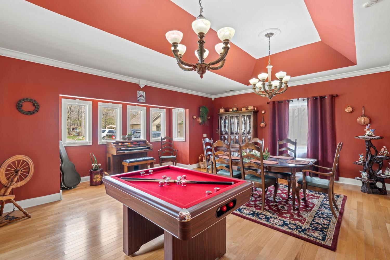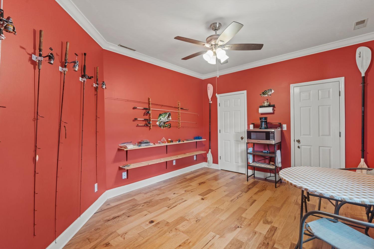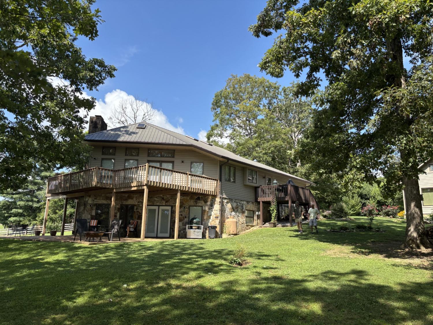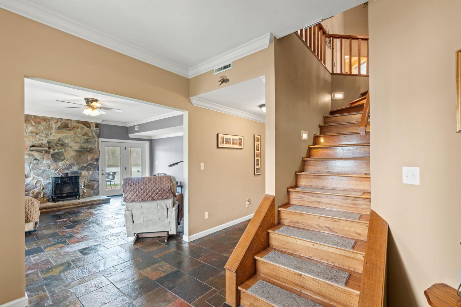 Lakeside living at its finest for those who want to relax and play. This stunning 4-bedroom, 3,408-square-foot home nestled on 1.73 fenced in acres of serene lakefront property on Big Creek Lake. Thoughtfully designed for all who love nature and comfort. Step inside to a warm and inviting living room featuring a striking stone fireplace and beautiful wooden soaring ceilings surrounded by windows to enjoy the views of the lake. The spacious layout includes a separate dining room and a chef-ready kitchen accented with granite, new appliances featuring an b/in oven, microwave, warmer & pantry.The main-level master suite is a true retreat, offering an en suite bath and an oversized, luxury suite-style closet and direct access to the deck to enjoy the lake views from. Other touches throughout the home, trey ceilings and vaulted ceilings add architectural elegance with hardwood & tile. Stepping downstairs to the walk out basement level you will find a large den with its own fireplace that opens to a walk-out patio—perfect for entertaining or enjoying quiet evenings by the water. A generous deck off of the main level overlooking the lake provides additional outdoor living space with breathtaking views. You can watch the family playing or fishing and wildlife out on the water from the main deck, another small grilling deck is located just off of the kitchen for easy access. This property also includes a oversized detached three-car garage/ boat room -heat & cooled, tool room & complete with a finished office and a large attic for ample storage and its own private covered patio area.. Enjoy direct access to the water from your private dock, making lakeside recreation effortless. A rare combination of space, craftsmanship, and waterfront beauty—this home offers the ultimate lakefront lifestyle. This home would also make a fantastic investment property as a possible Airbnb. With the many amenities in the area including State parks and OHV trails, driving range and much more!