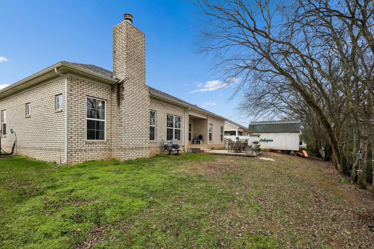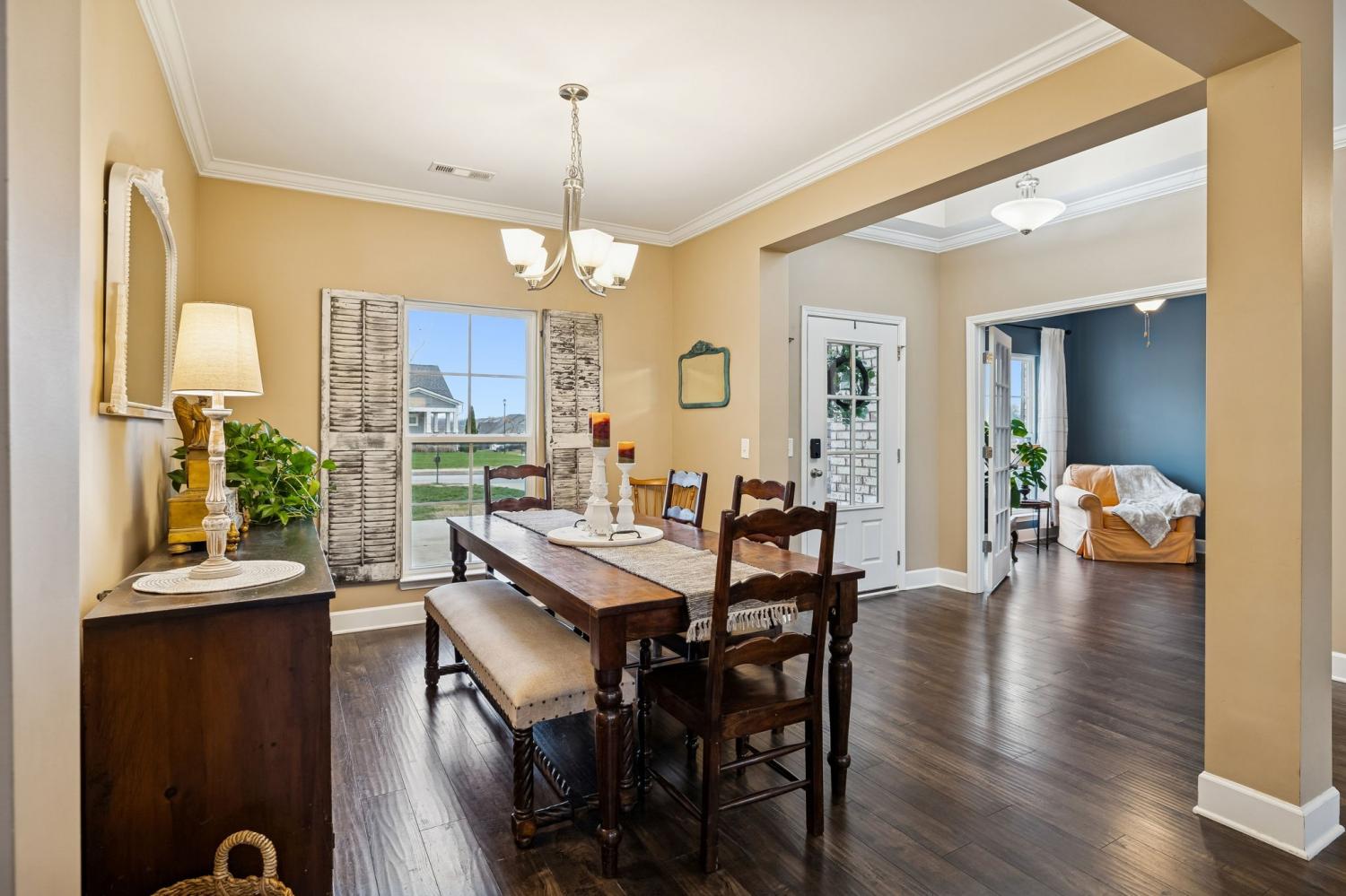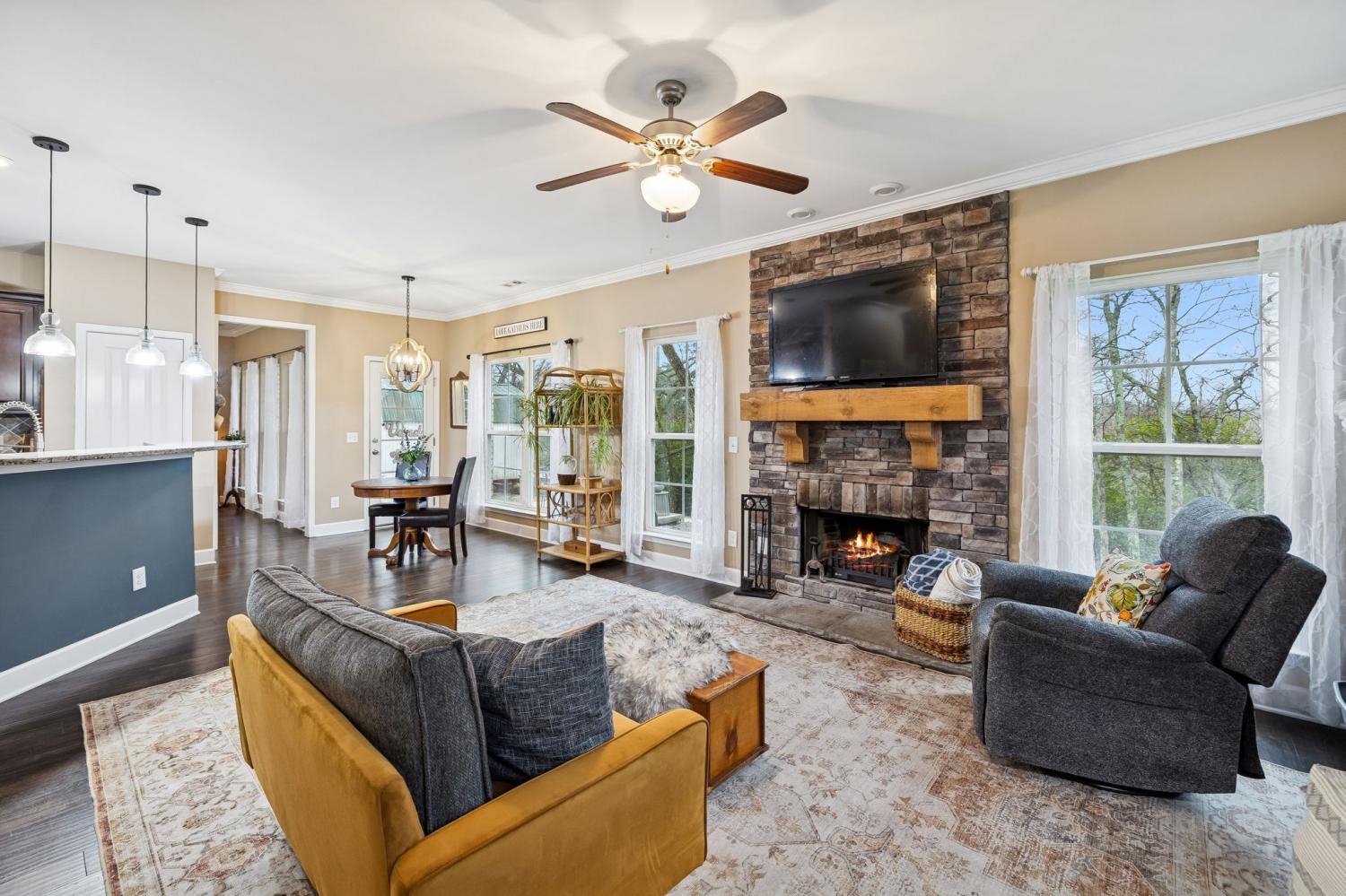 Beautiful all-brick, one-level living home on a spacious lot that backs up to a tree line, offering a private backyard with no homes behind it. This well-maintained home built by Regent Homes is filled with high quality finishes throughout. The inviting covered front porch welcomes you as you step inside this home featuring a Great Room with a stunning coffered ceiling and large windows overlooking the peaceful backyard. The front Flex Room with French doors is ideal for a home office, study, or potential 4th bedroom. You’ll love the Eat-In Kitchen that opens to the Hearth Room showcasing a beautiful stone wood burning fireplace, or enjoy entertaining in the designated Dining Room. The spacious Primary Suite features a tiled step-in shower, garden tub, double vanities, and a large walk-in closet. This home is filled with upgrades including crown molding, upgraded light fixtures and ceiling fans, NEW carpet in all bedrooms (2025), NEW dishwasher and garbage disposal (2024), and a NEW roof (2025) with leaf filter gutter guards. Covered Back Porch and patio create the perfect outdoor living space to enjoy watching all of the wildlife that make their home in the woods and farmland behind you. Extended driveway provides plenty of extra parking space and an outdoor shed for additional storage. Convenient North Columbia location minutes from Spring Hill shopping & dining and a short drive to Historic Downtown Columbia, with easy access to Saturn Pkwy/I-65. Don’t miss the chance to make this stunning home your own!
