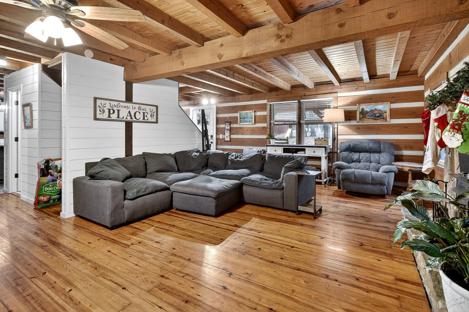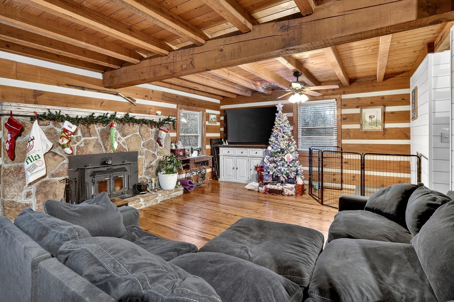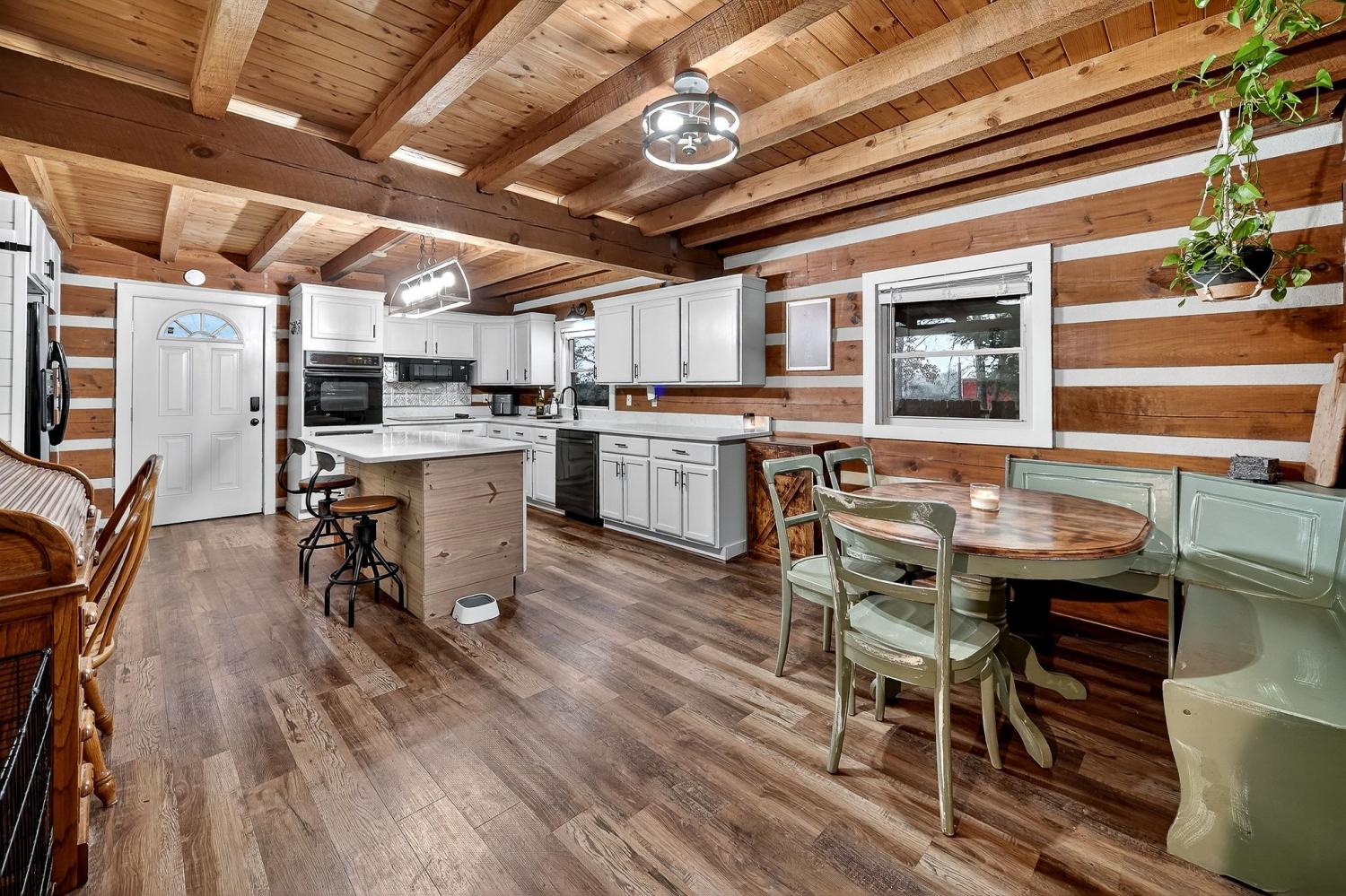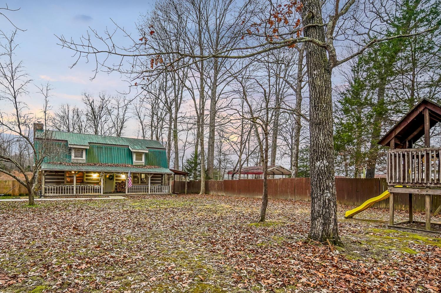 Step into this rustic charm with this gorgeous 3 bedroom, 2 bath log home on 5 acres. Warm wood tones, an open concept living area, and wood burning fire place make it a great place to relax. Outside, enjoy the wide covered porch, perfecting for relaxing or entertaining. The property includes an impressive large detached garage, ideal for storage, hobbies, or a workshop. With ample space, privacy, and timeless log-home character, this property id perfect for those seeking country living. Behind the home there is a septic and utilities ran for another home to be added. Leaf guard installed. New grounding rods installed 2025.