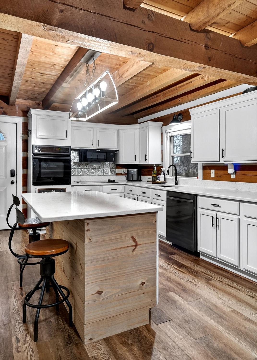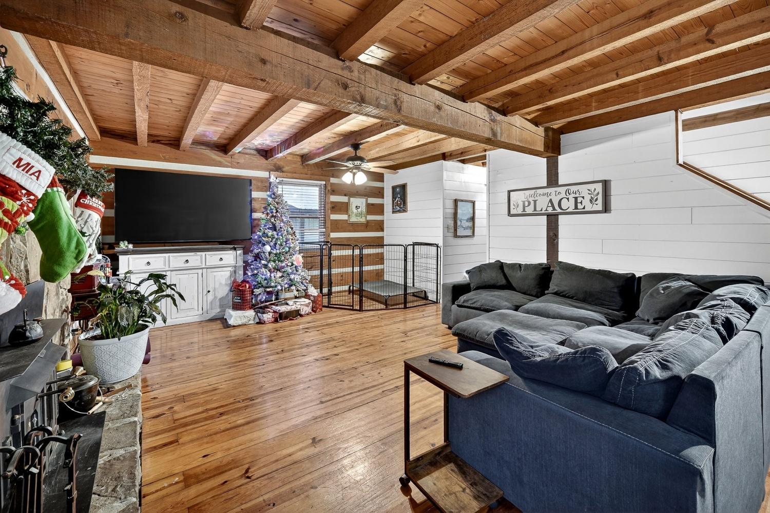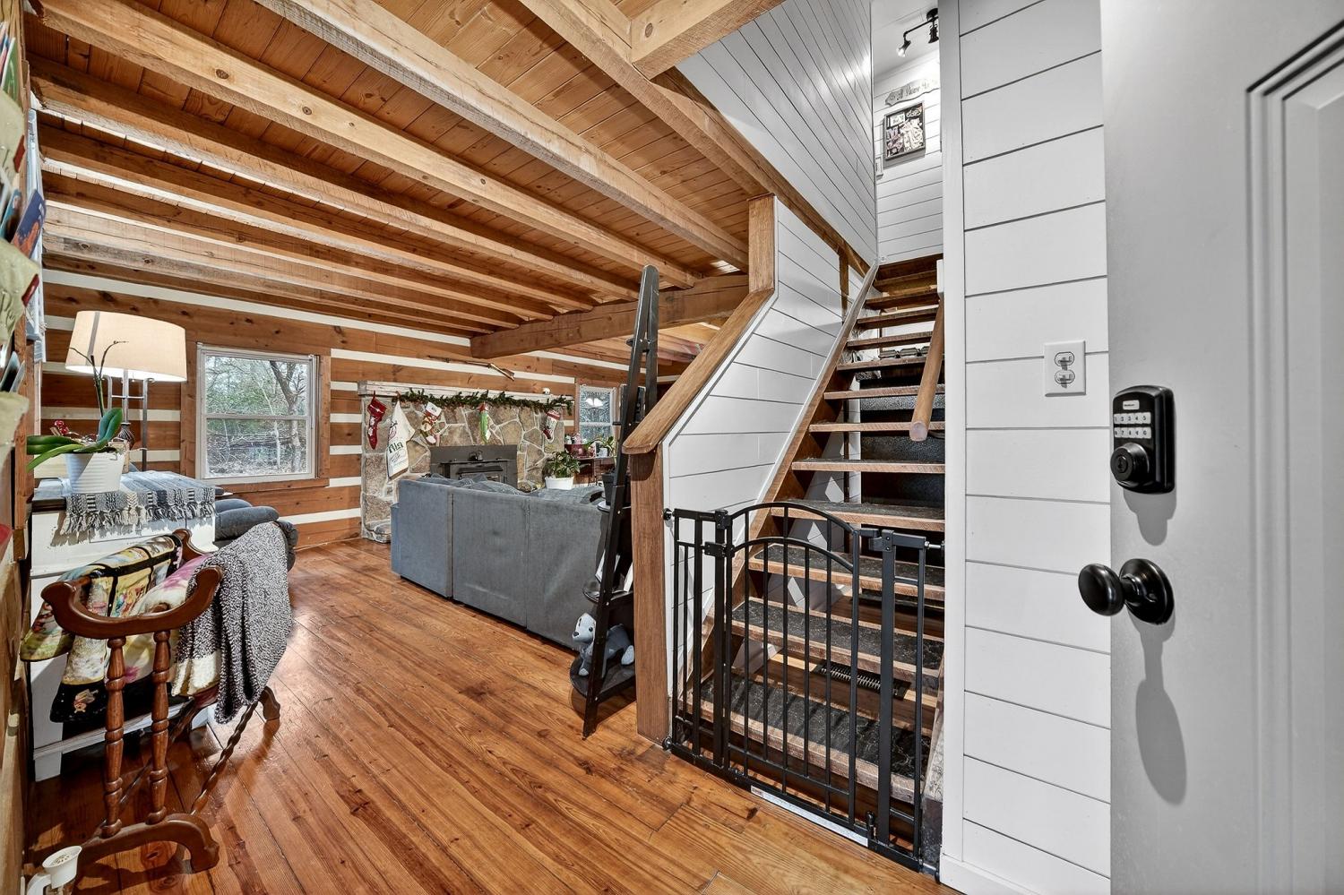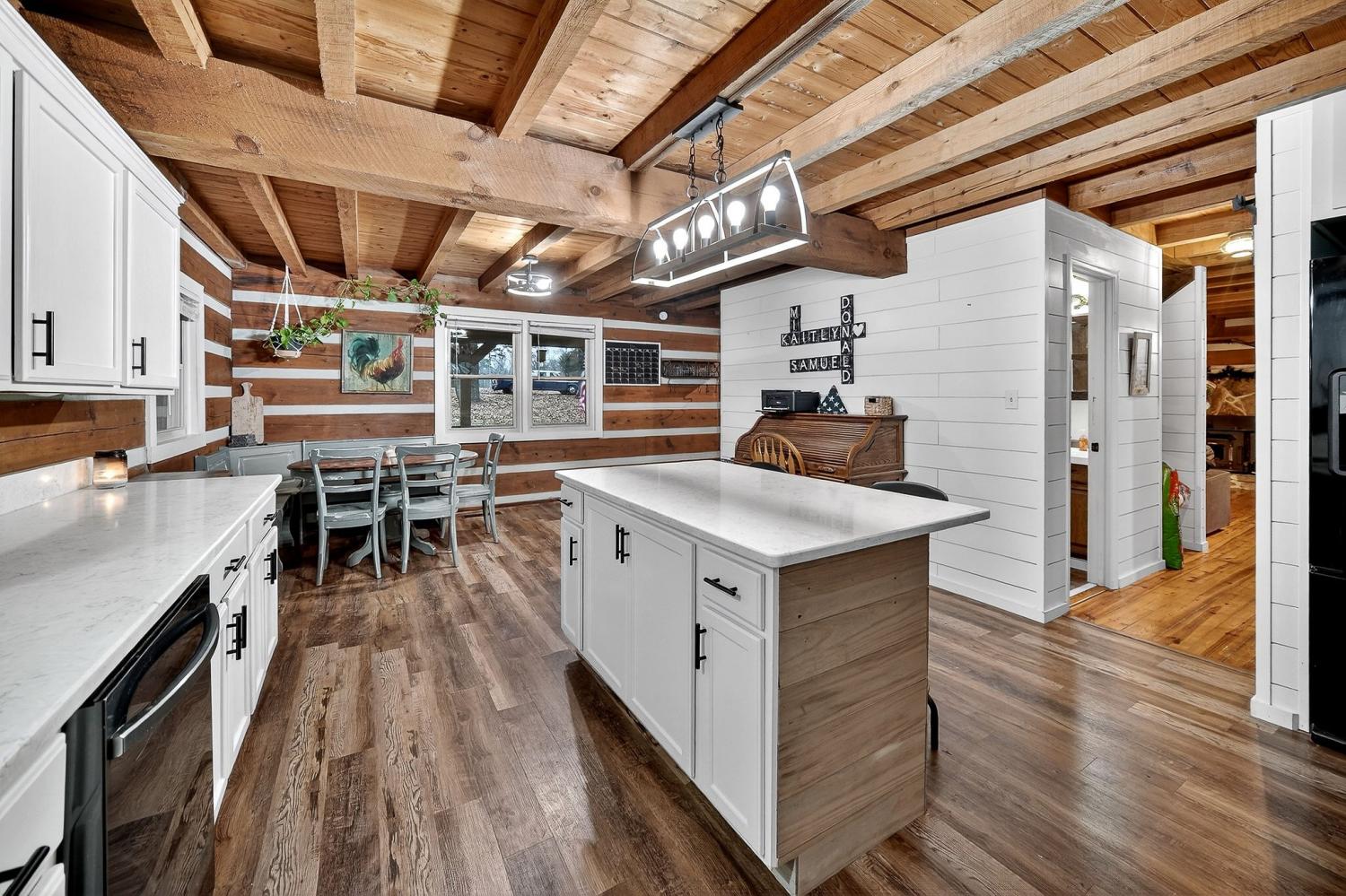Step into this rustic charm with this gorgeous 3 bedroom, 2 bath log home on 5 acres. Warm wood tones, an open concept living area, and wood burning fire place make it a great place to relax. Outside, enjoy the wide covered porch, perfecting for relaxing or entertaining. The property includes an impressive large detached garage, ideal for storage, hobbies, or a workshop. With ample space, privacy, and timeless log-home character, this property id perfect for those seeking country living. Behind the home there is a septic and utilities ran for another home to be added. Leaf guard installed. New grounding rods installed 2025.