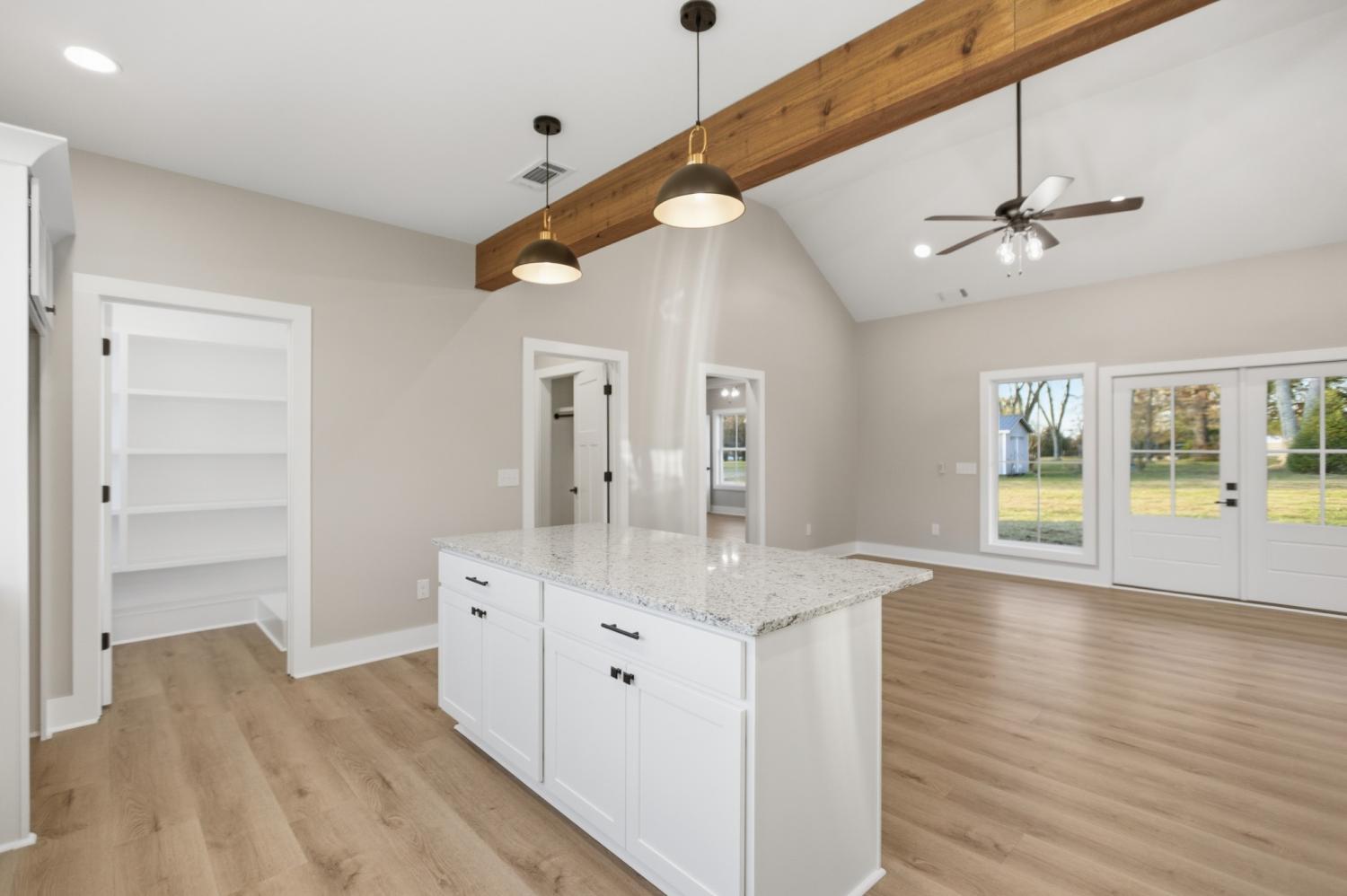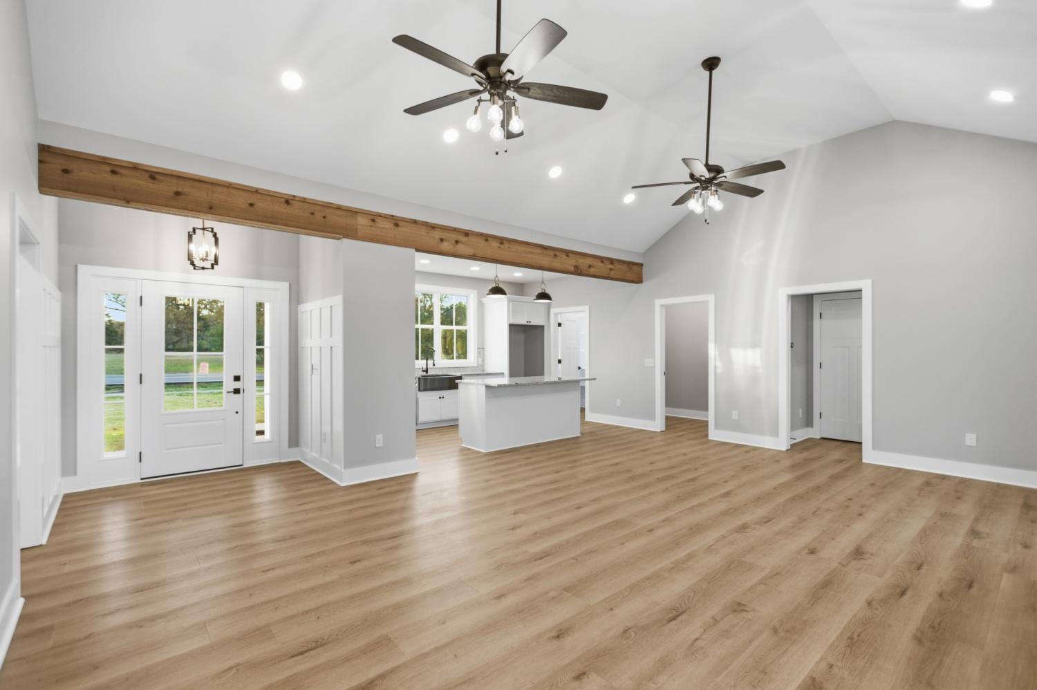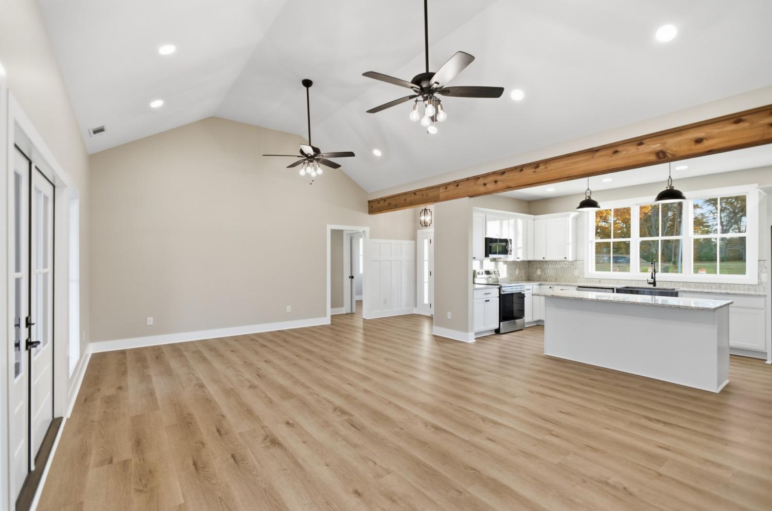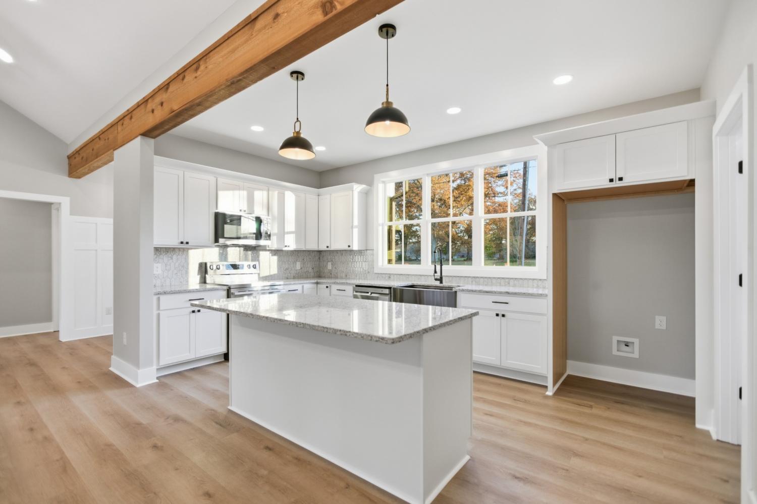 Welcome to this stunning newly constructed home where style, comfort, and quality come together seamlessly. Step inside the inviting entry foyer and be greeted by a beautiful judges-panel feature wall that sets the tone for the craftsmanship found throughout. This thoughtfully designed 3-bedroom, 2-bathroom home offers an open-concept layout with luxury vinyl plank flooring spanning the entire space. The spacious kitchen is a true centerpiece, complete with a large island, sleek granite countertops, and an oversized pantry. It flows effortlessly into the great room, highlighted by impressive vaulted ceilings, perfect for entertaining or everyday living. The split-bedroom floorplan ensures privacy, with the primary suite serving as a relaxing retreat. Enjoy a custom tile shower, double vanities, and a custom walk-in closet designed for maximum organization. Step outside to a covered patio, ideal for morning coffee or evening gatherings. This exceptional home blends modern finishes with functional design—don’t miss your opportunity to make 90 Kings Lane yours!