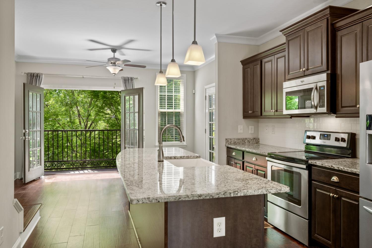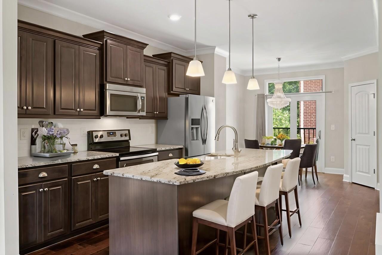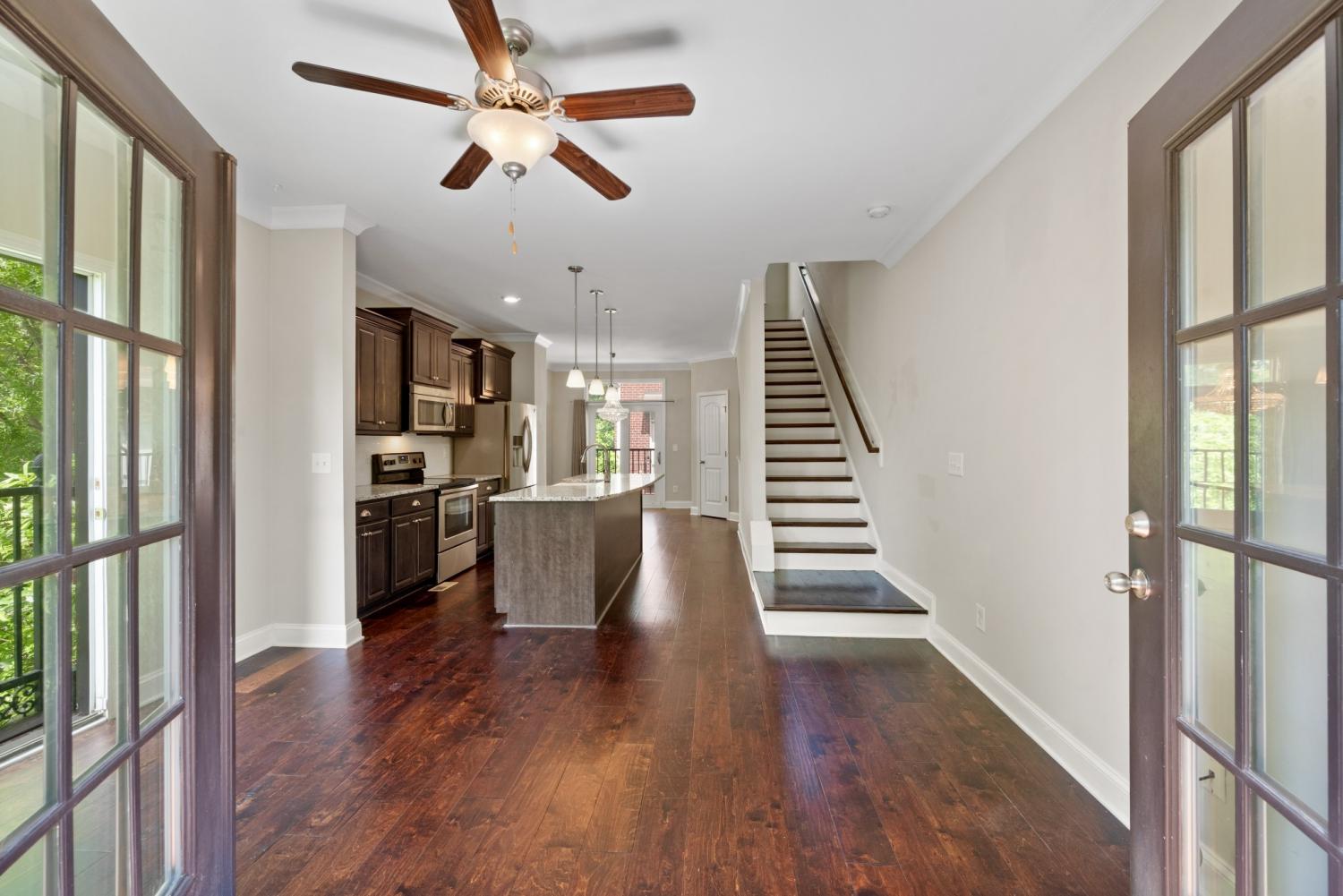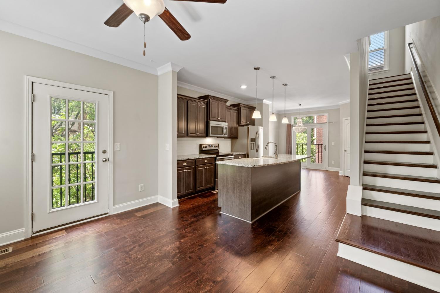 Modern Midtown living meets effortless charm in this quiet, corner-lot end unit just steps from Centennial Park. Sunlight fills the main level, where hardwood floors, classic trim, and an easy, open flow create a welcoming backdrop for both relaxing and entertaining. The kitchen serves as the heart of the home with granite countertops, stainless-steel appliances, rich cabinetry, and an oversized island that opens into the dining and living spaces. Multiple Juliet balconies throughout invite fresh air and offer peaceful views of mature trees, giving the home a calm, tucked-away feel despite its central location. The dining area is accented by a statement light fixture and large windows, while the spacious living room offers flexibility for your ideal layout. Upstairs, the private owner’s suite features its own balcony, a tray ceiling, a generous walk-in closet, and a spa-inspired bath with a double granite vanity and tiled shower with a built-in bench. A stylish powder room on the reception level adds convenience for guests, and the one-car garage — accessed via a charming paver-lined courtyard — brings everyday ease. Thoughtfully maintained landscaping surrounds the property and enhances its curb appeal. With trails, gardens, gathering spaces, and the iconic Parthenon just a short stroll away, Centennial Park truly feels like an extension of the neighborhood. This is a rare opportunity to enjoy comfort, walkability, and Nashville living at its most convenient.