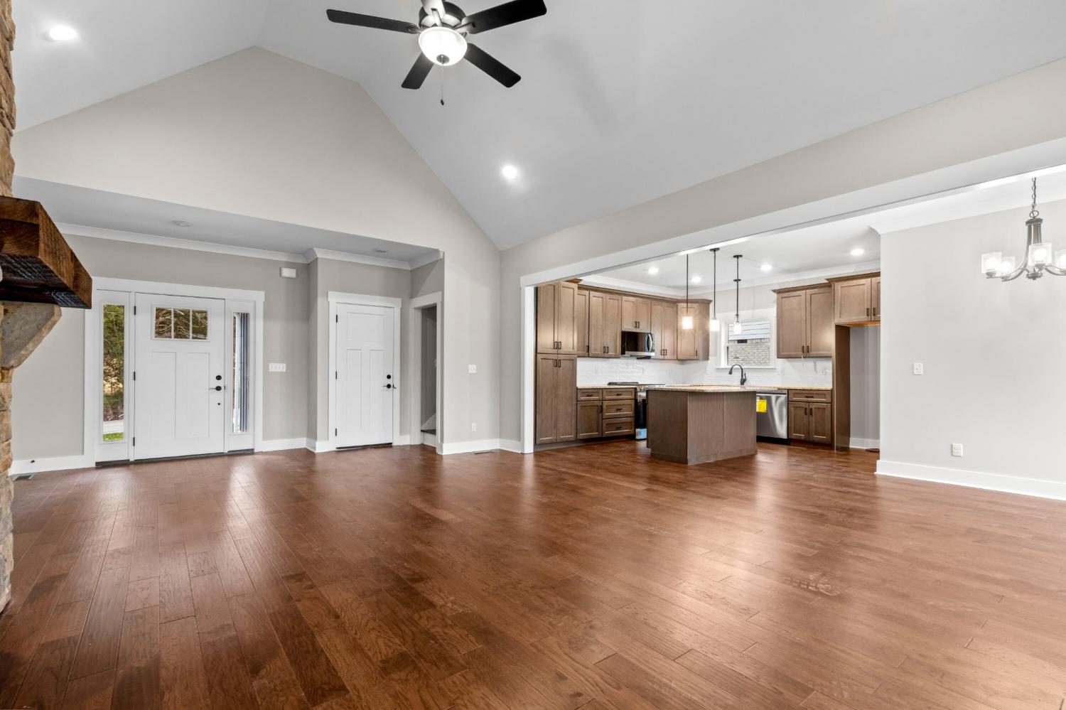 Welcome to 7395 Gamble Rd, a beautifully crafted 3-bedroom, 2-bath home with a versatile bonus loft offering additional living or work-from-home space. This inviting home features an open-concept layout where the dining area and kitchen overlook a stunning stone fireplace, creating the perfect setting for both everyday living and entertaining. Hardwood floors flow throughout, complementing the kitchen's stainless steel appliances and modern finishes, while large windows fill the space with natural light. Step through the living area to a covered back porch with warm hardwood ceilings, ideal for enjoying peaceful views of the spacious backyard and relaxing outdoors in any season. The expansive yard offers plenty of room for gardening, play, or future enhancements, making it a wonderful option for those seeking space and privacy. The primary suite offers a true retreat with vaulted ceilings, a walk-in shower, double vanity, and a generous walk-in closet. The bonus loft adds flexibility for a media room, home office, or guest overflow, enhancing the home's overall functionality. Two additional bedrooms share a well-appointed bathroom, while the laundry room provides extra convenience with built-in shelving and a sink. Sitting on just under an acre, the property provides the perfect blend of open space and manageable upkeep. The two-car attached garage offers both parking and additional storage for tools, equipment, or recreational gear. Located just 30 minutes from Chattanooga, Cleveland, and Ooltewah, this home provides easy access to shopping, dining, and major commuter routes while maintaining a peaceful rural feel. Its thoughtful layout and attention to detail make it well-suited for families, professionals, or anyone looking for comfort and convenience in a beautiful country setting.