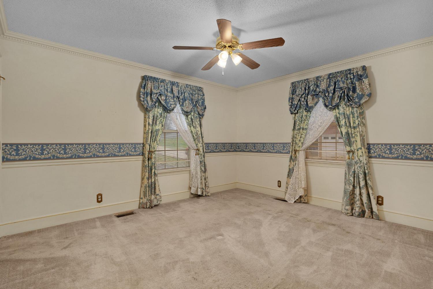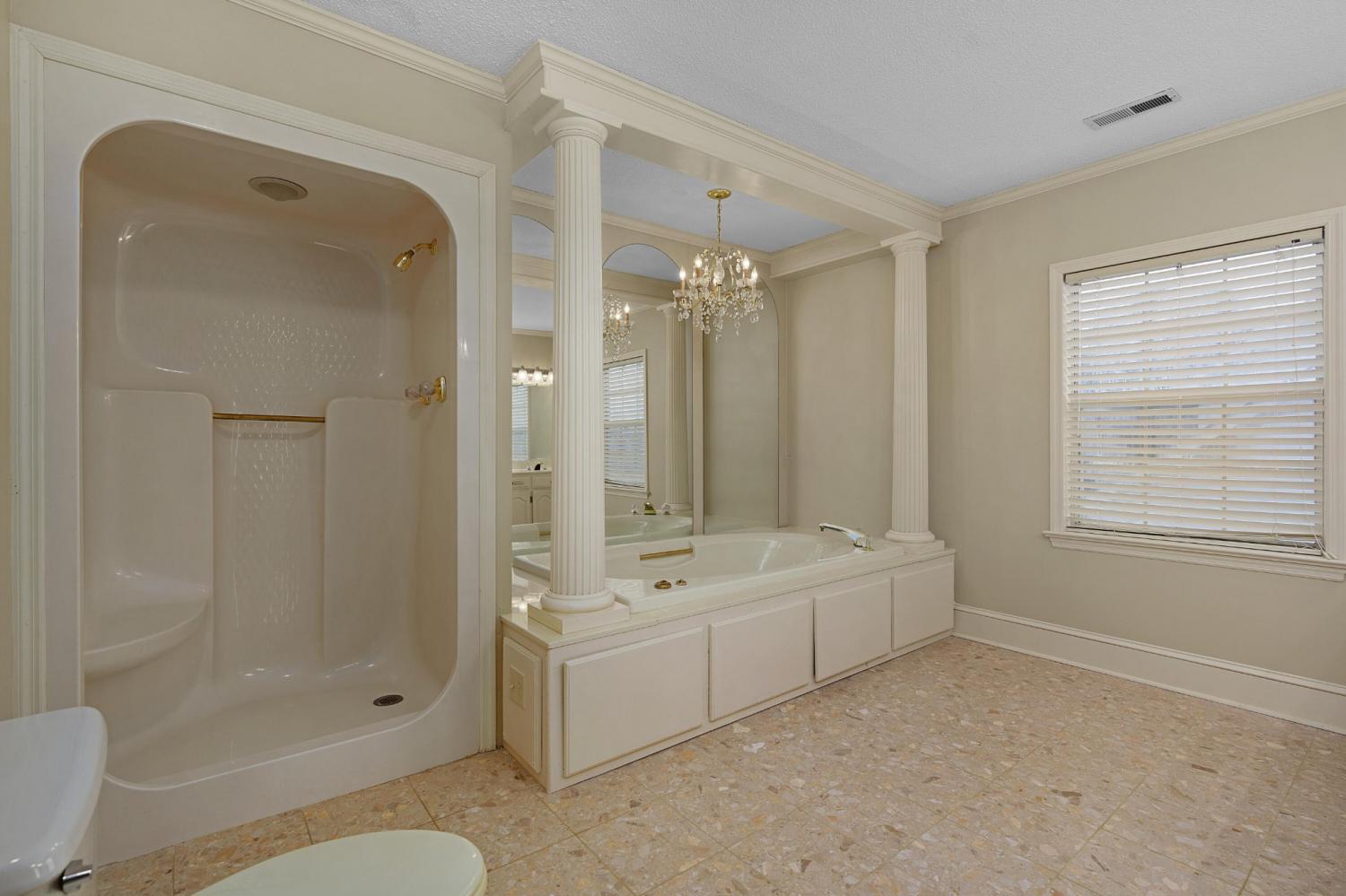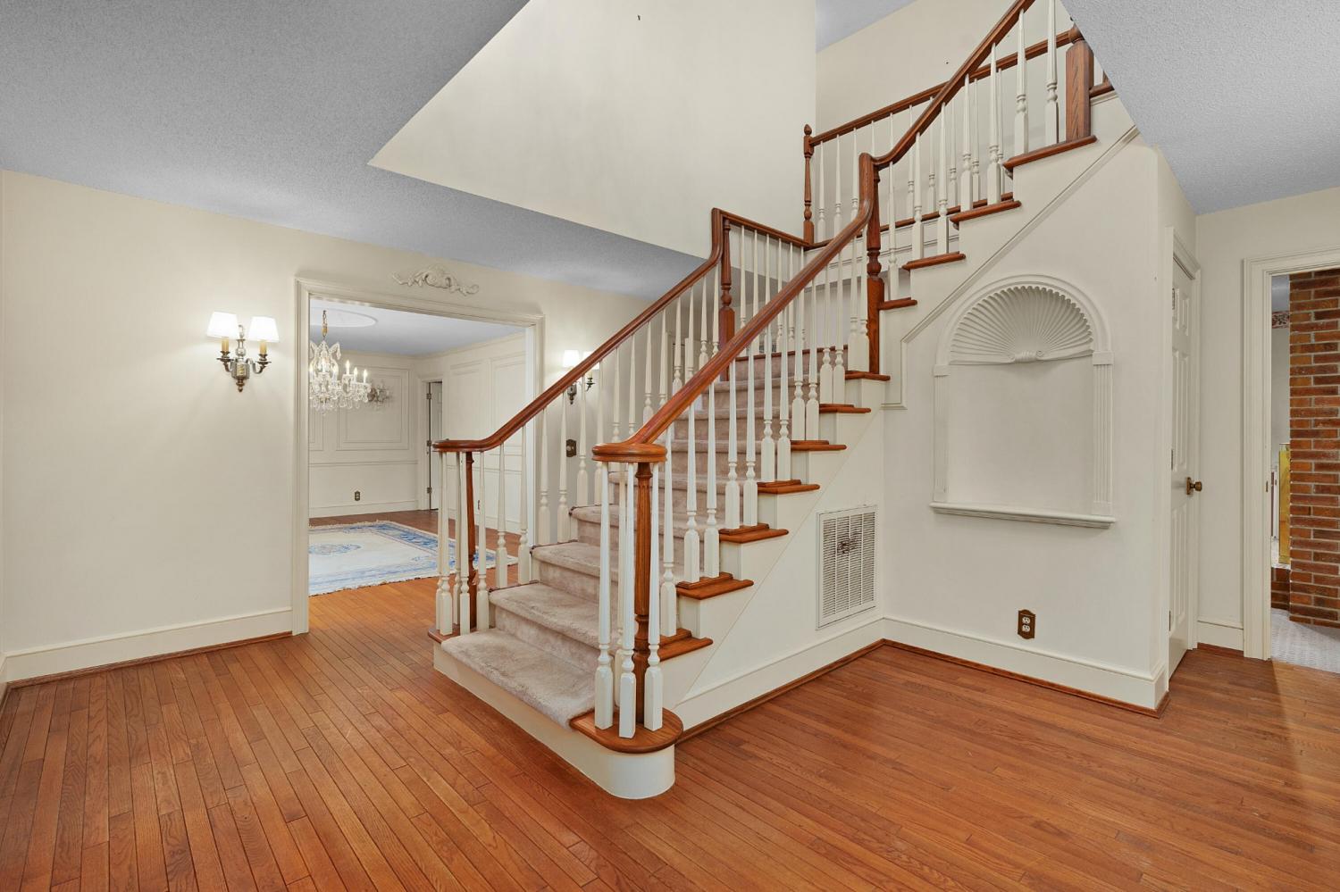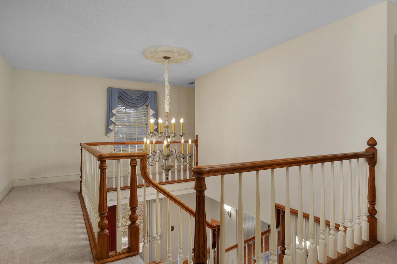 5 bedroom, 4.5 bath home on a 4.6 +/- acre lot in the established Heron Bay neighborhood in the heart of Ooltewah close to schools, shopping, restaurants, the lake and Hwy 58. This one-owner home boasts a versatile floor plan with 2 bedrooms on the main level, including an in-law suite, both formal and informal living spaces, spacious rooms, closets galore, great natural lighting, recessed and decorative lighting, walk-out and walk-up attics, plus an unfinished basement for even more storage or expansion possibilities. Your tour of the main level begins with entry to the dedicated foyer with hardwood flooring, central staircase with dramatic chandelier and enlarged doorways to the living room on the right and the dining room on the left. A central den with a gas fireplace has sliding glass doors to the rear patio and access to an en-suite bedroom and the sunny kitchen. The eat-in kitchen has great counter and cabinet space, black and stainless appliances, and access to the rear 2nd staircase, patio and the side hall leading to the butler's pantry, laundry room, powder room, garage and the in-law suite. The in-law suite has a living room, a bedroom with a walk-in closet and a private bath. Head upstairs where you will find the primary bedroom which has a trey ceiling, crystal chandelier, a walk-in closet, and the primary bath with a dual vanity, jetted tub with crystal chandelier and a separate shower. A study or office is just steps away, and there are also 2 additional bedrooms, another full bath and great storage on this level. The basement was partially finished at one point and there is a large room with a fireplace and sliding glass doors to a patio area that would make a great family or rec room, plus another area that would make a great workshop. Most of the acreage is cleared in back, so there is plenty of room for outdoor fun or your furry friends.