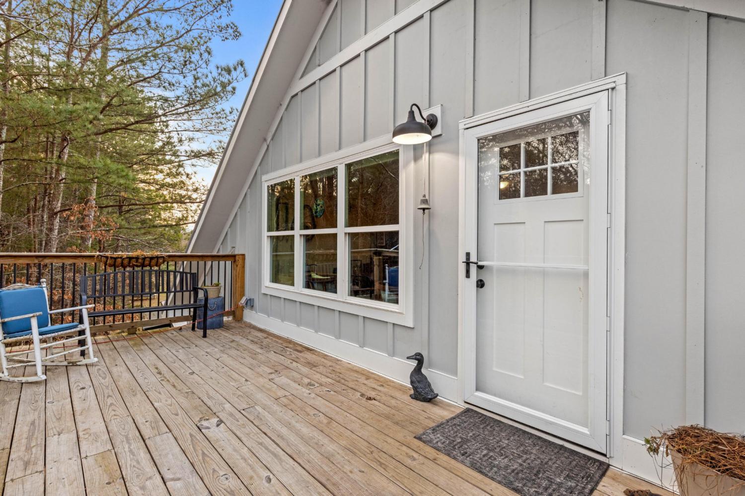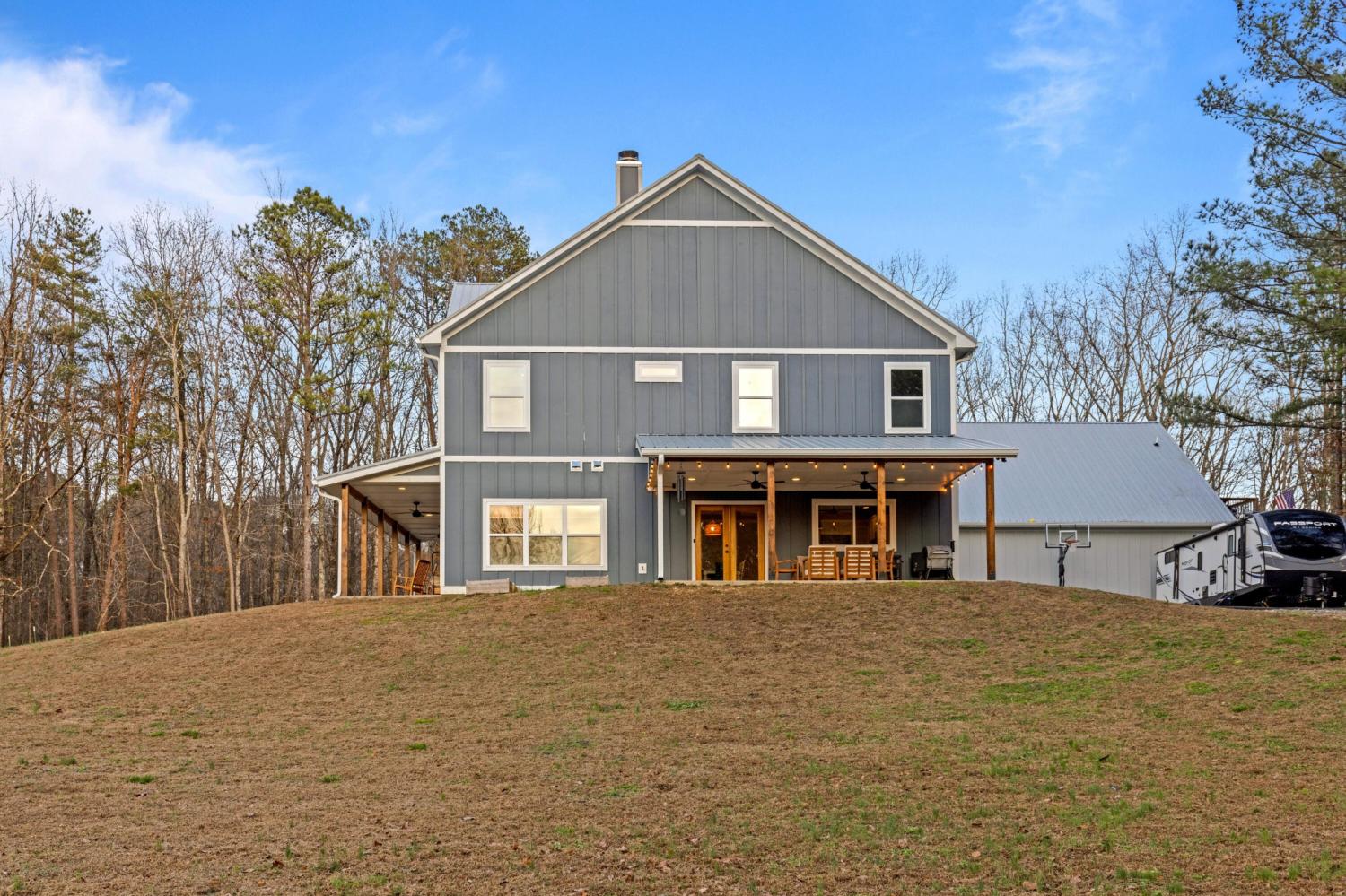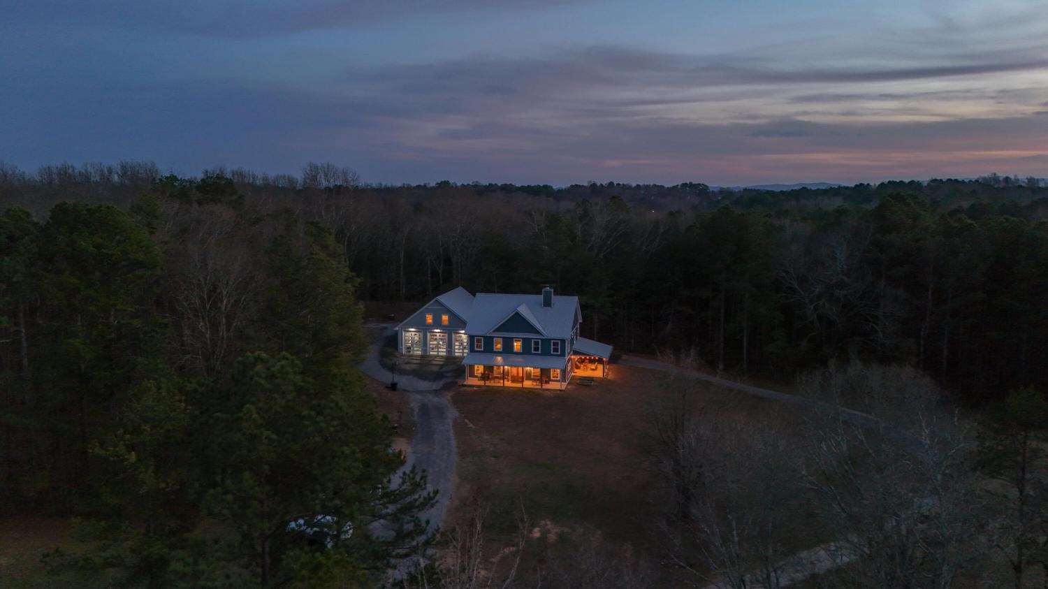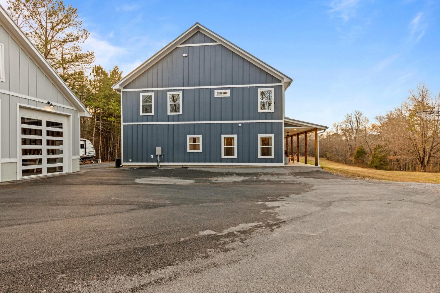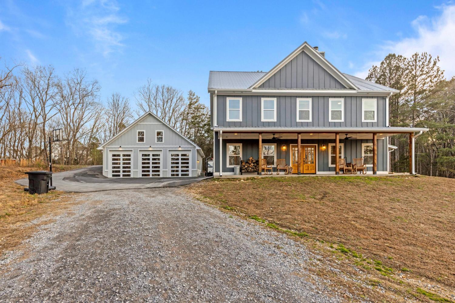 Set on nearly 5.5 acres of flat, usable land in Chickamauga, this custom semi-barndominium style home offers the perfect blend of thoughtful design, flexibility, and long-lasting quality in a peaceful rural setting with convenient access to everyday amenities. The land is enhanced by a young orchard featuring approximately six-year-old apple, peach, pear, plum, and mulberry trees, along with thornless blackberry and blueberry bushes, adding both charm and future harvest potential to the property. Open main-level living areas showcase quality finishes and a striking double-sided fireplace that anchors the living room and flows seamlessly into the kitchen, creating a warm and inviting space for everyday living and entertaining. A functional mudroom, a laundry room on each level of the home, and a spacious primary suite on the main floor add ease and comfort to daily life. The primary suite is designed as a true retreat, featuring a double vanity, walk-in closet with built-in storage, and a luxurious walk-in double shower with seating. Upstairs, a second living space provides flexibility for a media room, play area, or home office. The main home offers five bedrooms, four and a half baths, and approximately 3,360 square feet of well-planned living space, all under a durable metal roof for low-maintenance, long-term peace of mind. Adding exceptional versatility, the three-bay shop-style garage features 10-foot doors on each bay, built two cars deep, along with a convenient half bath. Above the garage is a separate 640-square-foot living suite complete with one bedroom, one bath, a full kitchen, laundry, living area, and a connected deck. With a private entrance and dedicated parking, this space is ideal for guests, multigenerational living, or rental income. The level acreage offers ample room for recreation or future structures, making this property a rare opportunity to enjoy space, function, and flexibility in a beautiful rural setting.