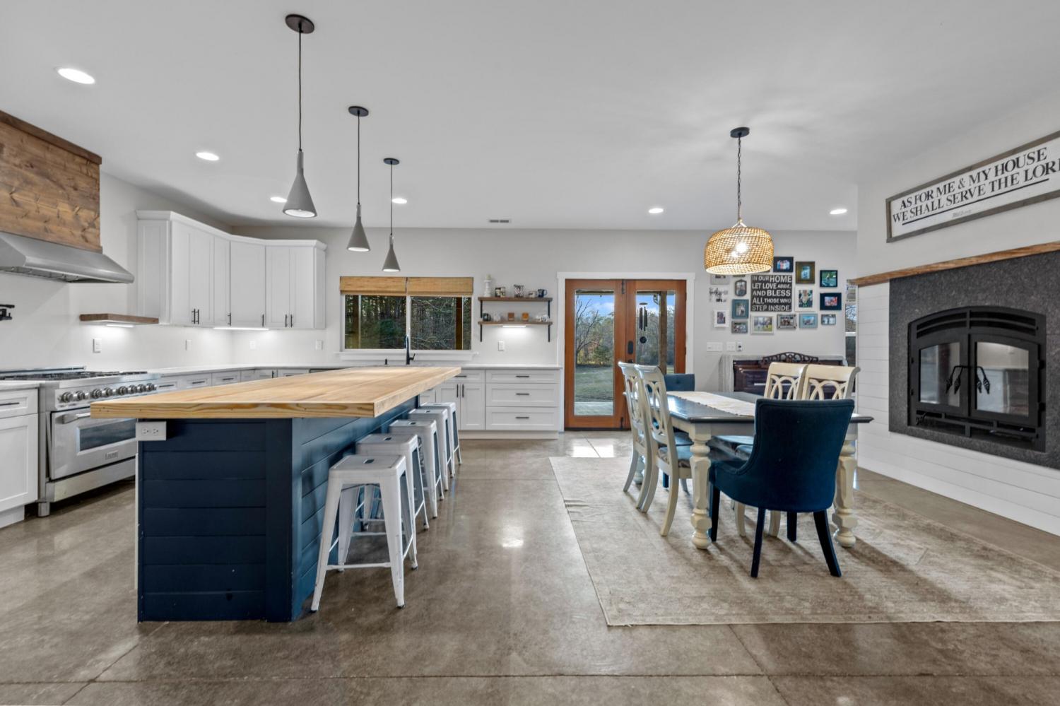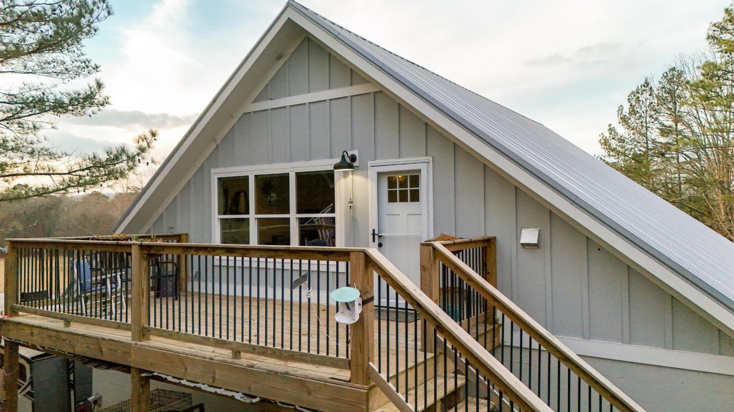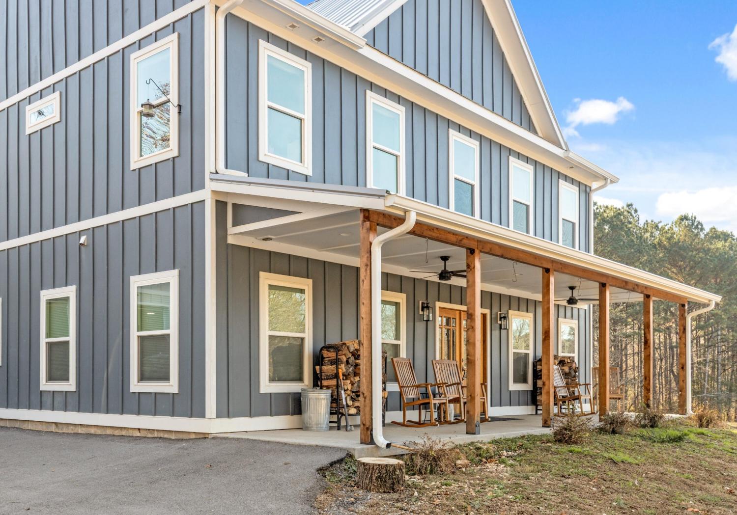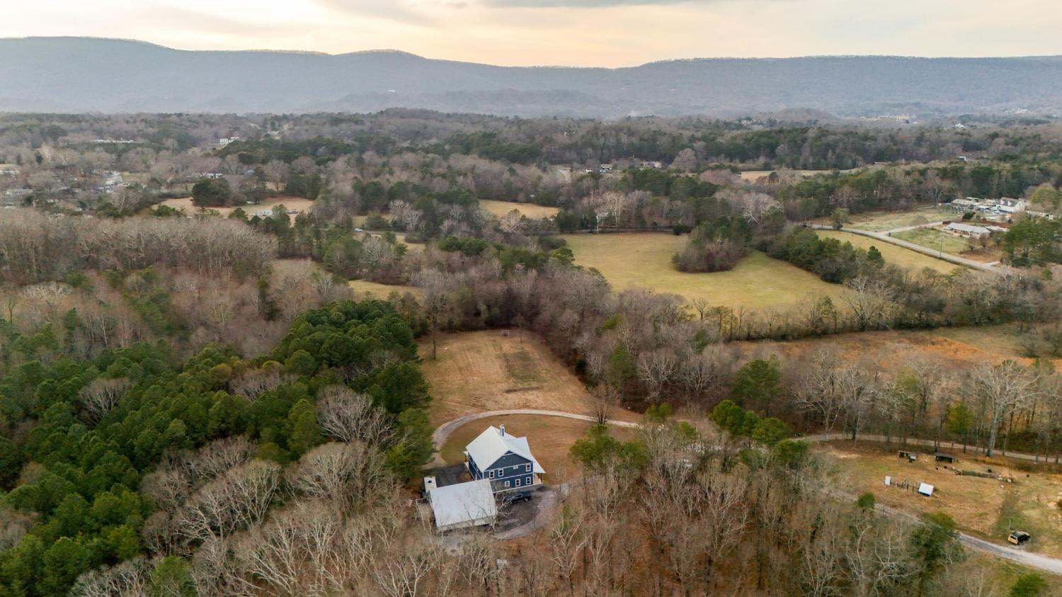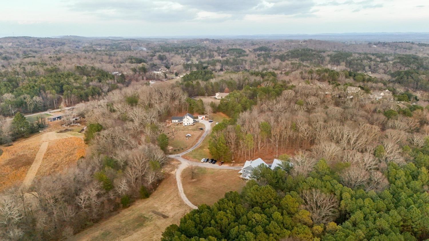 Set on nearly 5.5 acres of flat, usable land in Chickamauga, this custom semi-barndominium style home offers the perfect blend of thoughtful design, flexibility, and long-lasting quality in a peaceful rural setting with convenient access to everyday amenities. The land is enhanced by a young orchard featuring approximately six-year-old apple, peach, pear, plum, and mulberry trees, along with thornless blackberry and blueberry bushes, adding both charm and future harvest potential to the property. Open main-level living areas showcase quality finishes and a striking double-sided fireplace that anchors the living room and flows seamlessly into the kitchen, creating a warm and inviting space for everyday living and entertaining. A functional mudroom, a laundry room on each level of the home, and a spacious primary suite on the main floor add ease and comfort to daily life. The primary suite is designed as a true retreat, featuring a double vanity, walk-in closet with built-in storage, and a luxurious walk-in double shower with seating. Upstairs, a second living space provides flexibility for a media room, play area, or home office. The main home offers five bedrooms, four and a half baths, and approximately 3,360 square feet of well-planned living space, all under a durable metal roof for low-maintenance, long-term peace of mind. Adding exceptional versatility, the three-bay shop-style garage features 10-foot doors on each bay, built two cars deep, along with a convenient half bath. Above the garage is a separate 640-square-foot living suite complete with one bedroom, one bath, a full kitchen, laundry, living area, and a connected deck. With a private entrance and dedicated parking, this space is ideal for guests, multigenerational living, or rental income. The level acreage offers ample room for recreation or future structures, making this property a rare opportunity to enjoy space, function, and flexibility in a beautiful rural setting.