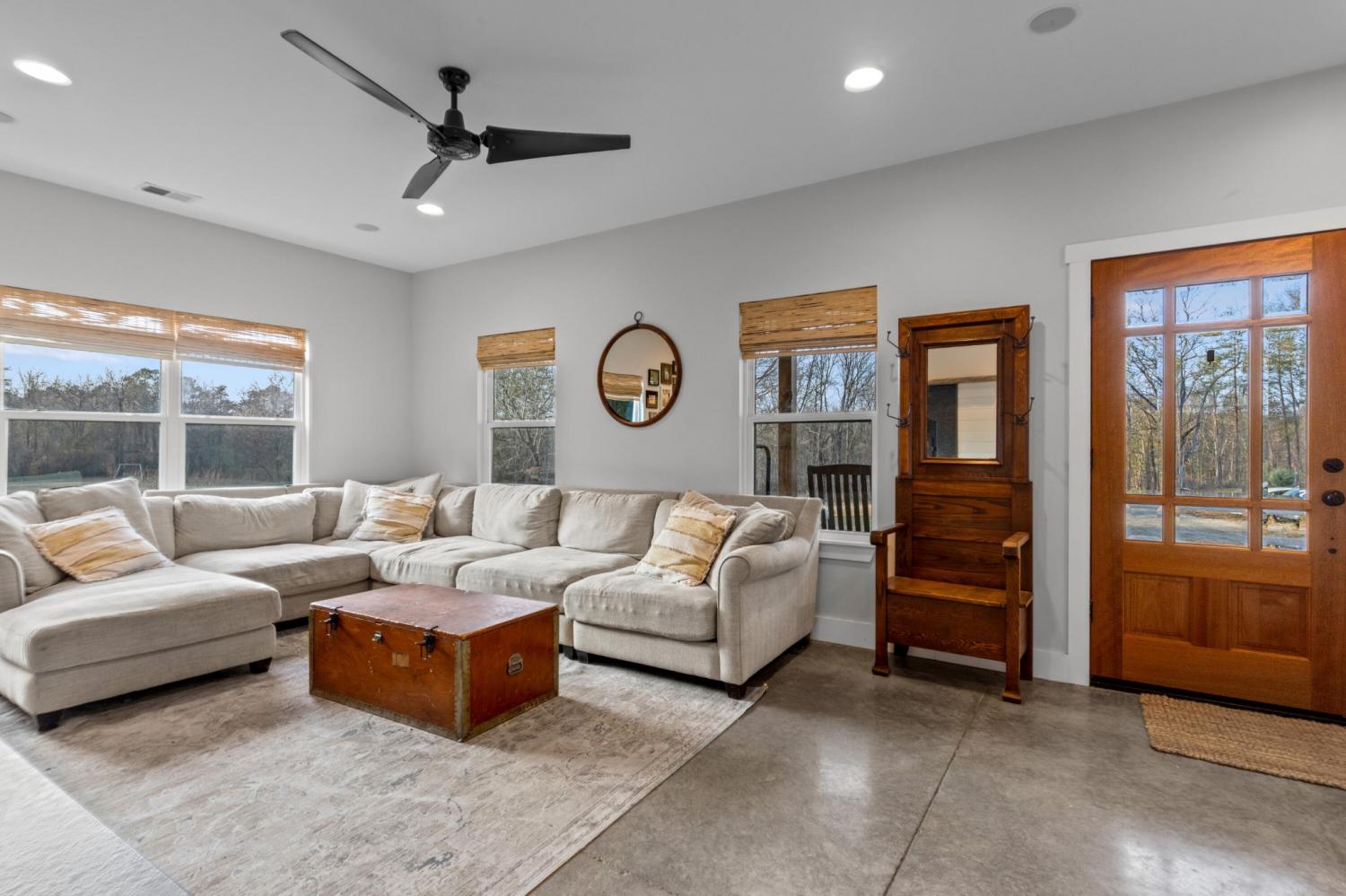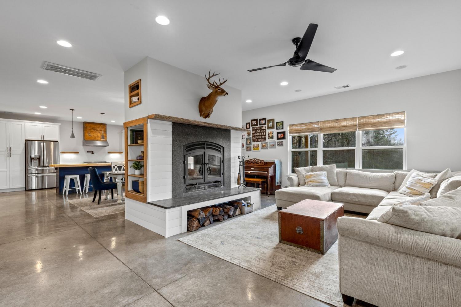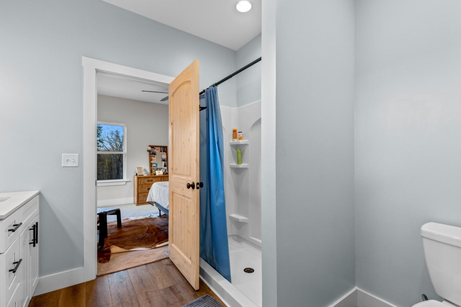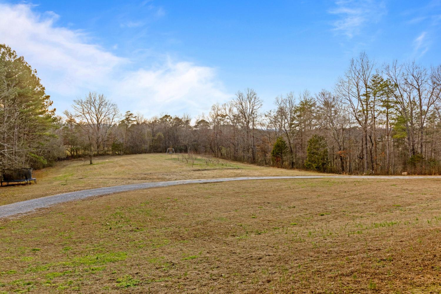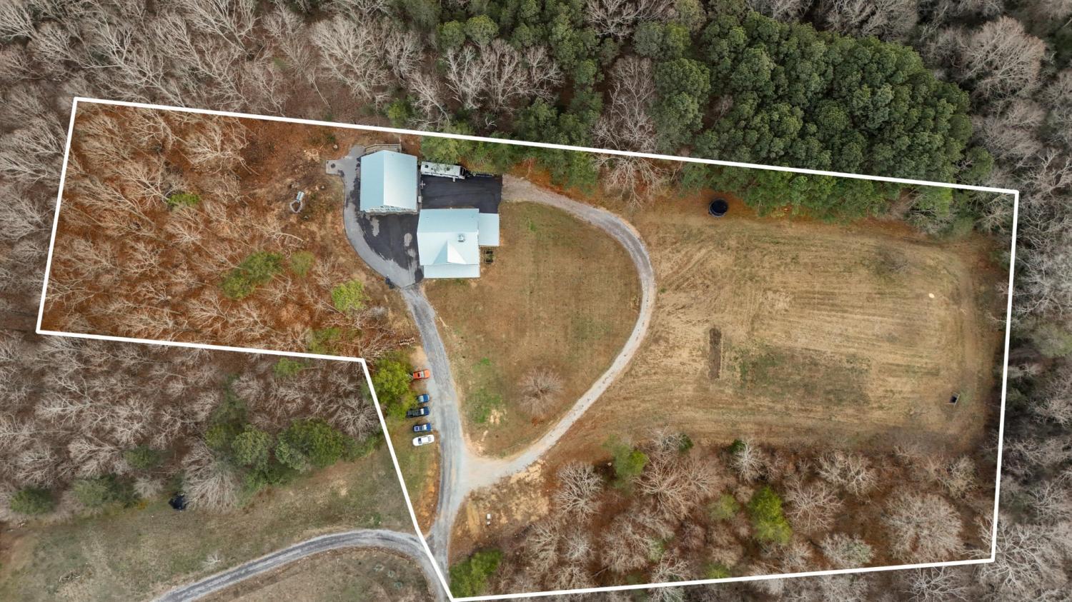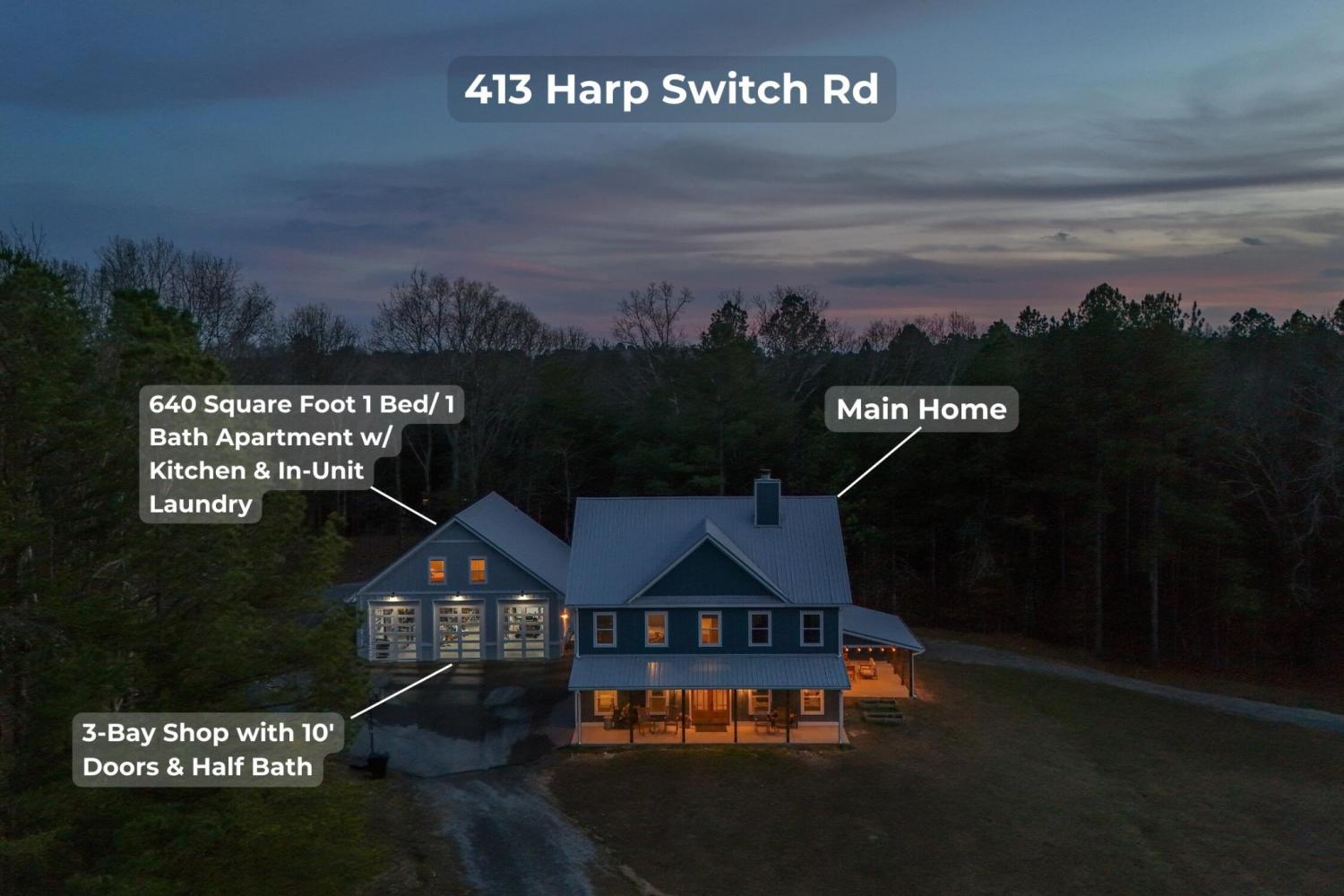 Set on nearly 5.5 acres of flat, usable land in Chickamauga, this custom semi-barndominium style home offers the perfect blend of thoughtful design, flexibility, and long-lasting quality in a peaceful rural setting with convenient access to everyday amenities. The land is enhanced by a young orchard featuring approximately six-year-old apple, peach, pear, plum, and mulberry trees, along with thornless blackberry and blueberry bushes, adding both charm and future harvest potential to the property. Open main-level living areas showcase quality finishes and a striking double-sided fireplace that anchors the living room and flows seamlessly into the kitchen, creating a warm and inviting space for everyday living and entertaining. A functional mudroom, a laundry room on each level of the home, and a spacious primary suite on the main floor add ease and comfort to daily life. The primary suite is designed as a true retreat, featuring a double vanity, walk-in closet with built-in storage, and a luxurious walk-in double shower with seating. Upstairs, a second living space provides flexibility for a media room, play area, or home office. The main home offers five bedrooms, four and a half baths, and approximately 3,360 square feet of well-planned living space, all under a durable metal roof for low-maintenance, long-term peace of mind. Adding exceptional versatility, the three-bay shop-style garage features 10-foot doors on each bay, built two cars deep, along with a convenient half bath. Above the garage is a separate 640-square-foot living suite complete with one bedroom, one bath, a full kitchen, laundry, living area, and a connected deck. With a private entrance and dedicated parking, this space is ideal for guests, multigenerational living, or rental income. The level acreage offers ample room for recreation or future structures, making this property a rare opportunity to enjoy space, function, and flexibility in a beautiful rural setting.
