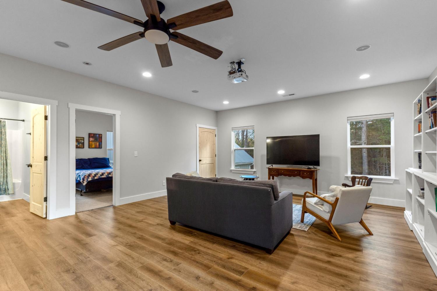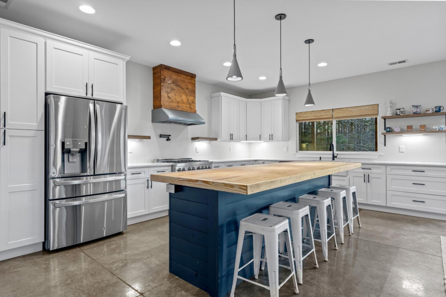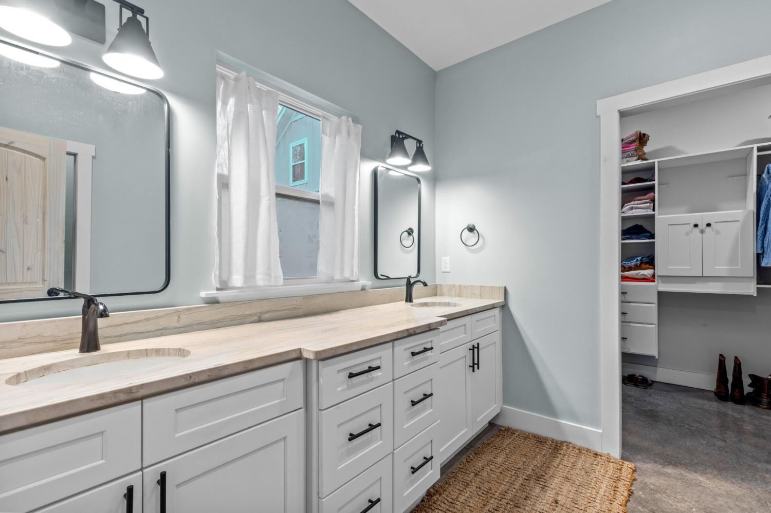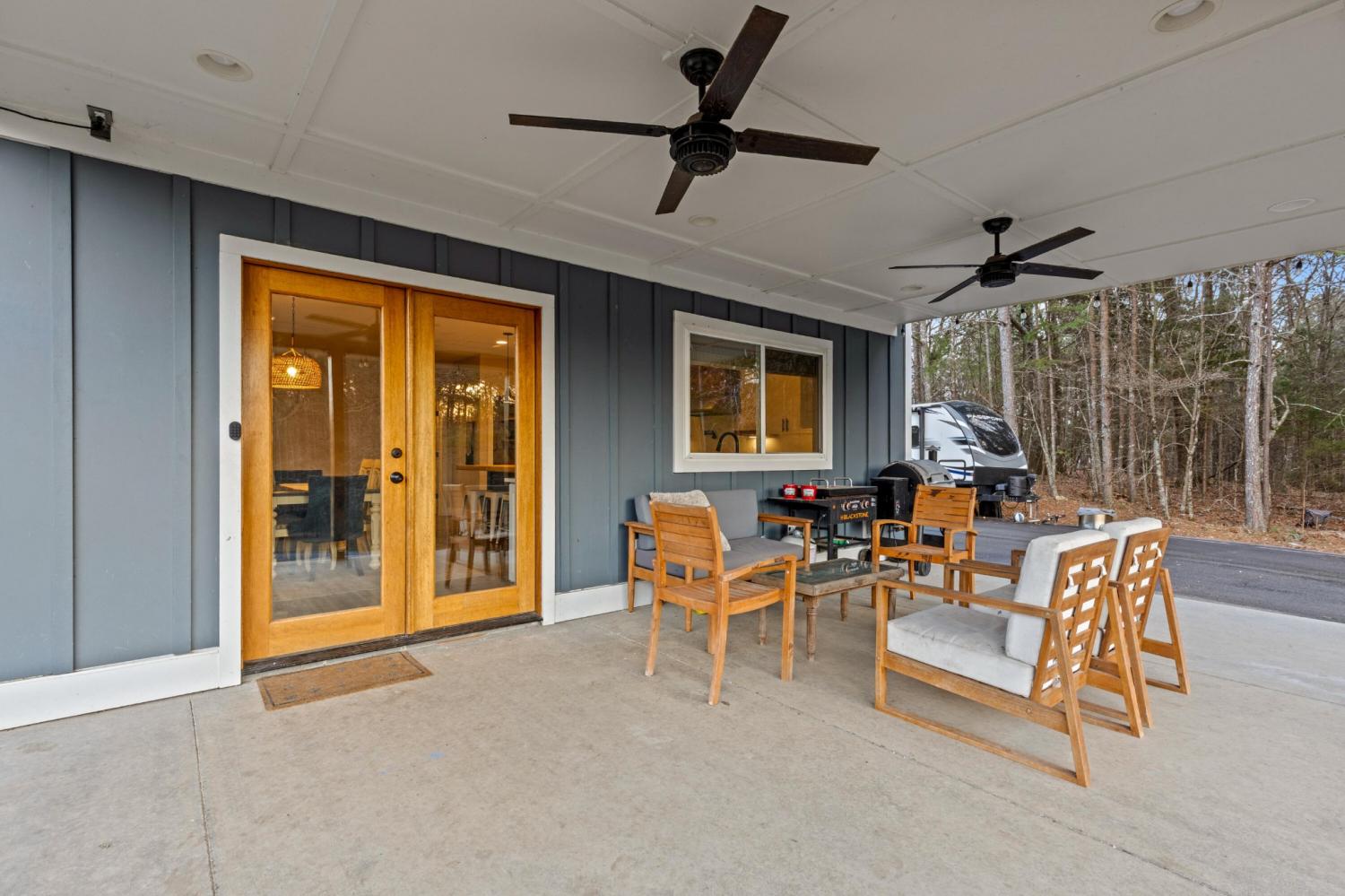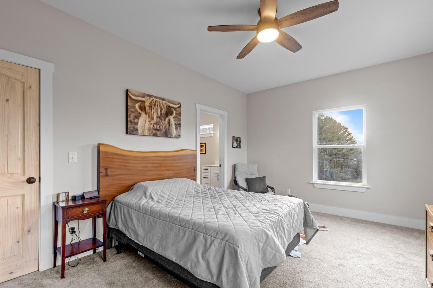 Set on nearly 5.5 acres of flat, usable land in Chickamauga, this custom semi-barndominium style home offers the perfect blend of thoughtful design, flexibility, and long-lasting quality in a peaceful rural setting with convenient access to everyday amenities. The land is enhanced by a young orchard featuring approximately six-year-old apple, peach, pear, plum, and mulberry trees, along with thornless blackberry and blueberry bushes, adding both charm and future harvest potential to the property. Open main-level living areas showcase quality finishes and a striking double-sided fireplace that anchors the living room and flows seamlessly into the kitchen, creating a warm and inviting space for everyday living and entertaining. A functional mudroom, a laundry room on each level of the home, and a spacious primary suite on the main floor add ease and comfort to daily life. The primary suite is designed as a true retreat, featuring a double vanity, walk-in closet with built-in storage, and a luxurious walk-in double shower with seating. Upstairs, a second living space provides flexibility for a media room, play area, or home office. The main home offers five bedrooms, four and a half baths, and approximately 3,360 square feet of well-planned living space, all under a durable metal roof for low-maintenance, long-term peace of mind. Adding exceptional versatility, the three-bay shop-style garage features 10-foot doors on each bay, built two cars deep, along with a convenient half bath. Above the garage is a separate 640-square-foot living suite complete with one bedroom, one bath, a full kitchen, laundry, living area, and a connected deck. With a private entrance and dedicated parking, this space is ideal for guests, multigenerational living, or rental income. The level acreage offers ample room for recreation or future structures, making this property a rare opportunity to enjoy space, function, and flexibility in a beautiful rural setting.