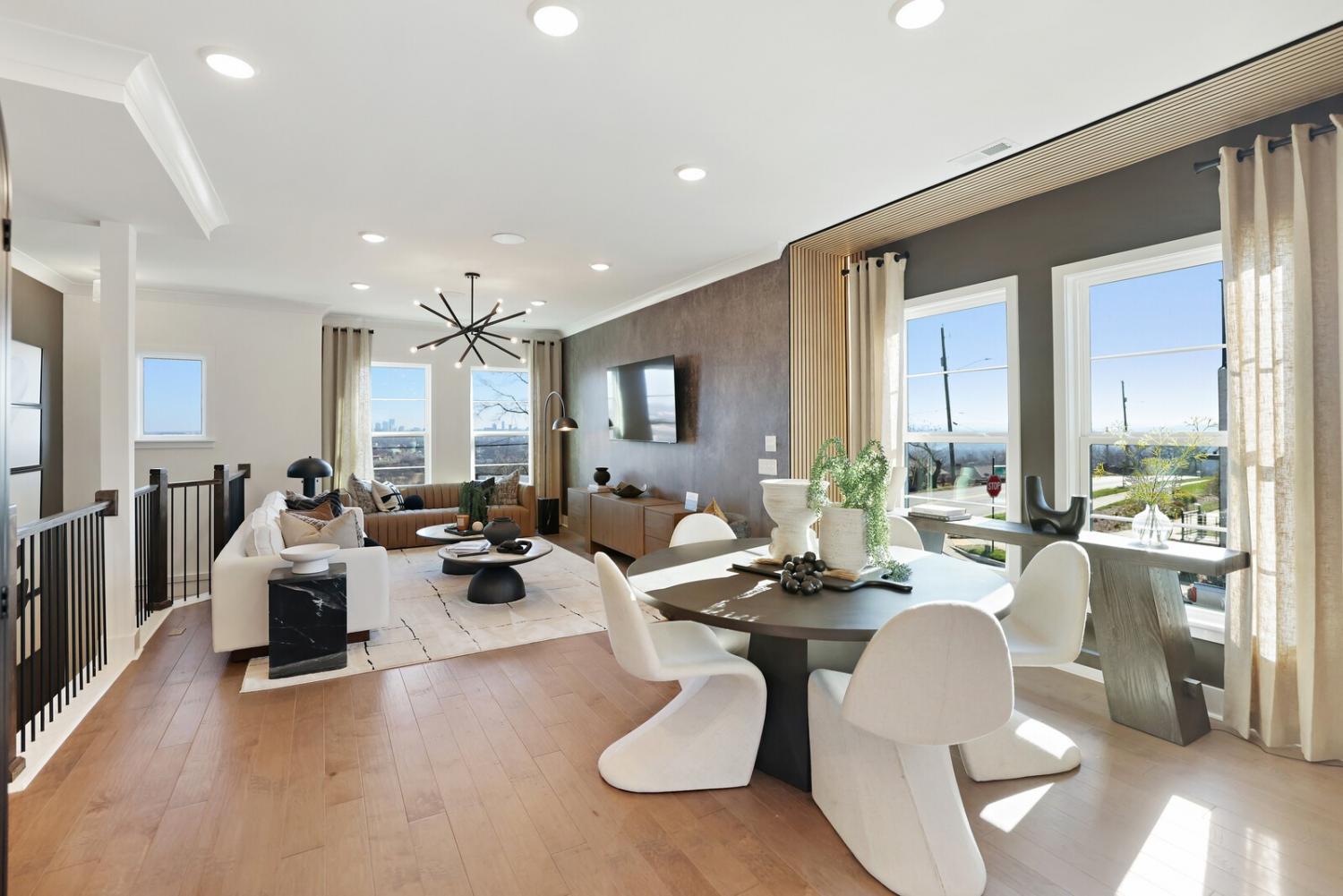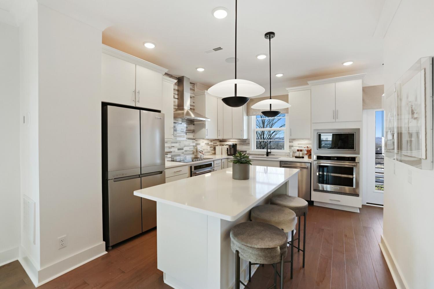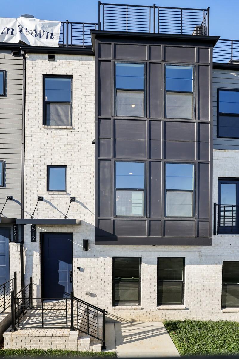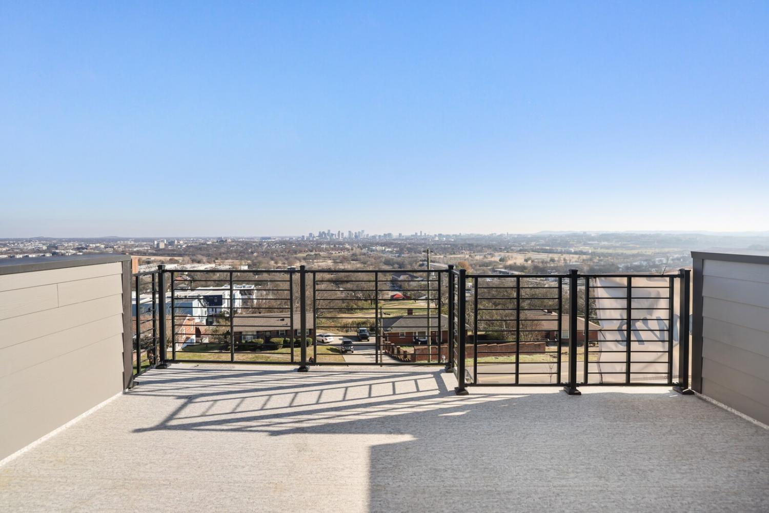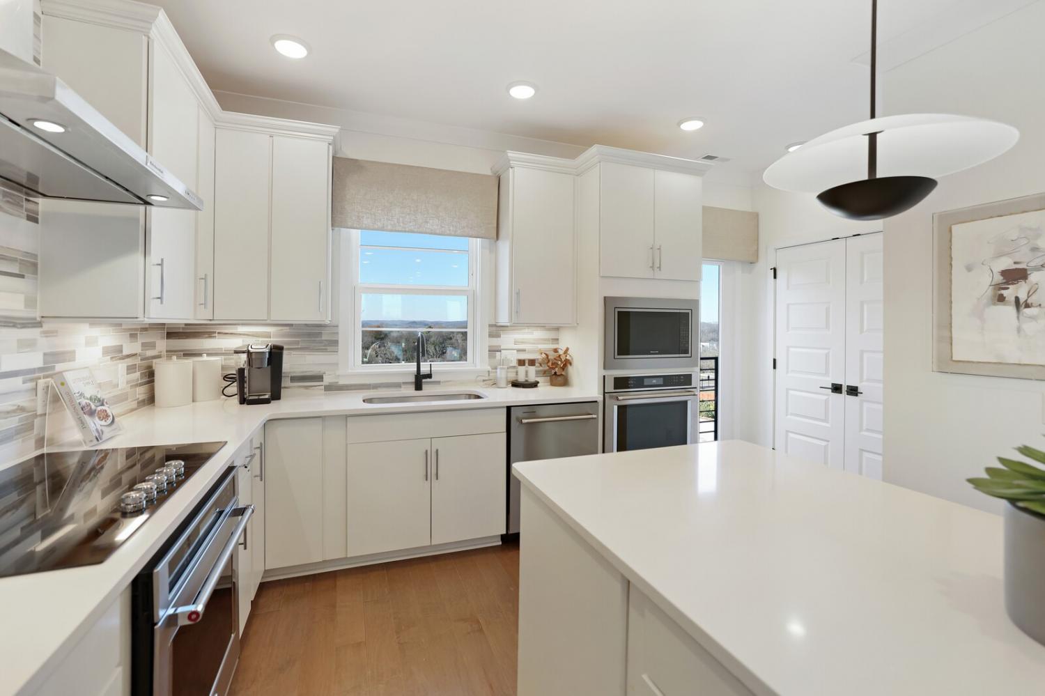 Welcome to this stunning Terravista floorplan, offering 2 bedrooms, 2.5 bathrooms, and 1,624 sq ft of beautifully designed modern living. Thoughtfully crafted with style and functionality in mind, this home features a tandem 2-car garage with extra storage, luxury vinyl plank flooring throughout, and modern matte black fixtures that elevate every room. Step into the open-concept living area, where natural light pours across the space and highlights the striking white-and-black palette with wood panel accents, a true modern designer moment. The eat-in dining area sits surrounded by windows, creating a bright and inviting spot for meals or morning coffee. The gourmet kitchen is a showstopper with quartz countertops, a spacious island, stainless steel appliances, stylish tile backsplash, and additional café cabinetry for extra storage. Upstairs, both bedrooms offer en-suite bathrooms, each featuring a frameless glass shower and contemporary finishes. The laundry is conveniently located on the same level as the bedrooms, making everyday living even easier. Enjoy unforgettable evenings and sweeping views of Music City from your private rooftop terrace, the perfect spot for relaxing or entertaining. Situated in a private location with accessible parking, this home also provides easy access to the community nature trail, ideal for morning walks or weekend strolls. With thoughtful upgrades, beautiful finishes, and a rooftop retreat, this home delivers elevated modern living just minutes from the best of Nashville. Up to 1% lender credit on the loan amount when buyer uses Seller's Preferred Lender.