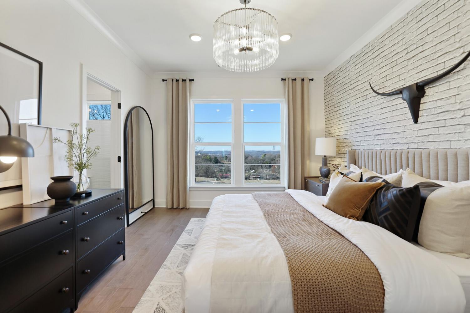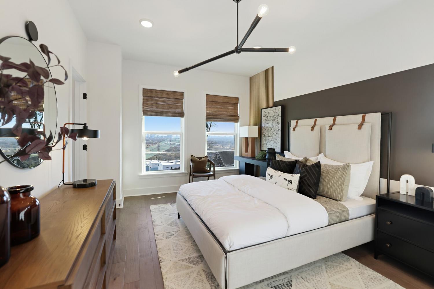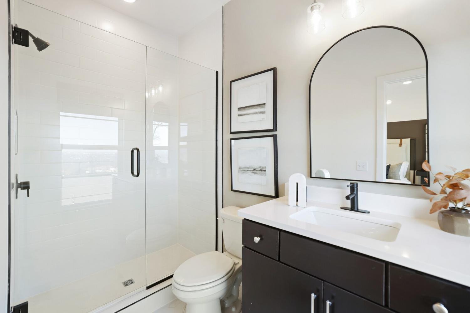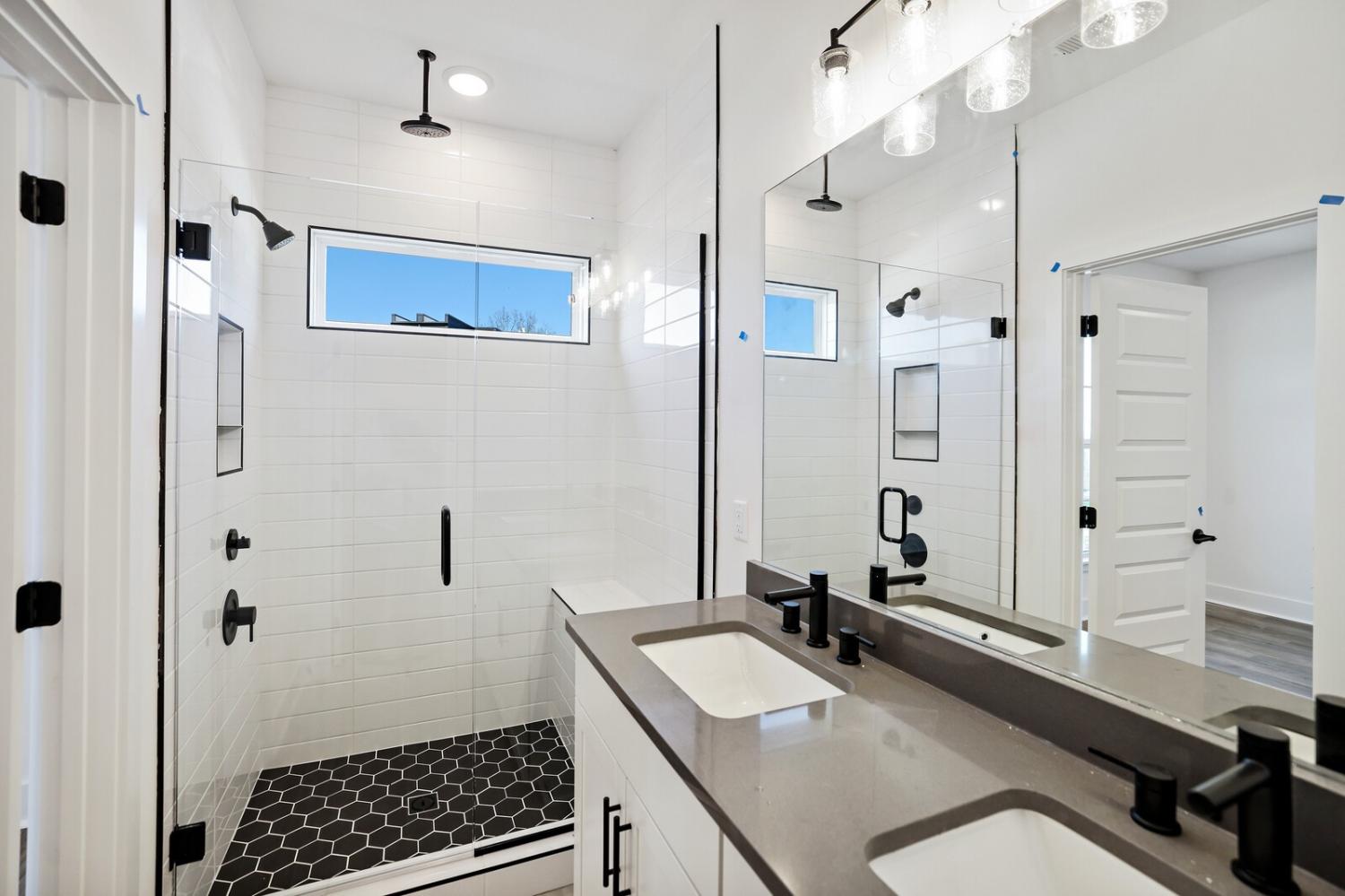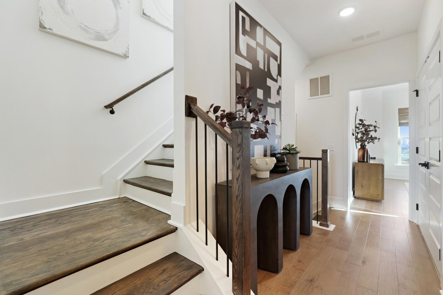 Welcome to this stunning Terravista floorplan, offering 2 bedrooms, 2.5 bathrooms, and 1,624 sq ft of beautifully designed modern living. Thoughtfully crafted with style and functionality in mind, this home features a tandem 2-car garage with extra storage, luxury vinyl plank flooring throughout, and modern matte black fixtures that elevate every room. Step into the open-concept living area, where natural light pours across the space and highlights the striking white-and-black palette with wood panel accents, a true modern designer moment. The eat-in dining area sits surrounded by windows, creating a bright and inviting spot for meals or morning coffee. The gourmet kitchen is a showstopper with quartz countertops, a spacious island, stainless steel appliances, stylish tile backsplash, and additional café cabinetry for extra storage. Upstairs, both bedrooms offer en-suite bathrooms, each featuring a frameless glass shower and contemporary finishes. The laundry is conveniently located on the same level as the bedrooms, making everyday living even easier. Enjoy unforgettable evenings and sweeping views of Music City from your private rooftop terrace, the perfect spot for relaxing or entertaining. Situated in a private location with accessible parking, this home also provides easy access to the community nature trail, ideal for morning walks or weekend strolls. With thoughtful upgrades, beautiful finishes, and a rooftop retreat, this home delivers elevated modern living just minutes from the best of Nashville. Up to 1% lender credit on the loan amount when buyer uses Seller's Preferred Lender.