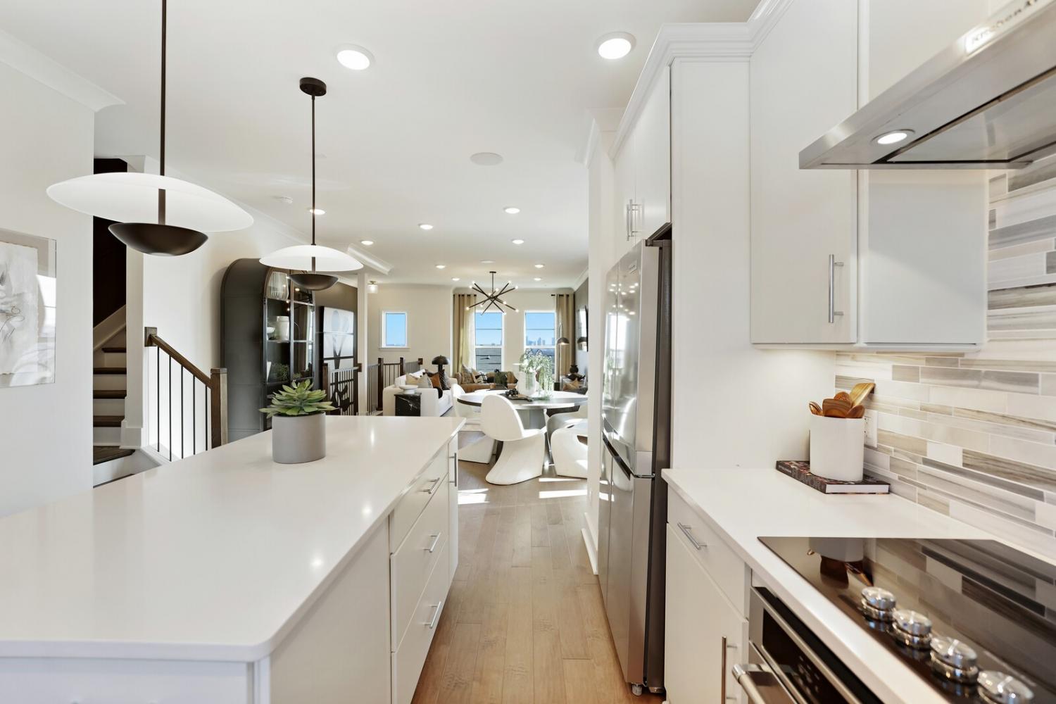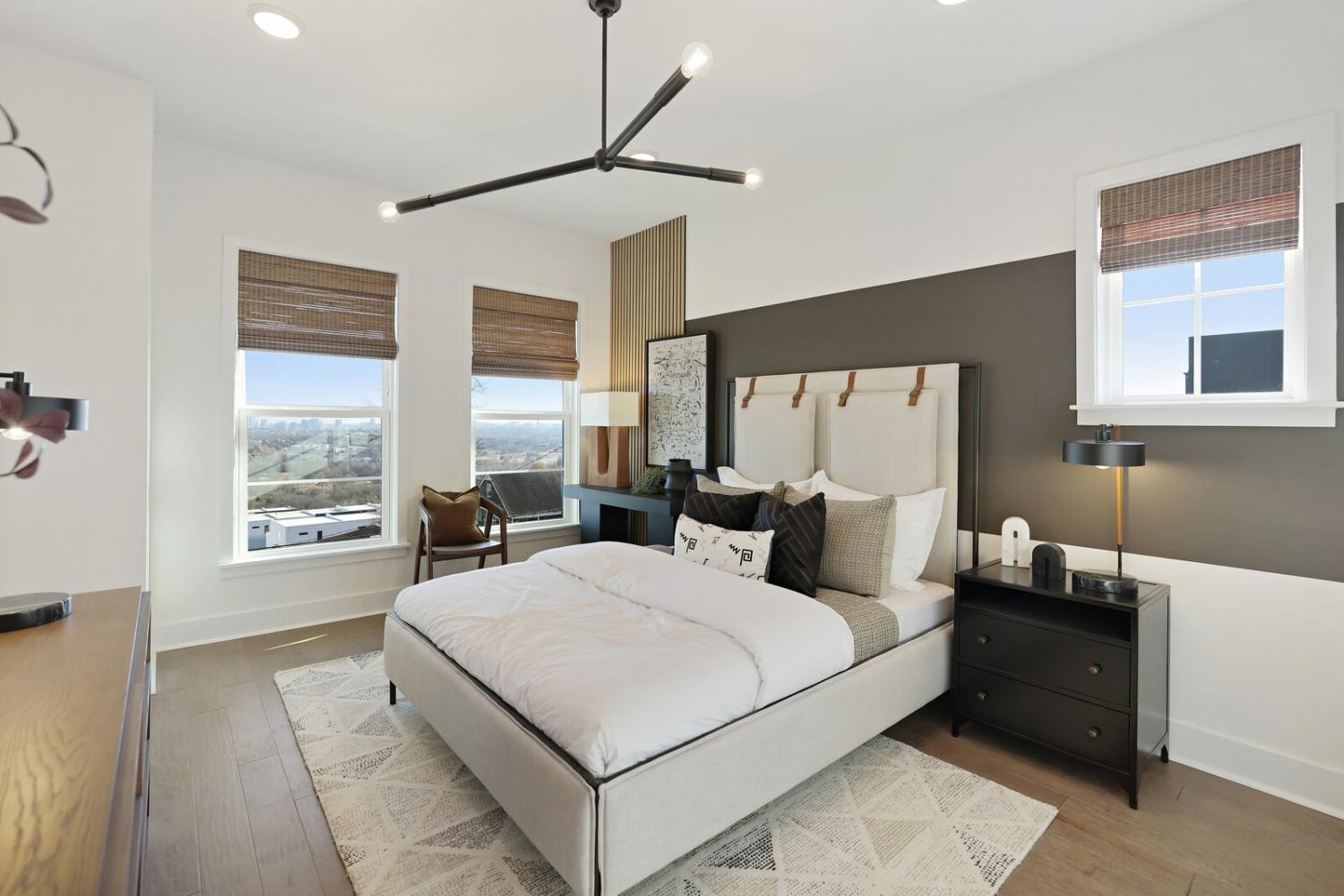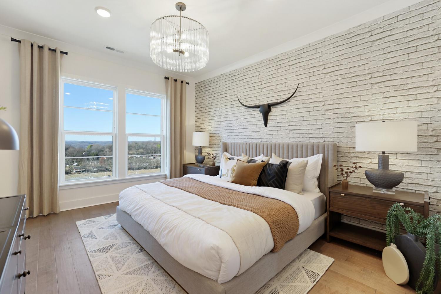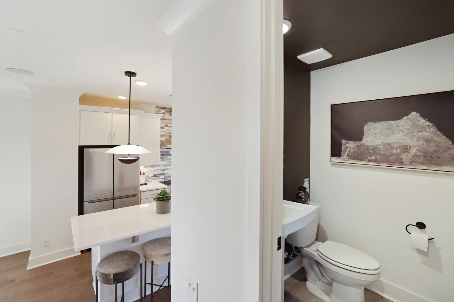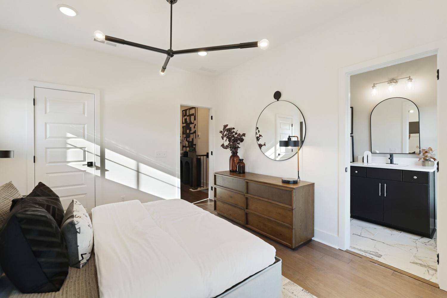 Welcome to this stunning Terravista floorplan, offering 2 bedrooms, 2.5 bathrooms, and 1,624 sq ft of beautifully designed modern living. Thoughtfully crafted with style and functionality in mind, this home features a tandem 2-car garage with extra storage, luxury vinyl plank flooring throughout, and modern matte black fixtures that elevate every room. Step into the open-concept living area, where natural light pours across the space and highlights the striking white-and-black palette with wood panel accents, a true modern designer moment. The eat-in dining area sits surrounded by windows, creating a bright and inviting spot for meals or morning coffee. The gourmet kitchen is a showstopper with quartz countertops, a spacious island, stainless steel appliances, stylish tile backsplash, and additional café cabinetry for extra storage. Upstairs, both bedrooms offer en-suite bathrooms, each featuring a frameless glass shower and contemporary finishes. The laundry is conveniently located on the same level as the bedrooms, making everyday living even easier. Enjoy unforgettable evenings and sweeping views of Music City from your private rooftop terrace, the perfect spot for relaxing or entertaining. Situated in a private location with accessible parking, this home also provides easy access to the community nature trail, ideal for morning walks or weekend strolls. With thoughtful upgrades, beautiful finishes, and a rooftop retreat, this home delivers elevated modern living just minutes from the best of Nashville. Up to 1% lender credit on the loan amount when buyer uses Seller's Preferred Lender.