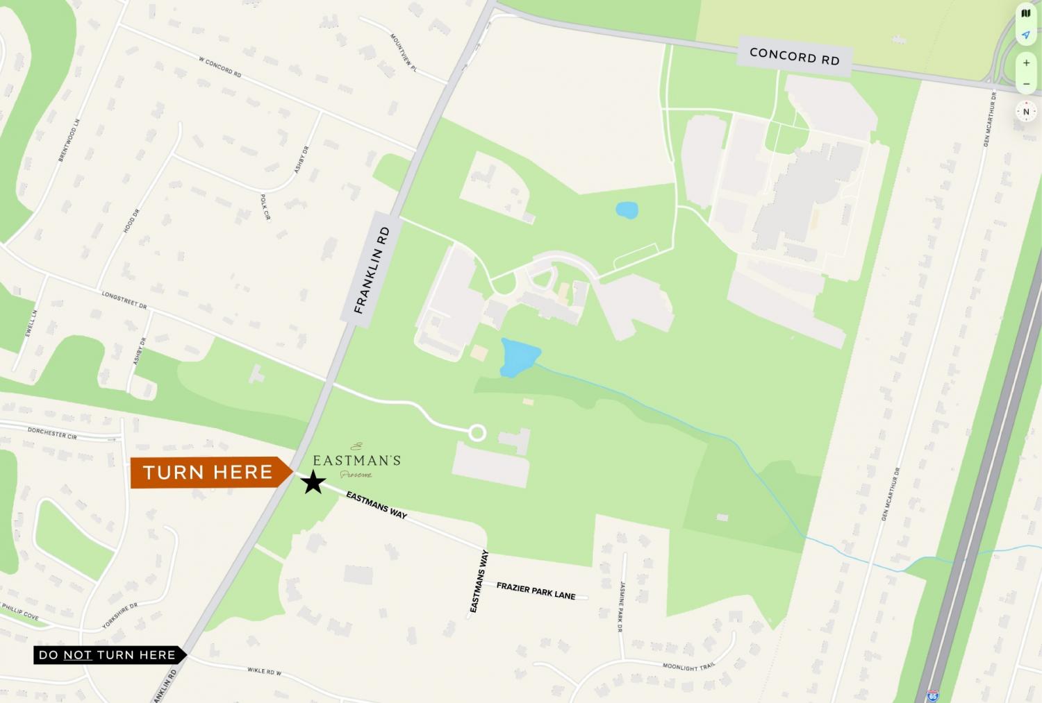GPS Address 6014 Eastmans Way to community from Nashville, take I-65 S. Take exit 71 onto Concord Rd. Turn right onto Concord Rd toward Brentwood. Turn left onto Franklin Rd. Turn left on Eastman's Way. Turn left on Frazier Park Ln. Home is on the Left.