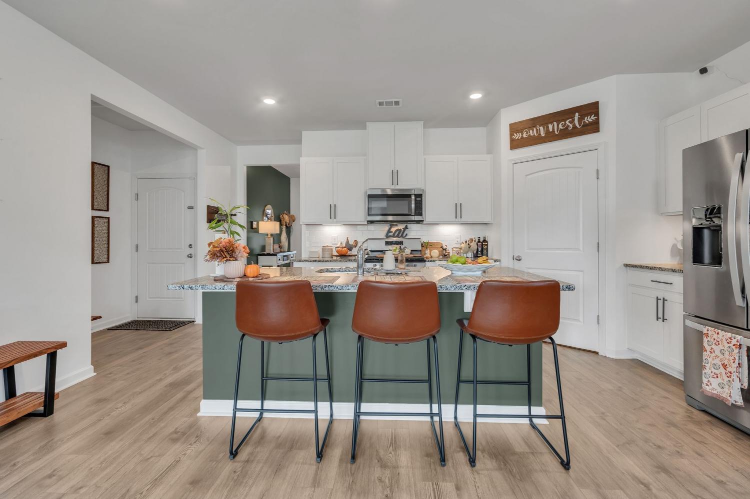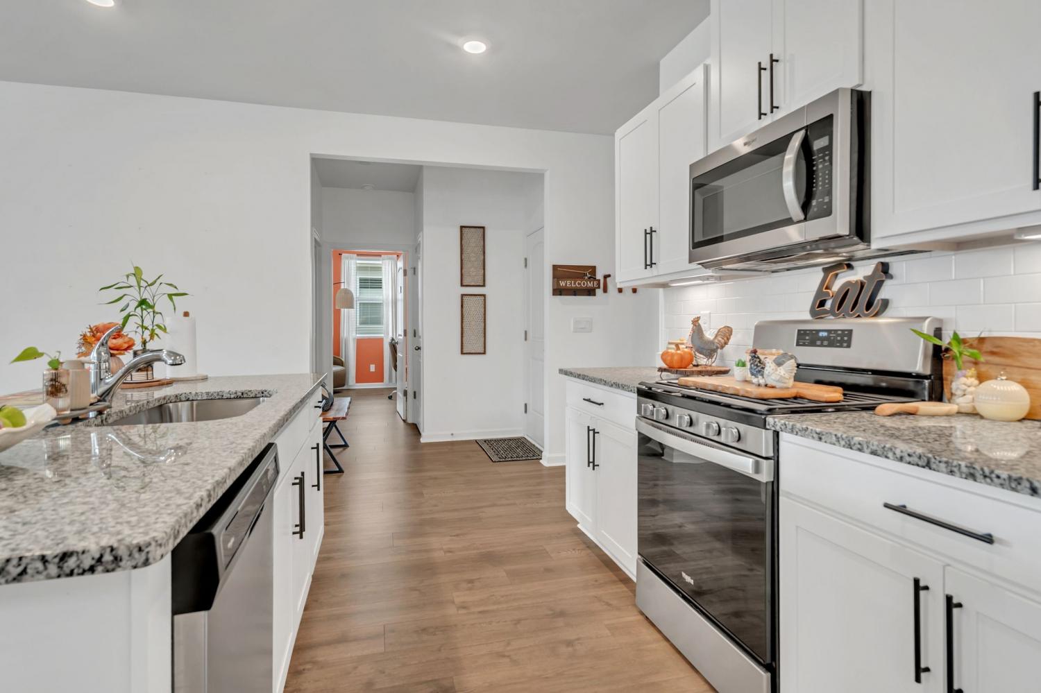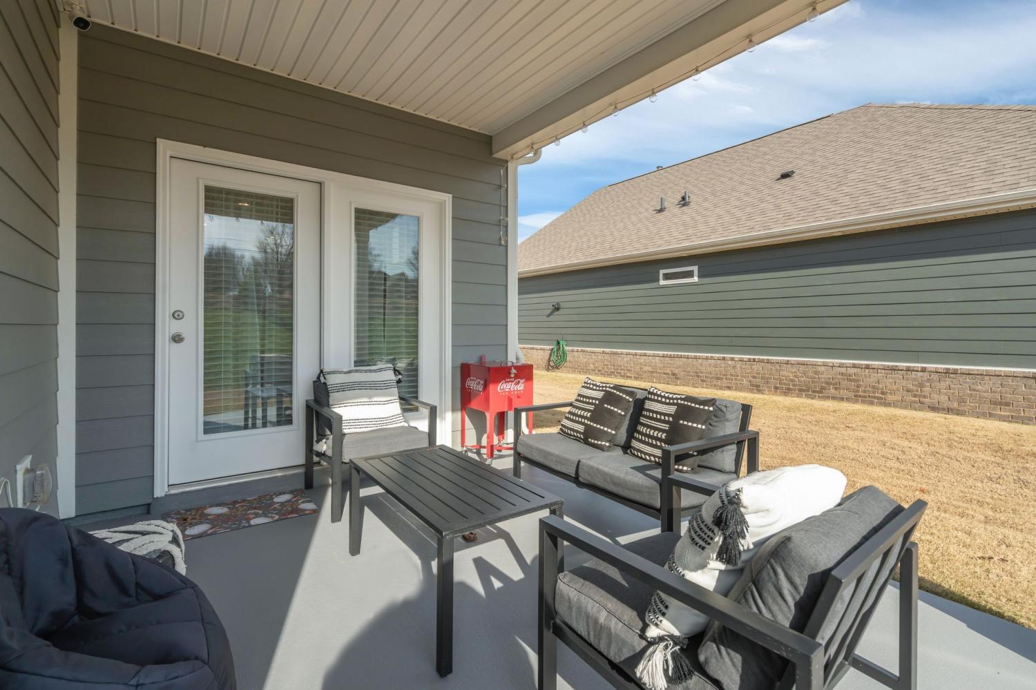 Gorgeous one-level home with an open-concept layout and tons of windows that fill the space with natural light. High ceilings enhance the airy feel, and the eat-in kitchen features stainless steel appliances, a pantry, plenty of counter space, and extra seating at the large island—perfect for family meals and gatherings. The spacious primary suite includes double vanities for added convenience. Enjoy outdoor living on the covered front porch and covered back patio overlooking the level lot. This family-friendly neighborhood offers fantastic amenities, including a pool, walking trails, clubhouse, fitness center, and tennis court. Just a short drive to dining and shopping, and only 6 minutes to I-65 for an easy commute. 1% lender credit with use of preferred lender.