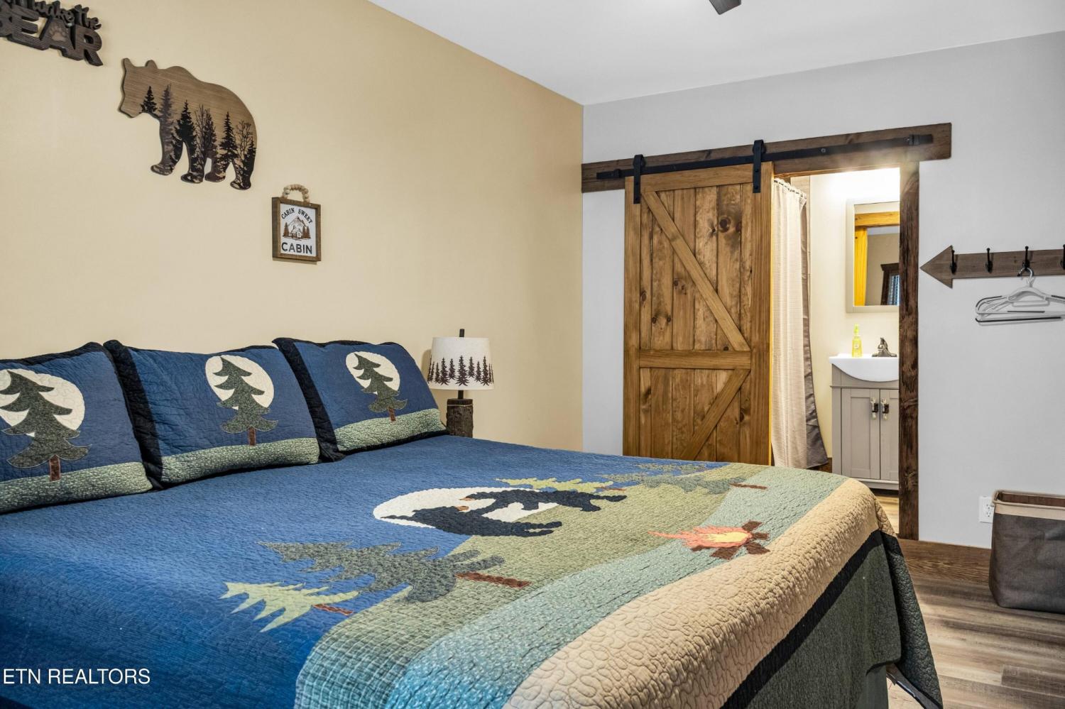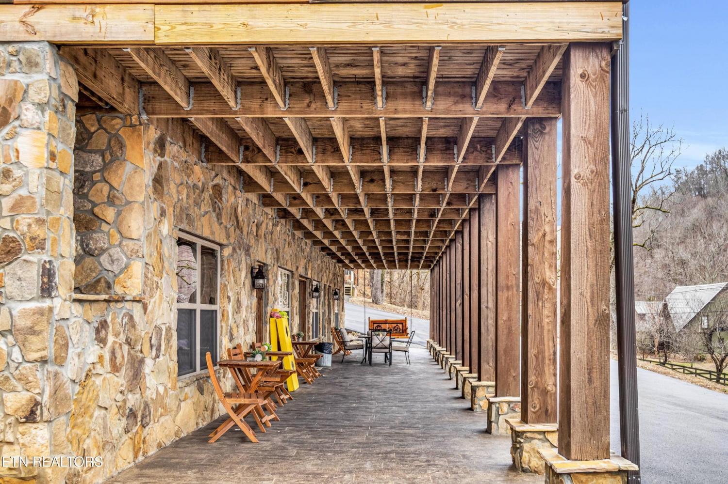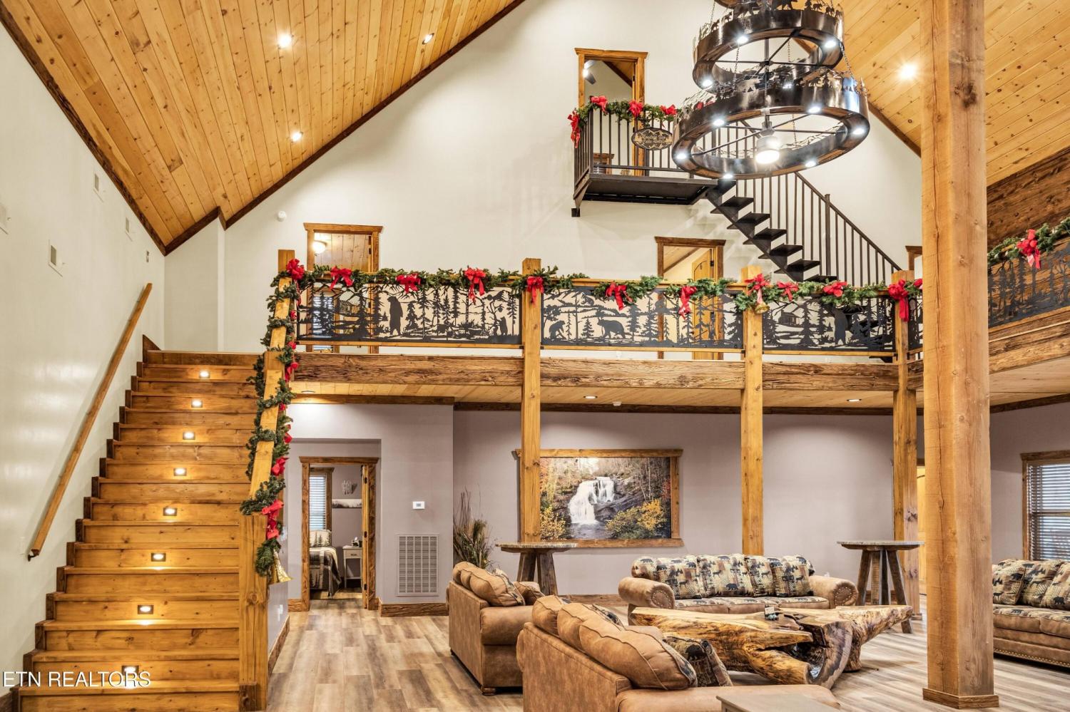 Tellico River Retreat & Event Center at 173 Rafter Rd is a rare, turn-key opportunity for short-term rental investors and event hosts alike. Purpose-built for large groups, this impressive lodge-style property sleeps up to 30 guests with 16 bedrooms and 16.5 baths, and commands nightly rental rates ranging from approximately $1,999 to $2,399. Each bedroom features its own private bathroom and individual climate control, creating a comfortable, hotel-like experience for every guest—ideal for multigenerational family gatherings, corporate groups, and retreats where privacy and personal comfort matter. Set just across the street from the Tellico River, the home's expansive decks and multiple outdoor seating areas offer sweeping river views, with riverfront parking directly along the water. Guests enjoy the soothing sounds and scenic beauty of the river from the large wraparound decks, private bedroom balconies, and covered verandas, making this property especially attractive for destination weddings, yoga and wellness retreats, business meetings, educational workshops, church groups, and family reunions. Ample paved parking, including room for motorcycles, easily accommodates larger groups and event traffic. Inside, the property features an open floor plan with cathedral ceilings, leather furnishings, and a warm lodge ambiance. The spacious game room and entertainment areas are designed for gathering and fun, with a pool table, foosball, card table, flat-screen TVs, cable, and DVD player. Multiple bars and generous common areas make it easy to host receptions, cocktail hours, or informal get-togethers. High-speed WiFi and USB plug-ins throughout support both leisure and business uses. The modern, stainless-steel kitchen is fully equipped to serve large parties, featuring double ovens, two side-by-side refrigerators, granite countertops, microwave, coffee maker with complimentary coffee, and ample prep and storage space.