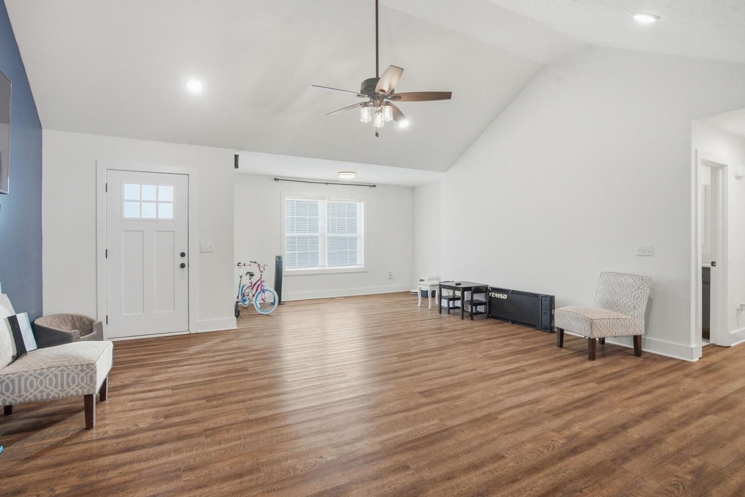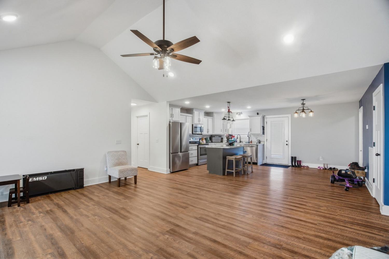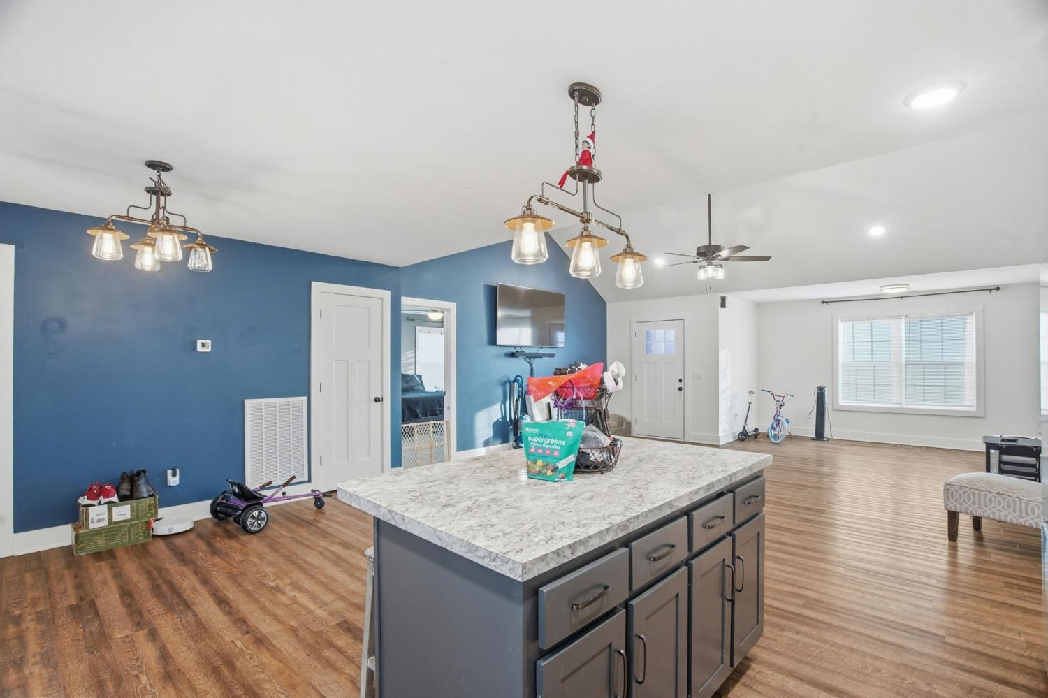 Welcome to this inviting one-level home situated on over 1.25 acres, offering space, comfort, and modern style. The open floor plan features a vaulted-ceiling living room that creates a bright, airy atmosphere—perfect for everyday living and entertaining. The kitchen is thoughtfully designed with stainless steel appliances, a tile backsplash, ample cabinetry, and a large walk-in pantry. Durable LVP flooring flows through the main living areas, while plush carpet adds comfort to the bedrooms. This home offers three spacious bedrooms and two full bathrooms, including walk-in closets and a dedicated laundry room for added convenience. Step outside to enjoy the covered front porch or relax on the back patio overlooking the expansive yard. With a stone and vinyl exterior, modern finishes, and peaceful acreage, this home blends functionality and charm in a serene residential setting—perfect for those seeking single-level living with room to breathe. VA Assumable loan at 3% interest rate.