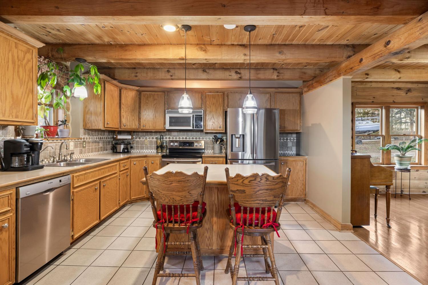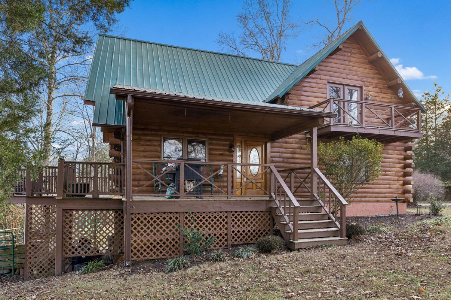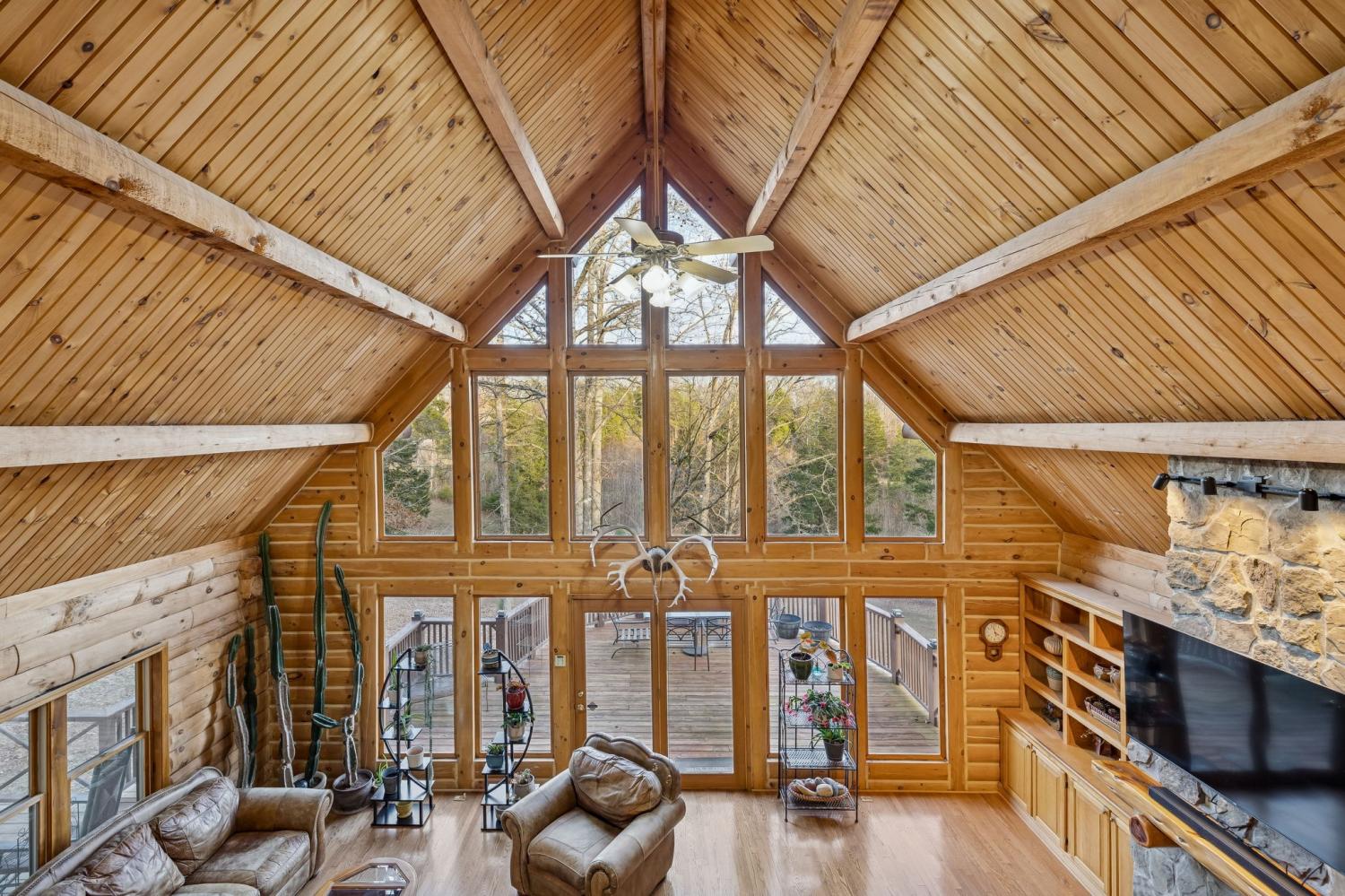 Custom log cabin retreat situated on over 10 private acres in scenic Lyles, Tennessee, offering an exceptional blend of open pasture, gently rolling land, and wooded privacy. Expertly constructed using Northern White Pine logs hand-selected and milled in New Hampshire by Pioneer Log Homes, this custom-built property showcases true craftsmanship and durability, combining classic log-home character with thoughtful modern conveniences. Step inside to rich wood finishes, soaring vaulted ceilings, and a dramatic stone fireplace that anchors the main living area and creates a warm, inviting, and timeless atmosphere. The open-concept layout seamlessly connects the living, dining, and kitchen spaces, making it ideal for entertaining, hosting family and friends, or enjoying peaceful evenings surrounded by nature. Large windows throughout the home allow abundant natural light and provide picturesque views of the surrounding countryside. The lower level expands the living space and functionality, featuring a second bedroom, full bath, laundry area, a dedicated 9x12 hobby or storage room, and flexible office or recreation space—perfect for guests, work-from-home needs, a media room, or additional living quarters. Year-round comfort is maintained with high-efficiency Trane HVAC units offering zoned climate control. Additional property highlights include a high-quality private well delivering clean, refreshing water, high-speed fiber optic internet, a charming rocking chair front porch, and a massive deck ideal for outdoor entertaining while taking in sweeping views of the rolling Tennessee countryside. This property offers privacy, versatility, and the opportunity to enjoy country living at its finest.