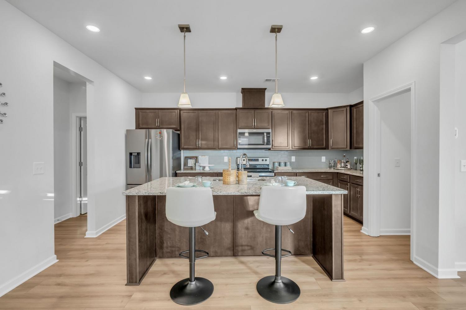 Welcome to Blakeney, a vibrant community offering sidewalks, tree-lined streets, walking trails, open space, picnic area, pavilion, playground and splash pad for the kids. This Eppes Open Floor Plan by Regent Homes has one of the best layouts featuring main level 9ft ceilings, well-designed Kitchen w/ quartz countertops that blend elegance & practicality for a timeless, clean, sophisticated heart of the home, large 8ft Island, walk-in pantry, soft close cabinets, Whirlpool & Samsung Appliances, beautiful Laminate floors, Dining Room & Great Room. The spacious Entrance Foyer sets the tone for this home w/soaring ceilings, functional area offering many options to add your special touch like a hall tree bench & storage for shoes, keys, coats, as well as your favorite decor to impress guests. The spacious Primary Bedroom Ensuite includes double quartz vanities, soaking tub, large tile surround walk-in shower a huge walk-in closet w/Direct & Convenient Access to the Laundry Room. As you head to the second floor notice the wide hardwood staircase that leads to 3 bedrooms, a Full Hall Bath. The largest bedroom has so many use options perfect as a private guest room, flex space or an office. All 3 bedrooms are like new, never used. If you need storage; this home has storage options on both floors. You will love the covered front porch and covered back patio to enjoy your morning coffee or evening beverage. This home is located in an established part of the neighborhood, so no construction traffic, noise or dust and is tucked away with great views of the surrounding green space. Not only does this community have low HOA fees, but it is conveniently located to Schools, Cedar Stone Park, 3 miles to I24, quick access to I840 & just 10 miles to Nolensville & Historic Downtown Smyrna offering all conveniences including shopping, restaurants, banking, dental/medical plus more. ** Very Well Maintained, Clean No Smoking & Pet Free Home** Like new without the wait