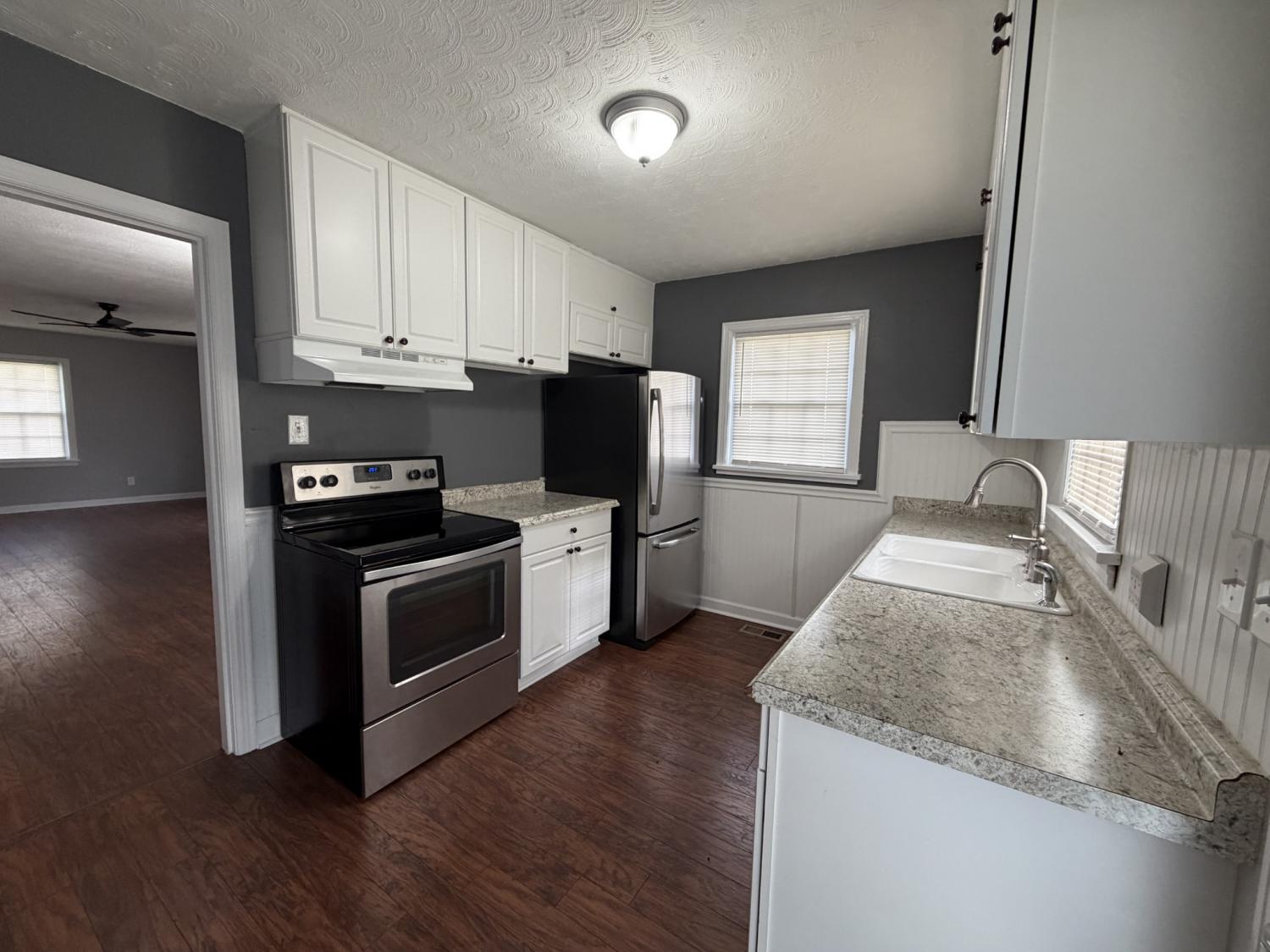 This is a great convenient starter home or a home for a small family, right in the center of town. It has been redone with nice appliances and HVAC. The bathroom has a new tile shower/tub, and the floors, Kitchen cabinets, and paint are nice, neat and clean! Large living/dining room, kitchen, bath and 2 bedrooms upstairs. One finished room downstairs for a den, office, or whatever you wish, and a nice size full basement with a washer and dryer. There is room in the basement for a work out area and a workshop area. Pretty yard with a carport and a nice size deck. The house fronts Sunrise Drive but has always used its back street address of Moore Dr. This is where your driveway, carport and deck are so entrance from Moore is easy!