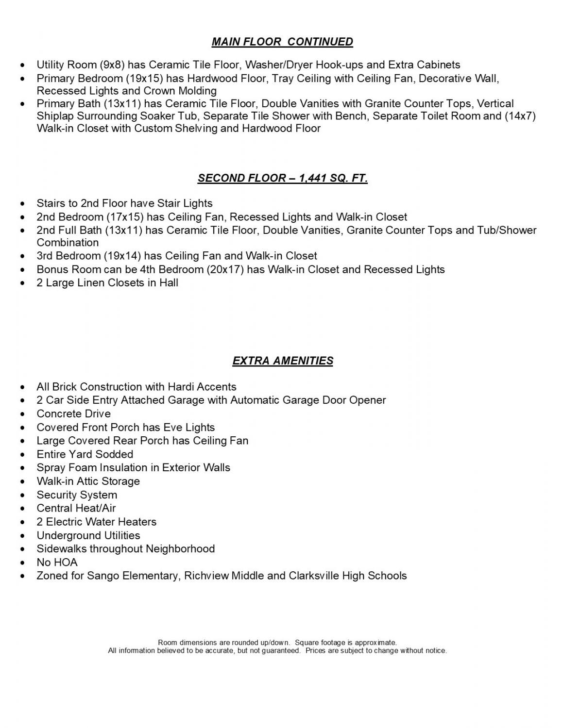 Beautiful 3-Bedroom Home with Bonus Room in Sango that checks all the boxes! This stunning 3-bedroom, 2.5-bath home with a spacious bonus room - perfect as a 4th bedroom - is located in the desirable Sango area. Step inside to a welcoming foyer featuring two coat closets and a convenient half bath. The kitchen is a dream with stainless steel appliances (double ovens, cooktop, microwave, dishwasher), quartz countertops, tile backsplash, farmhouse sink, large island, and an oversized walk-in pantry plus a storage closet. The adjacent dining area showcases vertical shiplap and access to the covered back porch - ideal for entertaining. Enjoy cozy evenings in the great room with a beamed ceiling and an electric fireplace framed by a classic mantle. The main-floor laundry room offers additional cabinetry for storage, while the garage entry flows through a functional mud bench drop zone right into the kitchen. The primary suite on the main floor is a luxurious retreat with double vanities topped with granite, a soaker tub, a tiled shower with seat, and a spacious walk-in closet with custom shelving. Upstairs, you’ll find two more bedrooms - each with walk-in closets - full bath with double granite vanities and a tub/shower combo, a bonus room with a walk-in closet (can be 4th bedroom), and two linen closets for added storage. Additional highlights include a 2-car side-entry garage, covered front and back porches, and thoughtful design throughout. No HOA!! Don’t miss your chance to make this beautiful home yours!