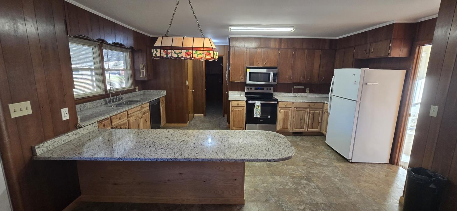Well-maintained 3-bedroom, 2-bath brick home tucked into a quiet, long-established neighborhood with convenient access to town and Highway 64 bypass—ideal for an easy commute in multiple directions. The floor plan offers generous living space, including a spacious living room and a separate dining area perfect for everyday living or entertaining. The kitchen is a standout with ample cabinetry, a center island with bar seating, granite surfaces, and excellent storage throughout. The primary suite features a nicely updated private bath with a walk-in tiled shower. Additional features include a large laundry room, an attached two-car garage with ramp access into the home, and a covered back patio overlooks the yard, and a well-built detached storage building provides additional outdoor storage. A solid home offering comfort, functionality, and a convenient location.