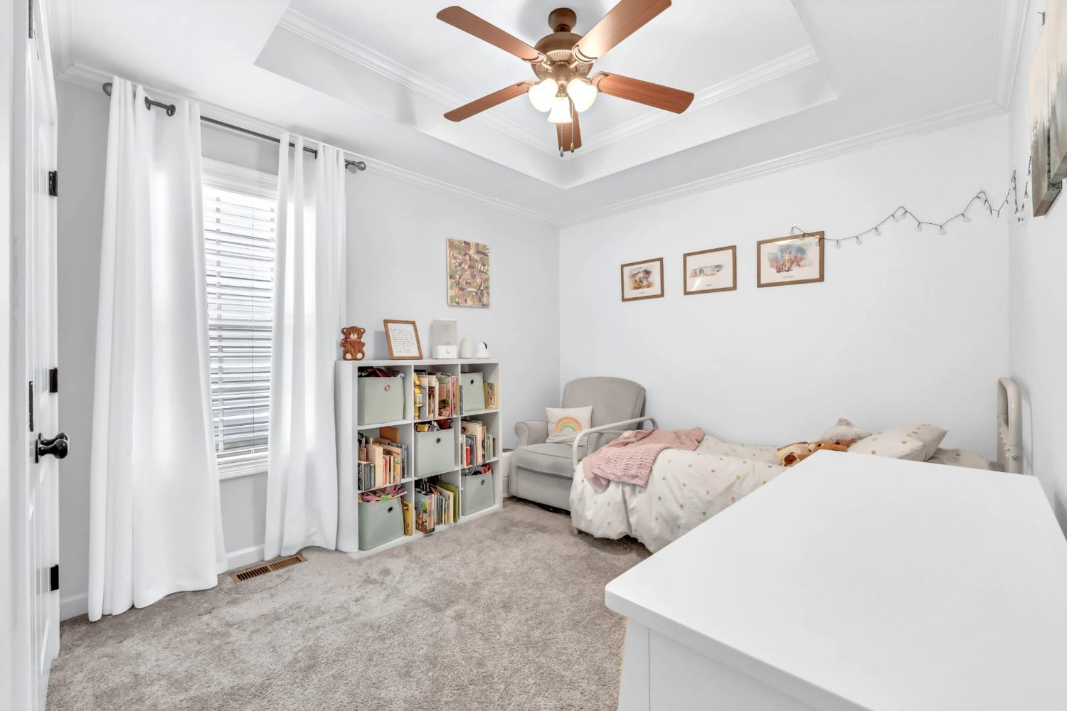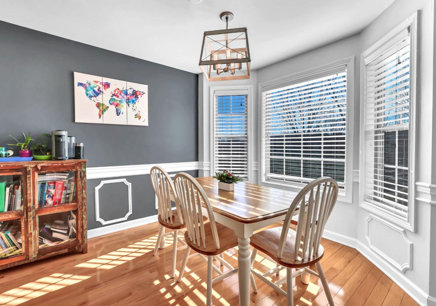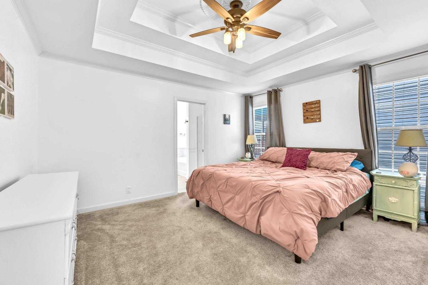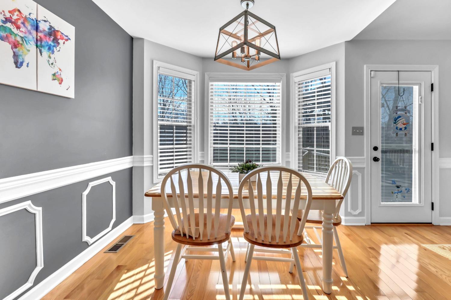 This neighborhood was designed to be at the center of everything – shopping, hospital, post and interstate. The home boasts stylish wainscoting throughout, adding a touch of elegance to every room. The kitchen is beautifully appointed with granite countertops, white cabinets, and a striking accent wall, complemented by light hardwood flooring. The primary bedroom features a sophisticated double tray ceiling and a decorative medallion, providing a luxurious atmosphere. In the primary bathroom, you'll find double vanities, a spacious walk-in closet, and both a separate tub and shower for ultimate comfort. The laundry room is exceptionally equipped, offering the most cabinets you are likely to see, providing ample storage and organization space. Outside, enjoy a pergola and deck ideal for relaxing or entertaining guests. Additional amenities include a storage shed and a tree-lined backyard.
