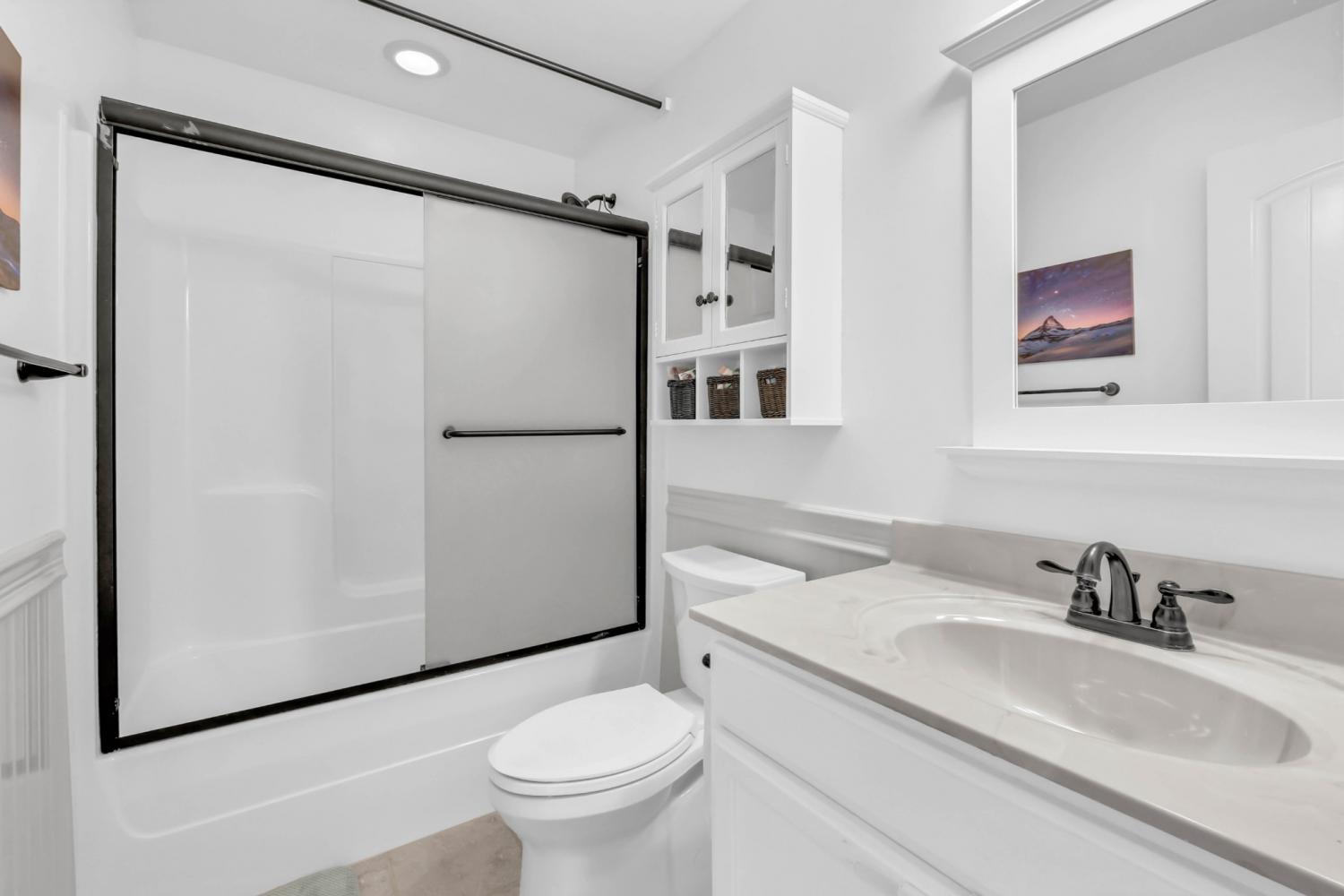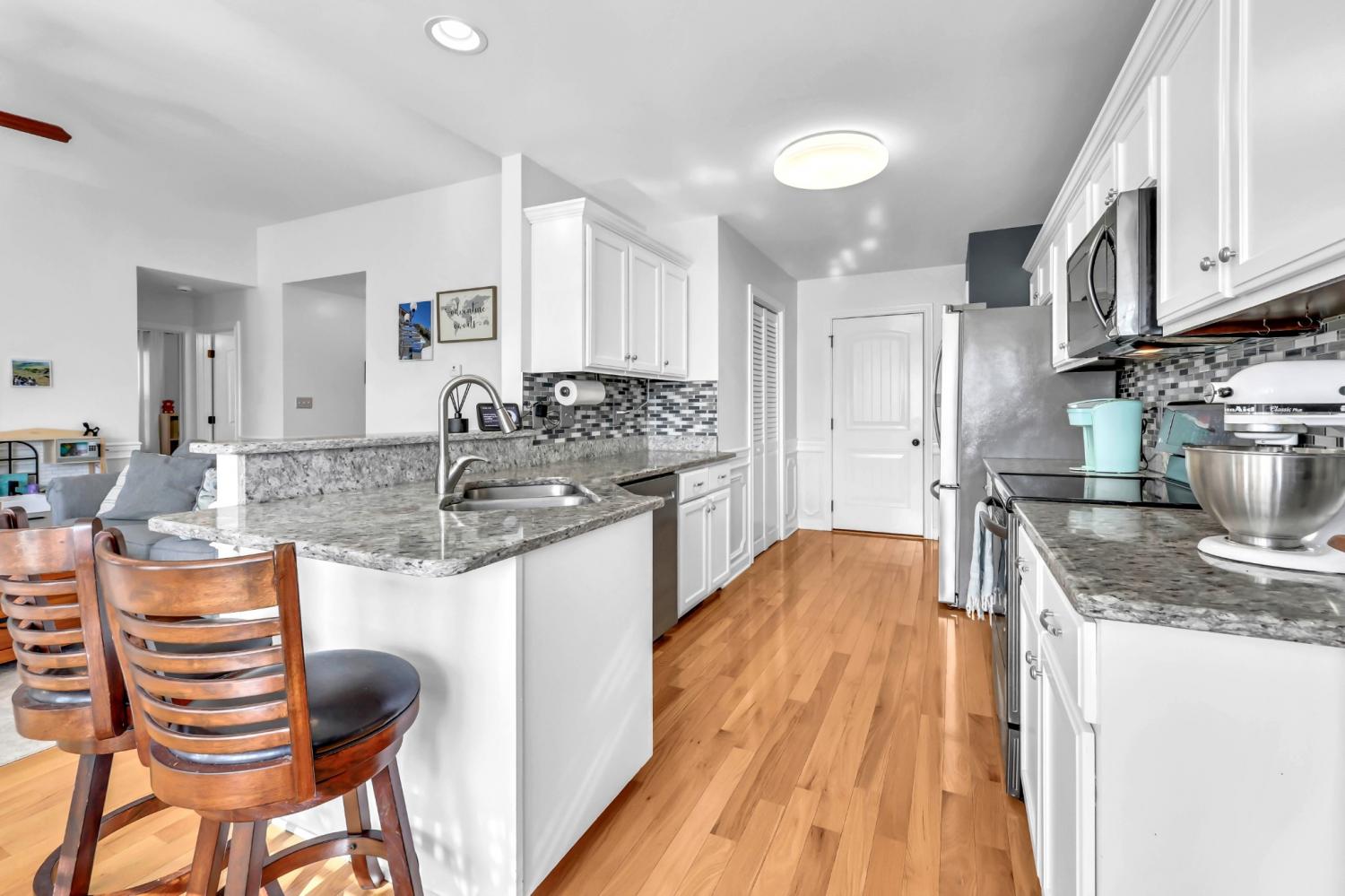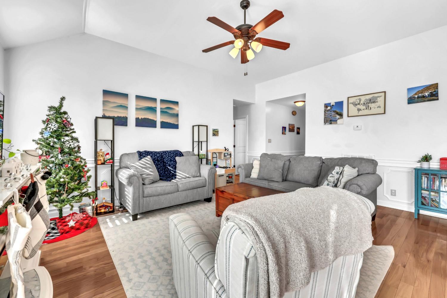 This neighborhood was designed to be at the center of everything – shopping, hospital, post and interstate. The home boasts stylish wainscoting throughout, adding a touch of elegance to every room. The kitchen is beautifully appointed with granite countertops, white cabinets, and a striking accent wall, complemented by light hardwood flooring. The primary bedroom features a sophisticated double tray ceiling and a decorative medallion, providing a luxurious atmosphere. In the primary bathroom, you'll find double vanities, a spacious walk-in closet, and both a separate tub and shower for ultimate comfort. The laundry room is exceptionally equipped, offering the most cabinets you are likely to see, providing ample storage and organization space. Outside, enjoy a pergola and deck ideal for relaxing or entertaining guests. Additional amenities include a storage shed and a tree-lined backyard.