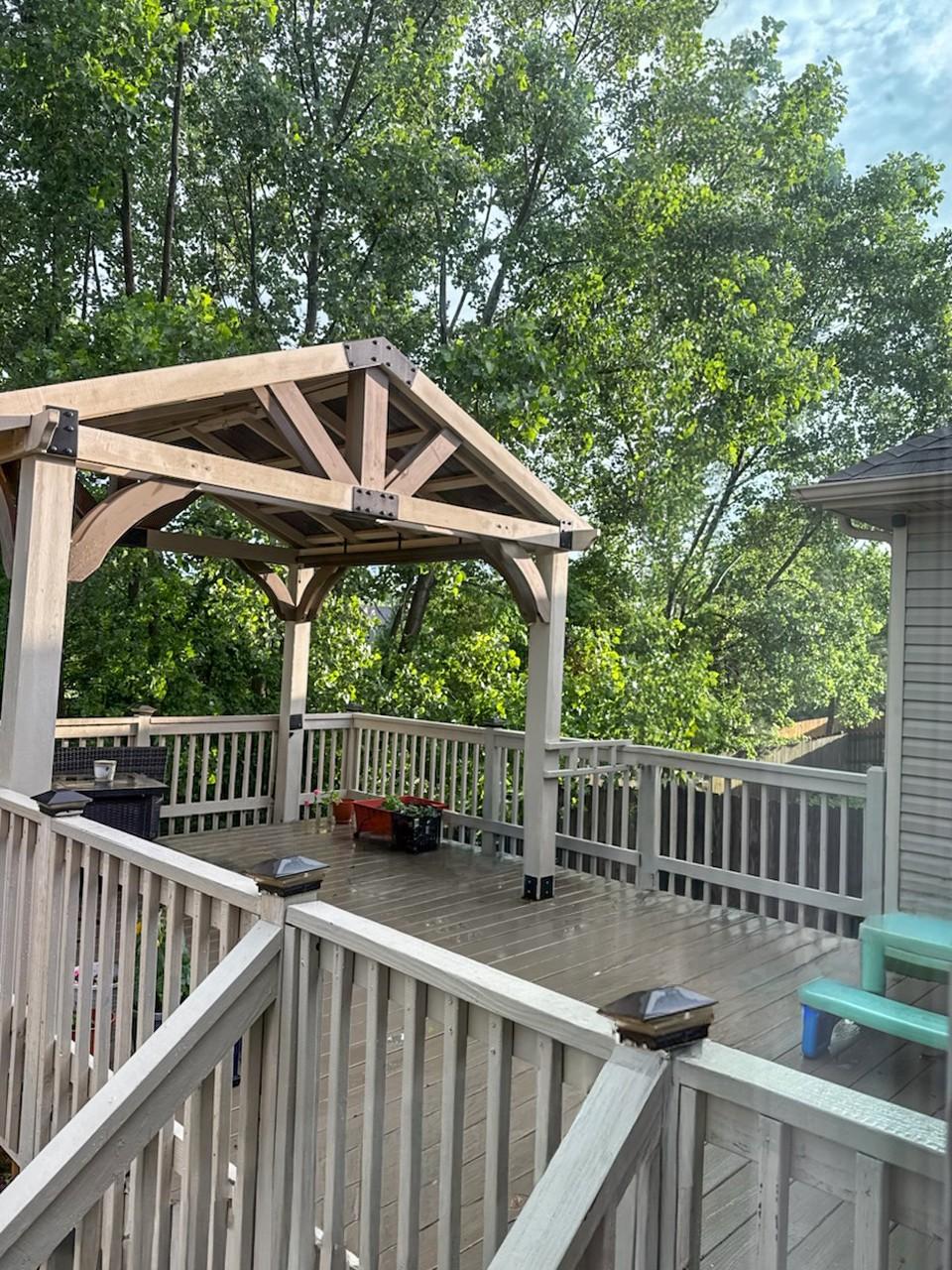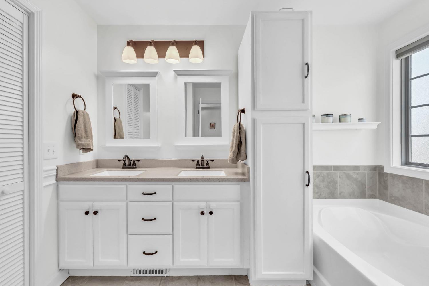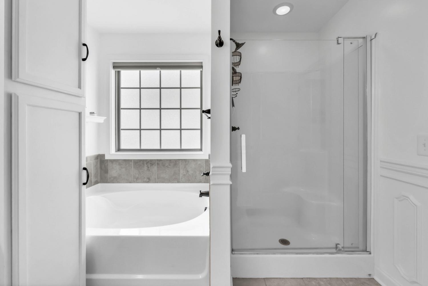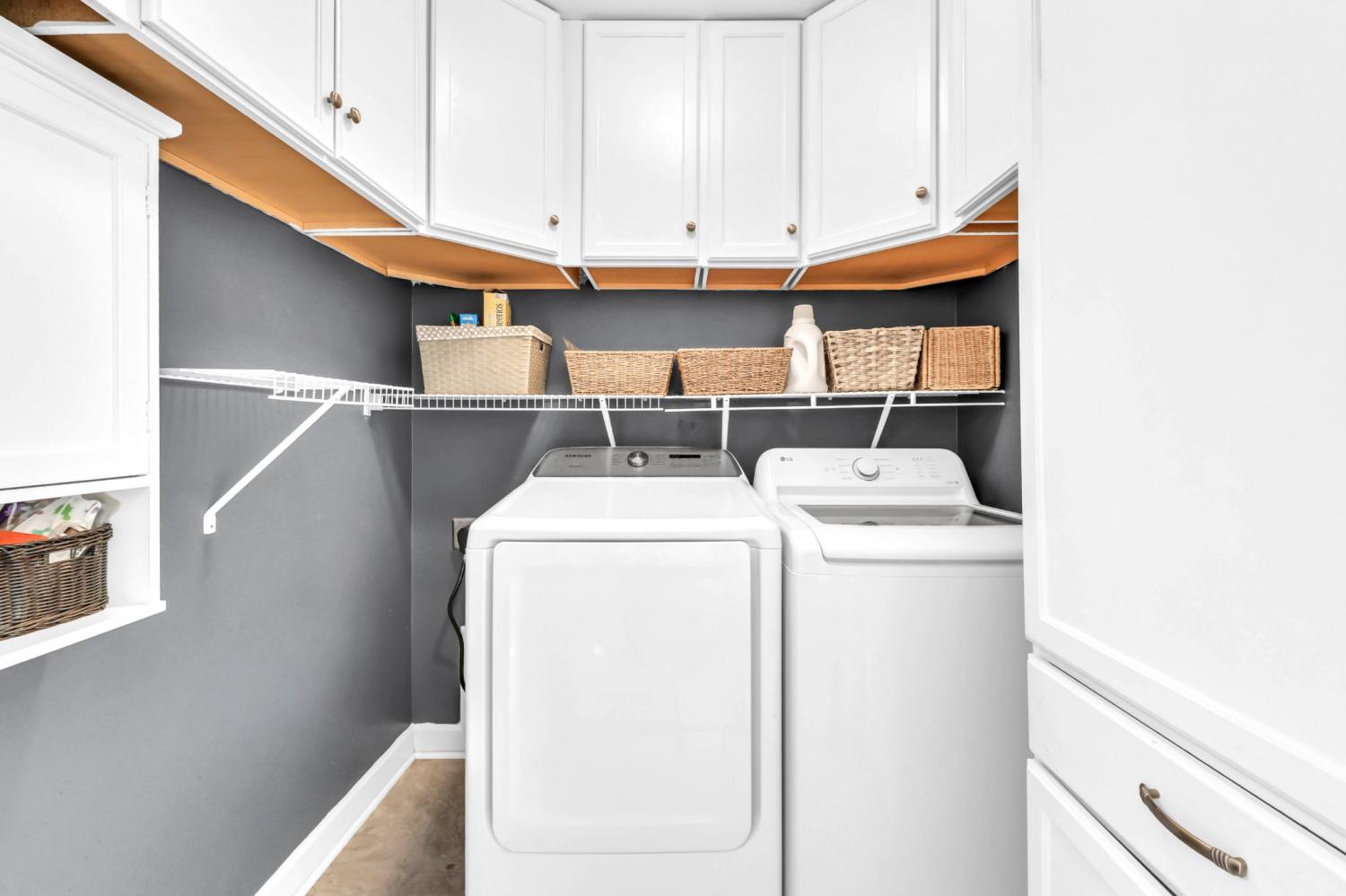 This neighborhood was designed to be at the center of everything – shopping, hospital, post and interstate. The home boasts stylish wainscoting throughout, adding a touch of elegance to every room. The kitchen is beautifully appointed with granite countertops, white cabinets, and a striking accent wall, complemented by light hardwood flooring. The primary bedroom features a sophisticated double tray ceiling and a decorative medallion, providing a luxurious atmosphere. In the primary bathroom, you'll find double vanities, a spacious walk-in closet, and both a separate tub and shower for ultimate comfort. The laundry room is exceptionally equipped, offering the most cabinets you are likely to see, providing ample storage and organization space. Outside, enjoy a pergola and deck ideal for relaxing or entertaining guests. Additional amenities include a storage shed and a tree-lined backyard.