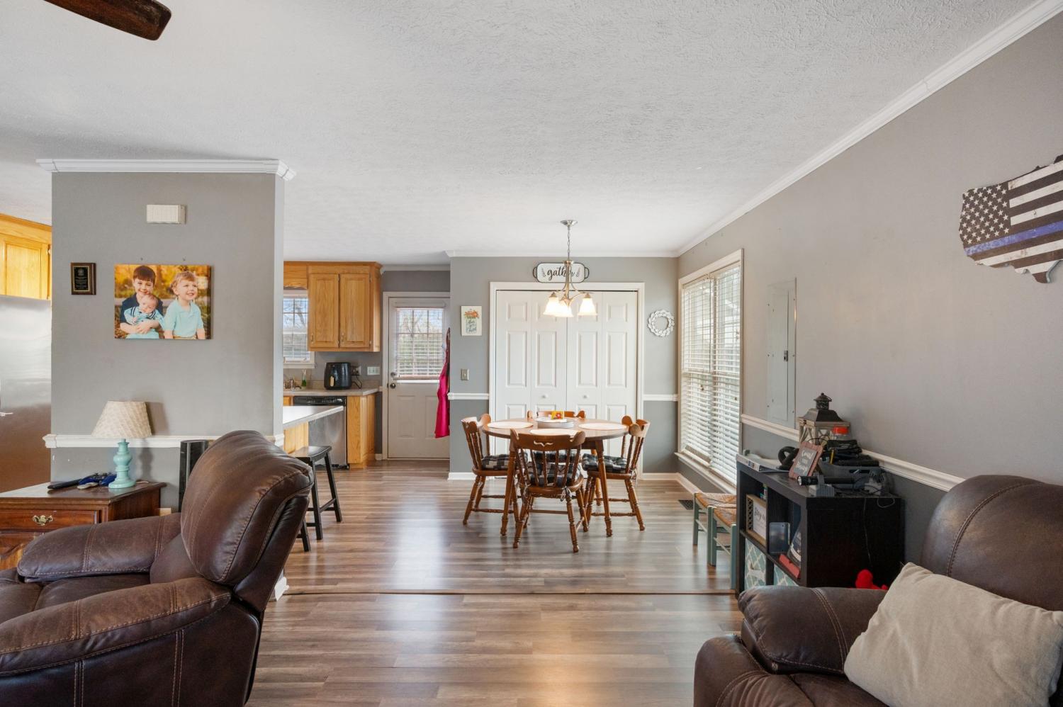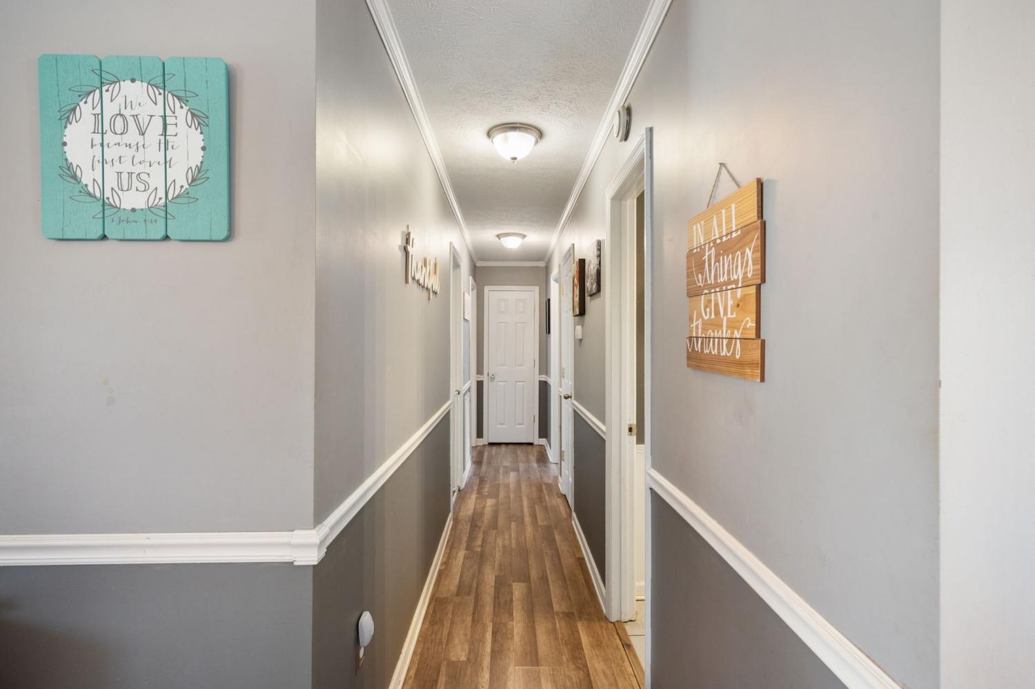 Move-in ready 3-bedroom, 2-bath home with a garage located on a cul-de-sac. The home features a large covered front porch and a back deck. LVP flooring runs throughout the main living areas and primary bedroom, with tile flooring in both bathrooms. Crown molding is present throughout much of the home. The kitchen offers solid oak cabinetry, a breakfast bar, and an eat-in area. The primary bedroom includes a tray ceiling and a private en-suite bathroom. The guest bathroom features wainscoting. Tilt-to-clean windows!