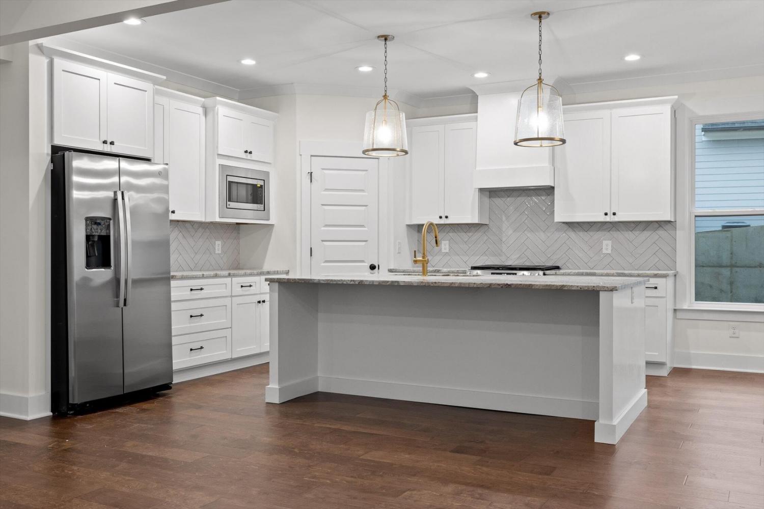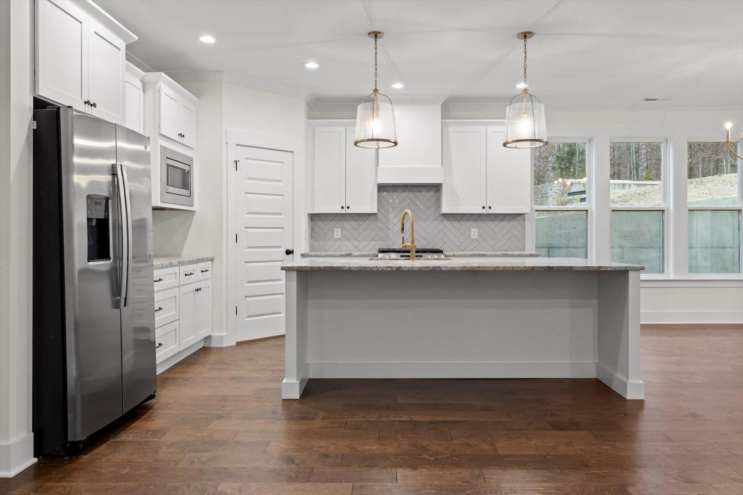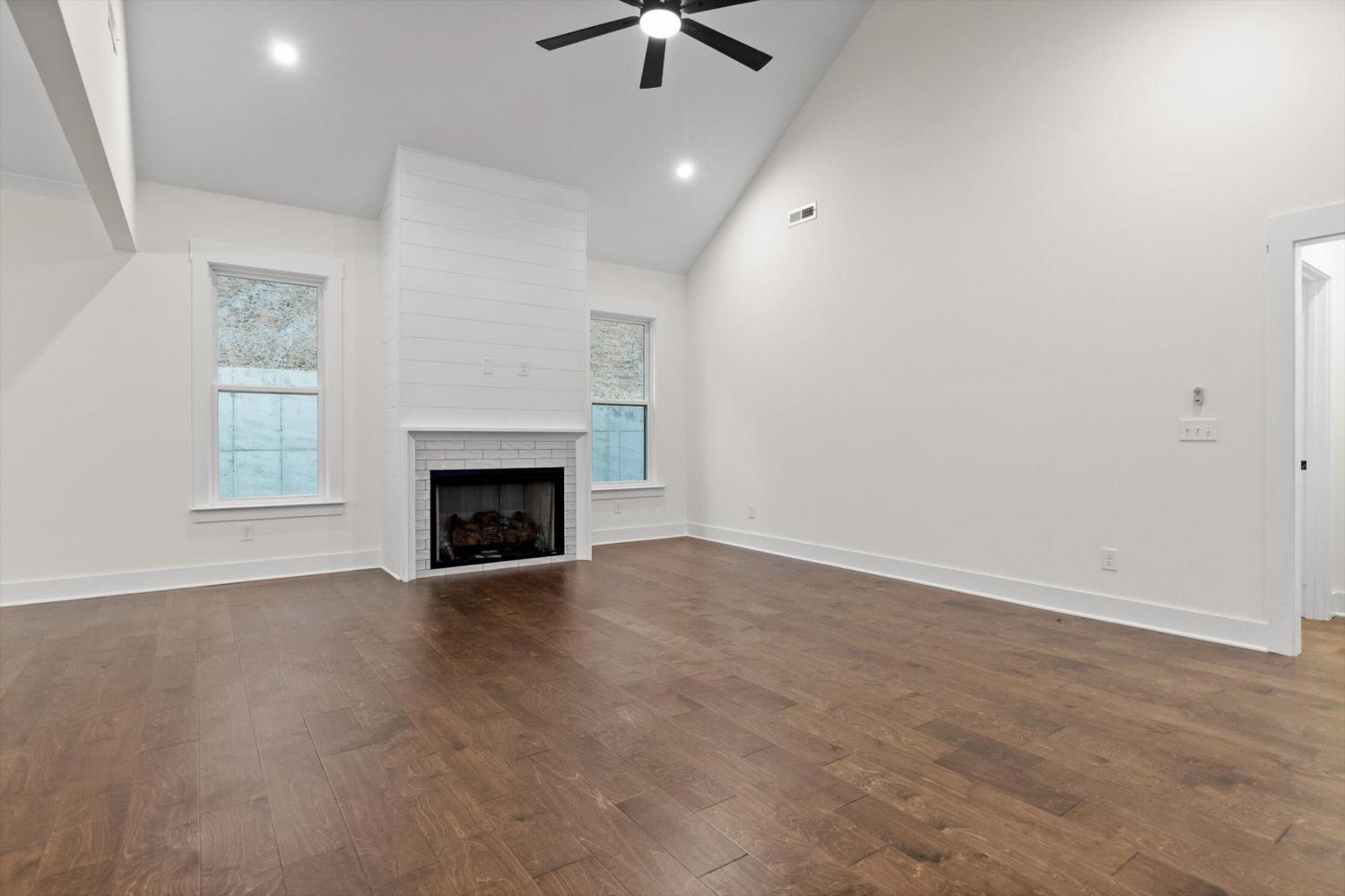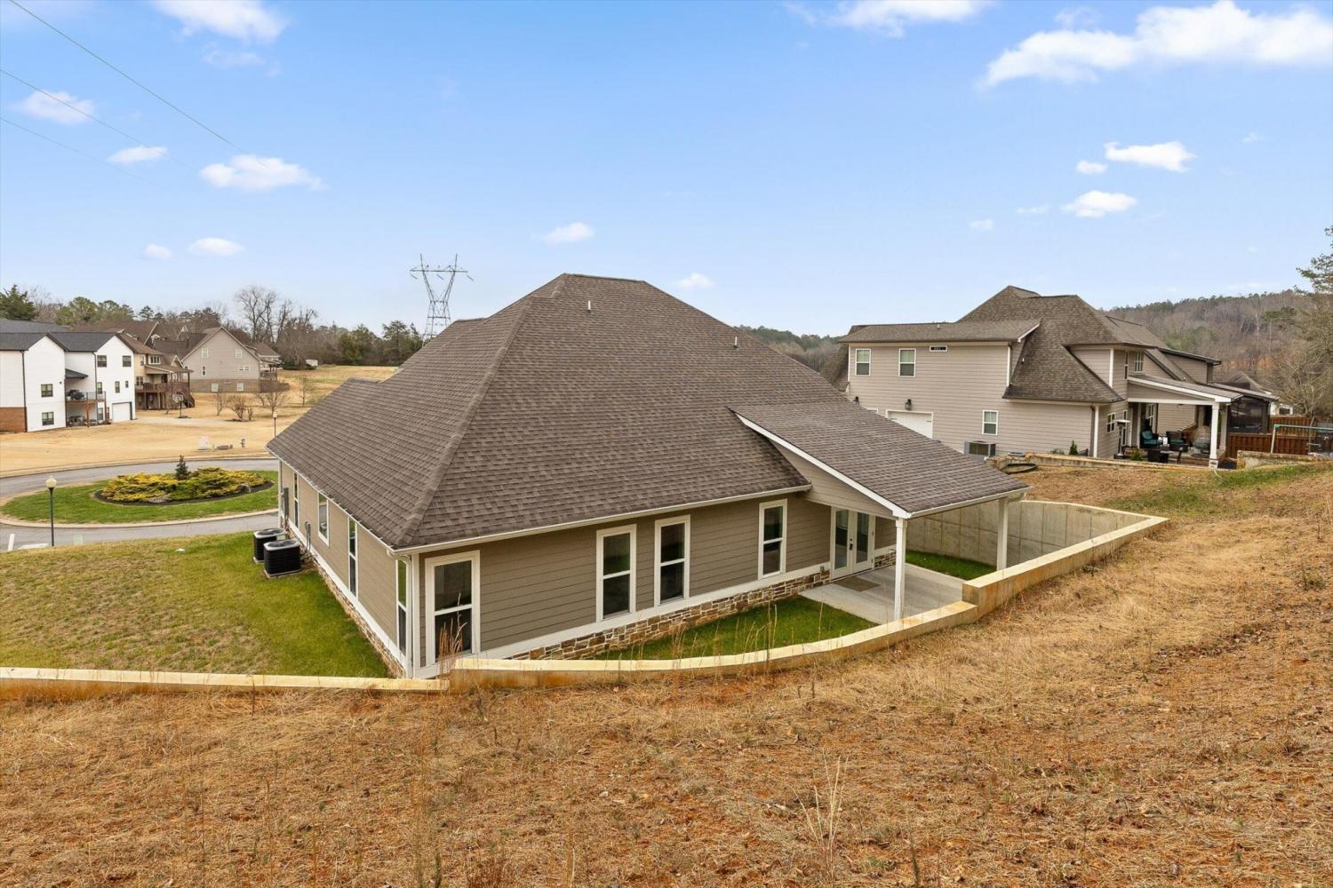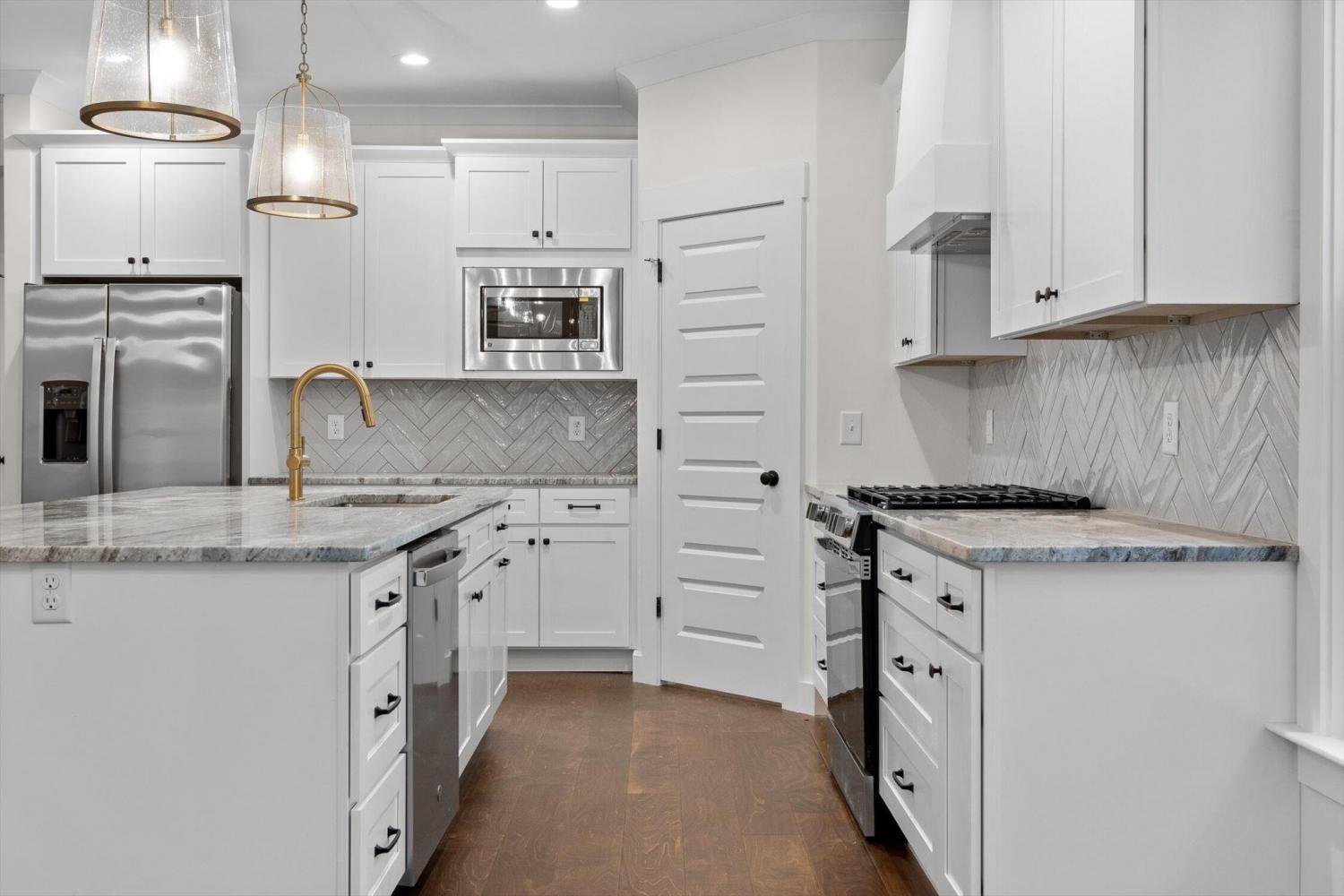 This brand-new home offers timeless character paired with modern comfort, located just off E. Brainerd Road in a peaceful, walkable neighborhood and directly across the street from the community pool—an ideal setting for both convenience and lifestyle. From the inviting front porch to the clean trim lines, metal roof, and mixed exterior siding, the exterior delivers strong curb appeal. Step inside to a bright, open-concept main level anchored by a vaulted living room centered around a cozy gas fireplace—perfect for gathering with family and friends. The living space flows seamlessly into the modern kitchen, which features a large center island, stainless steel appliances, a gas stove, pantry, and ample workspace for entertaining. French doors open to the back porch, creating a smooth transition to outdoor living and a fenced-in backyard ideal for pets or play. The main-level primary suite is a private retreat with a treyed ceiling and abundant natural light. The spa-inspired primary bathroom includes a large soaking tub, a spacious walk-in shower, and separate vanities with built-in storage. A laundry room with a sink adds everyday convenience. Also on the main level is a private guest suite with its own bath—perfect for an in-law suite, home office, or study. Upstairs, two generously sized bedrooms with large closets share a Jack-and-Jill bathroom. A spacious loft provides flexible use as a home office or family TV area, while an additional bonus room and full bathroom offer even more living space. With its new construction, thoughtful layout, quality finishes, and access to community amenities in a walkable neighborhood, this home offers a perfect blend of comfort, style, and modern living.