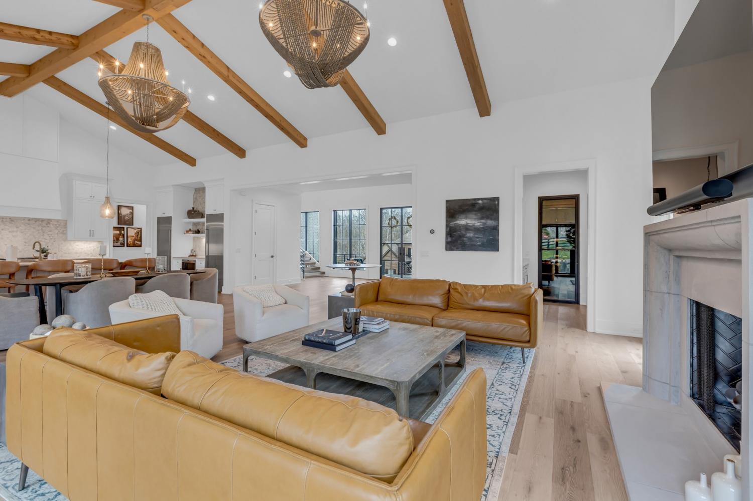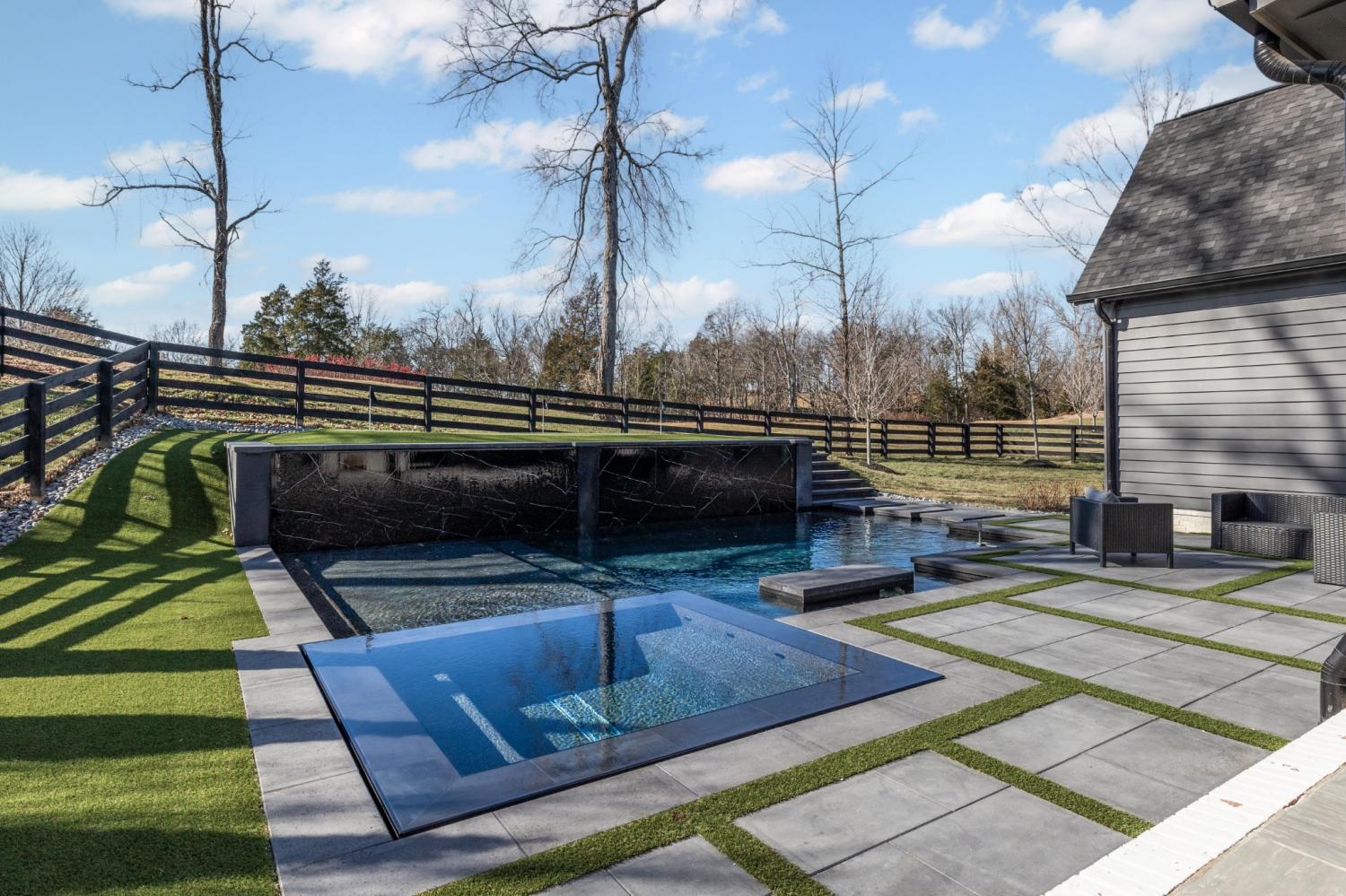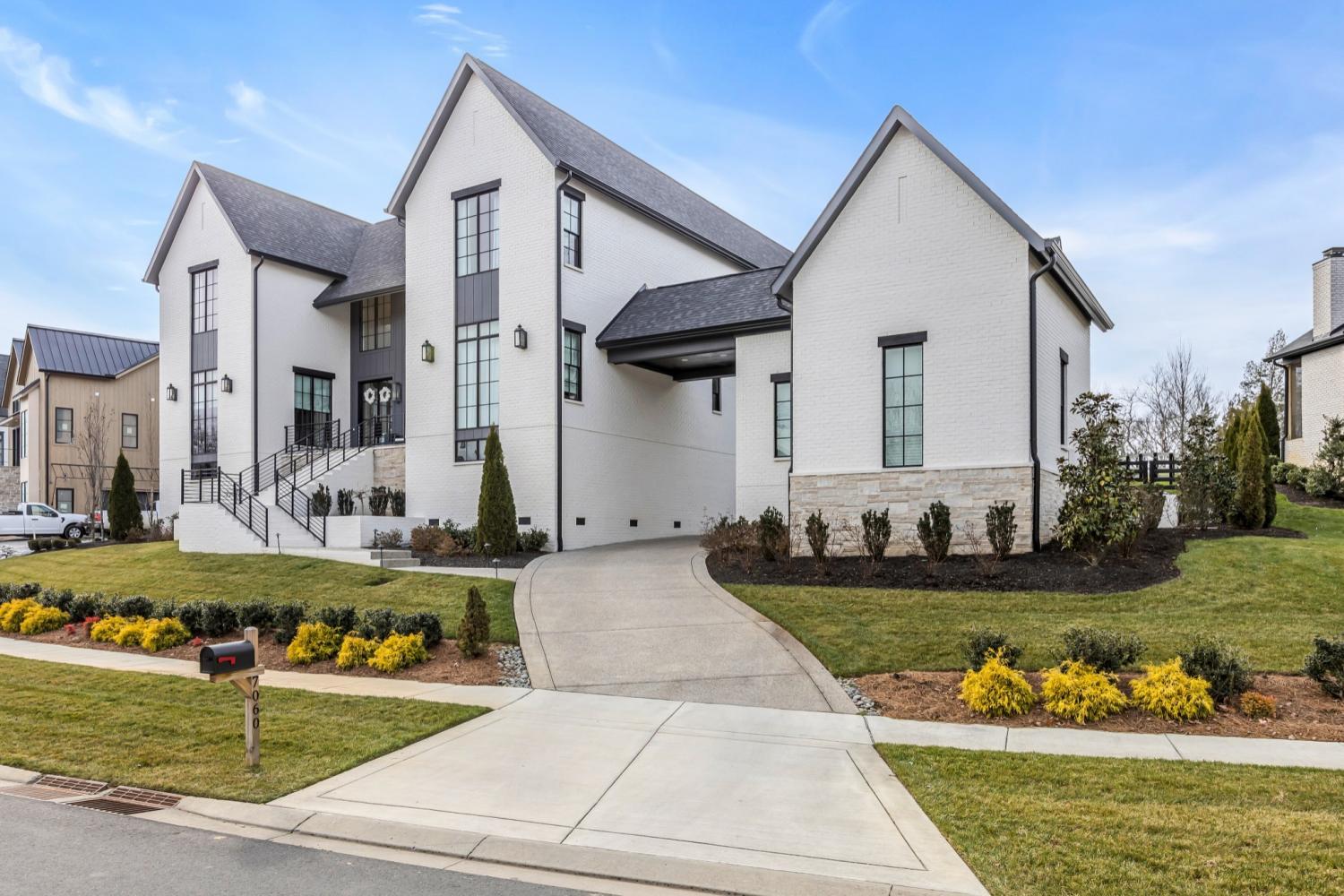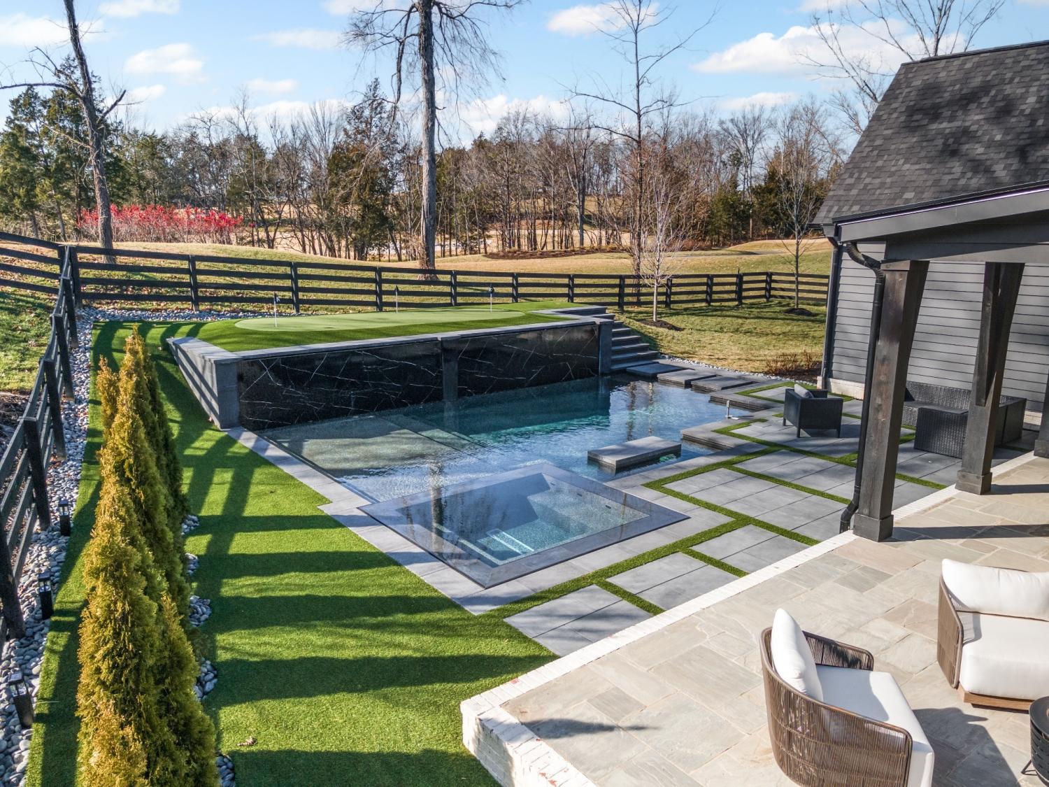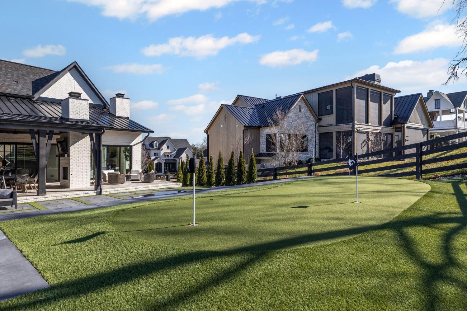 Welcome to this stunning custom-built residence in the prestigious Troubadour Golf & Field Club, crafted by Tennessee Valley Homes in 2022. Spanning 5,929 square feet on a 0.45-acre lot, this architectural masterpiece combines modern elegance with timeless design, offering an unparalleled lifestyle in one of Middle Tennessee’s most sought-after communities. This home features five spacious bedrooms, five full bathrooms, and two half baths, providing ample space for family and guests. Step inside to discover an open-concept floor plan flooded with natural light and adorned with wide-plank hardwood floors. The soaring ceilings and exposed beams create a sense of grandeur, while sleek, modern finishes provide a warm and inviting atmosphere. The gourmet kitchen boasts top-of-the-line appliances, a large island, and seamless flow into the dining and living areas—perfect for entertaining. A dedicated office space with custom millwork and large windows offers serene views and an ideal work-from-home environment. The luxurious primary suite serves as a private retreat, featuring a spa-like bathroom and generous closet space. For the ultimate in leisure and entertainment, enjoy the indoor bar room with a glass-enclosed wine cellar, a state-of-the-art golf simulator, and multiple lounge areas designed for relaxation and social gatherings. The expansive outdoor entertaining area is a true showstopper, featuring a fully equipped kitchen, a cozy fireplace, and ample seating for guests. The highlight is the resort-style pool and hot tub, surrounded by sleek stonework and lush landscaping, offering breathtaking views of Troubadour’s Tom Fazio-designed championship golf course. Additional features include striking curb appeal with modern architectural design, large glass doors that seamlessly connect indoor and outdoor spaces, designer lighting fixtures, custom finishes throughout, and a three-car garage with ample storage. This home is more than a residence—it’s a lifestyle.