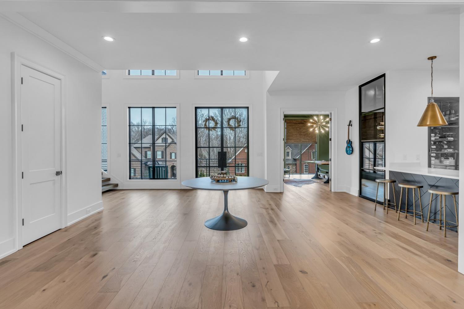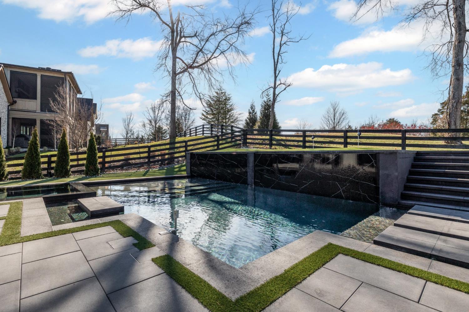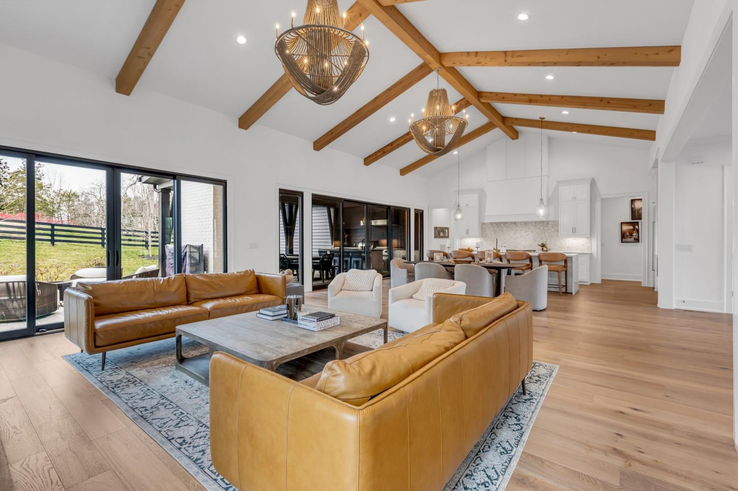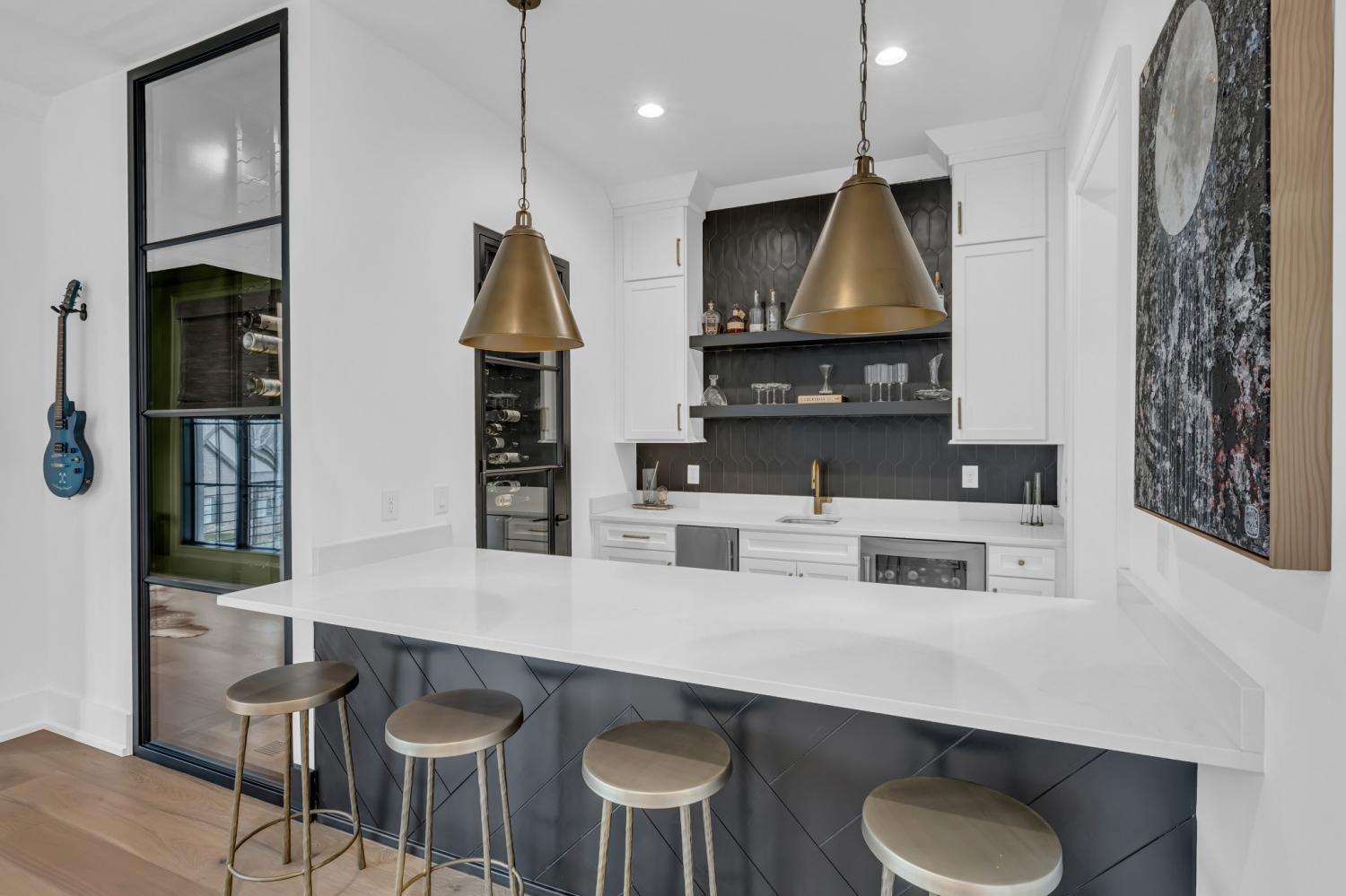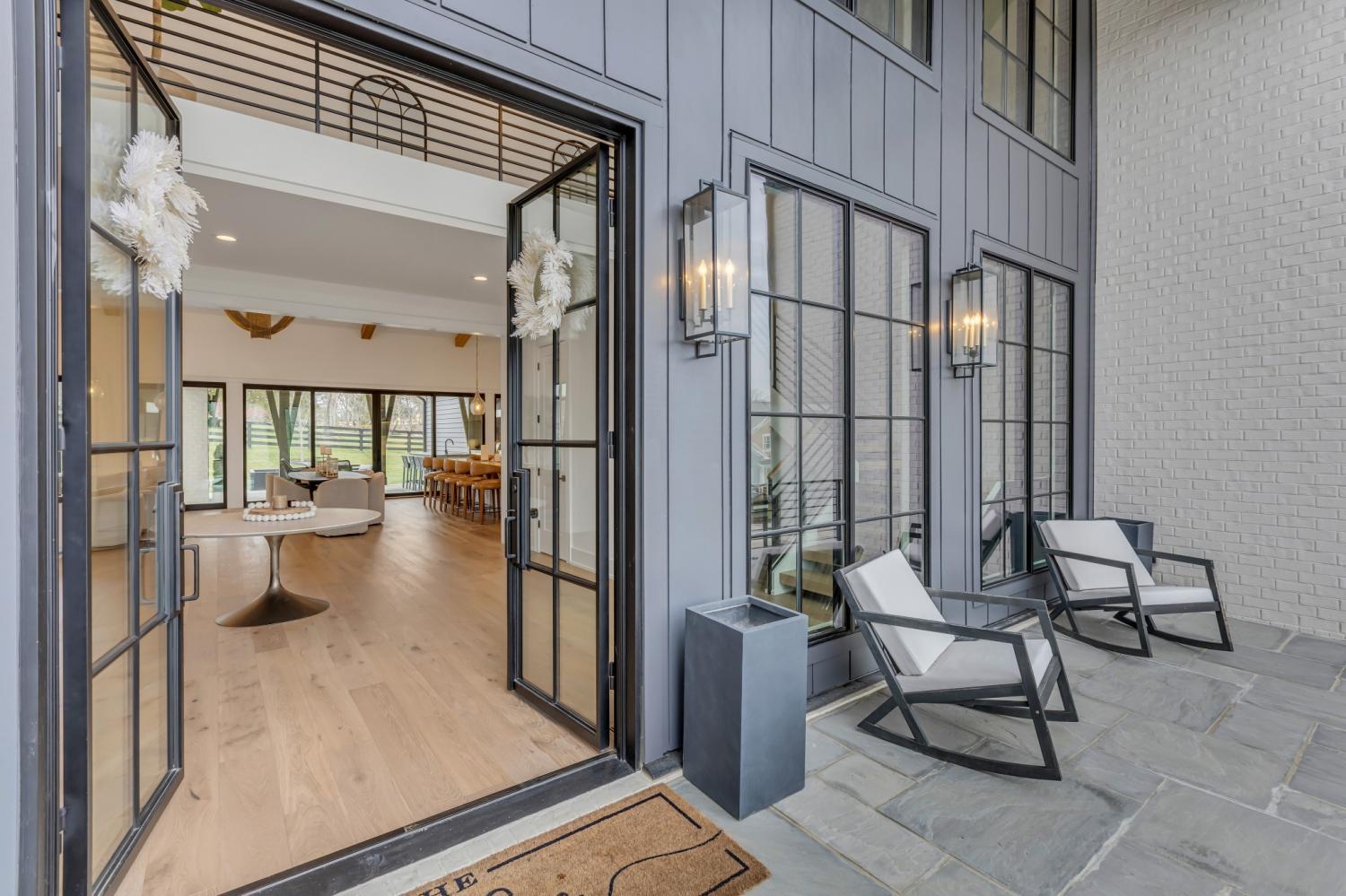 Welcome to this stunning custom-built residence in the prestigious Troubadour Golf & Field Club, crafted by Tennessee Valley Homes in 2022. Spanning 5,929 square feet on a 0.45-acre lot, this architectural masterpiece combines modern elegance with timeless design, offering an unparalleled lifestyle in one of Middle Tennessee’s most sought-after communities. This home features five spacious bedrooms, five full bathrooms, and two half baths, providing ample space for family and guests. Step inside to discover an open-concept floor plan flooded with natural light and adorned with wide-plank hardwood floors. The soaring ceilings and exposed beams create a sense of grandeur, while sleek, modern finishes provide a warm and inviting atmosphere. The gourmet kitchen boasts top-of-the-line appliances, a large island, and seamless flow into the dining and living areas—perfect for entertaining. A dedicated office space with custom millwork and large windows offers serene views and an ideal work-from-home environment. The luxurious primary suite serves as a private retreat, featuring a spa-like bathroom and generous closet space. For the ultimate in leisure and entertainment, enjoy the indoor bar room with a glass-enclosed wine cellar, a state-of-the-art golf simulator, and multiple lounge areas designed for relaxation and social gatherings. The expansive outdoor entertaining area is a true showstopper, featuring a fully equipped kitchen, a cozy fireplace, and ample seating for guests. The highlight is the resort-style pool and hot tub, surrounded by sleek stonework and lush landscaping, offering breathtaking views of Troubadour’s Tom Fazio-designed championship golf course. Additional features include striking curb appeal with modern architectural design, large glass doors that seamlessly connect indoor and outdoor spaces, designer lighting fixtures, custom finishes throughout, and a three-car garage with ample storage. This home is more than a residence—it’s a lifestyle.