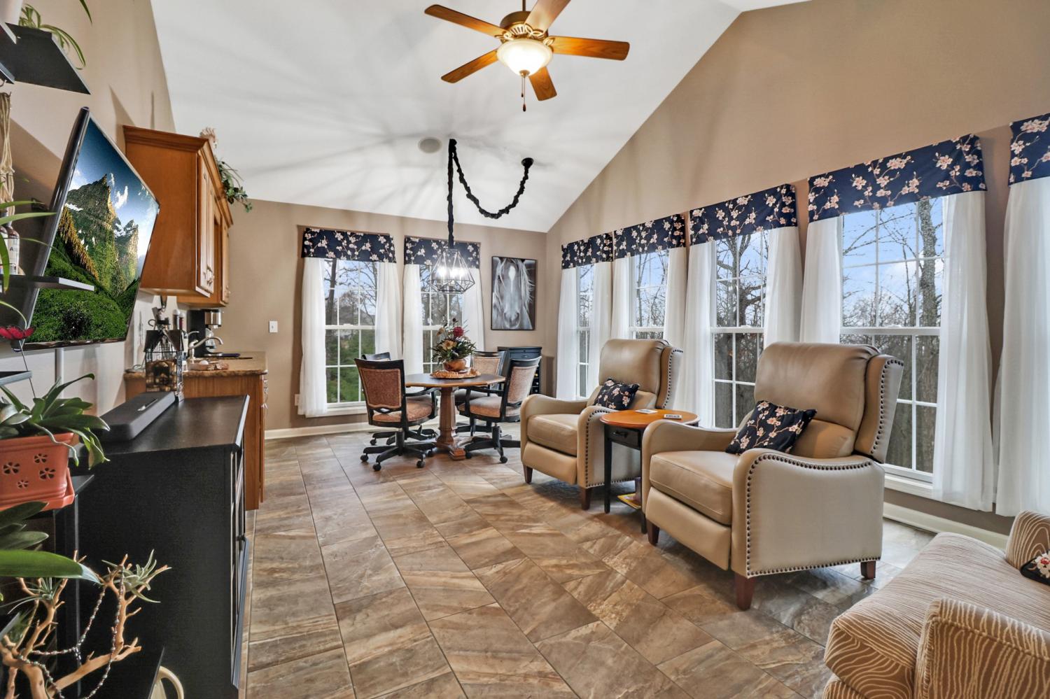 CUSTOM BUILT WITH SEASONAL MOUNTAIN VIEWS! This luxurious 4 bedroom, 2 1/2 bath home located in prestigious Fairfield Glade North features underground utilities, professional tiered landscaping with water feature, floor to ceiling windows with Plantation shutters, engineered hardwood flooring, granite countertops, tile backsplash, stainless appliances, gas cooktop, trey and cathedral ceilings, stone accent wall, split double vanities, walk in shower, custom walk in closet, Murphy bed, tiled sunroom with wet bar, 3 season room with vinyl windows that open both from top and bottom, laundry room with countertop space and utility sink, hot tub and sauna that conveys, pantry, built-in microwave and oven, composite decking with awning, irrigation system, wired for security, and fire table with chairs and gas grill for starts! The downstairs rec room is ready for your hobbies and the crawl space has concrete pad and 8 1/1 feet high by door for your workshop/storage. Garage has 18 foot door and extra tall opening. New roof in 2022! Located on a cul-de-sac and offering private back yard with seasonal mountain views! Buyer to verify all information and measurements prior to making an offer.