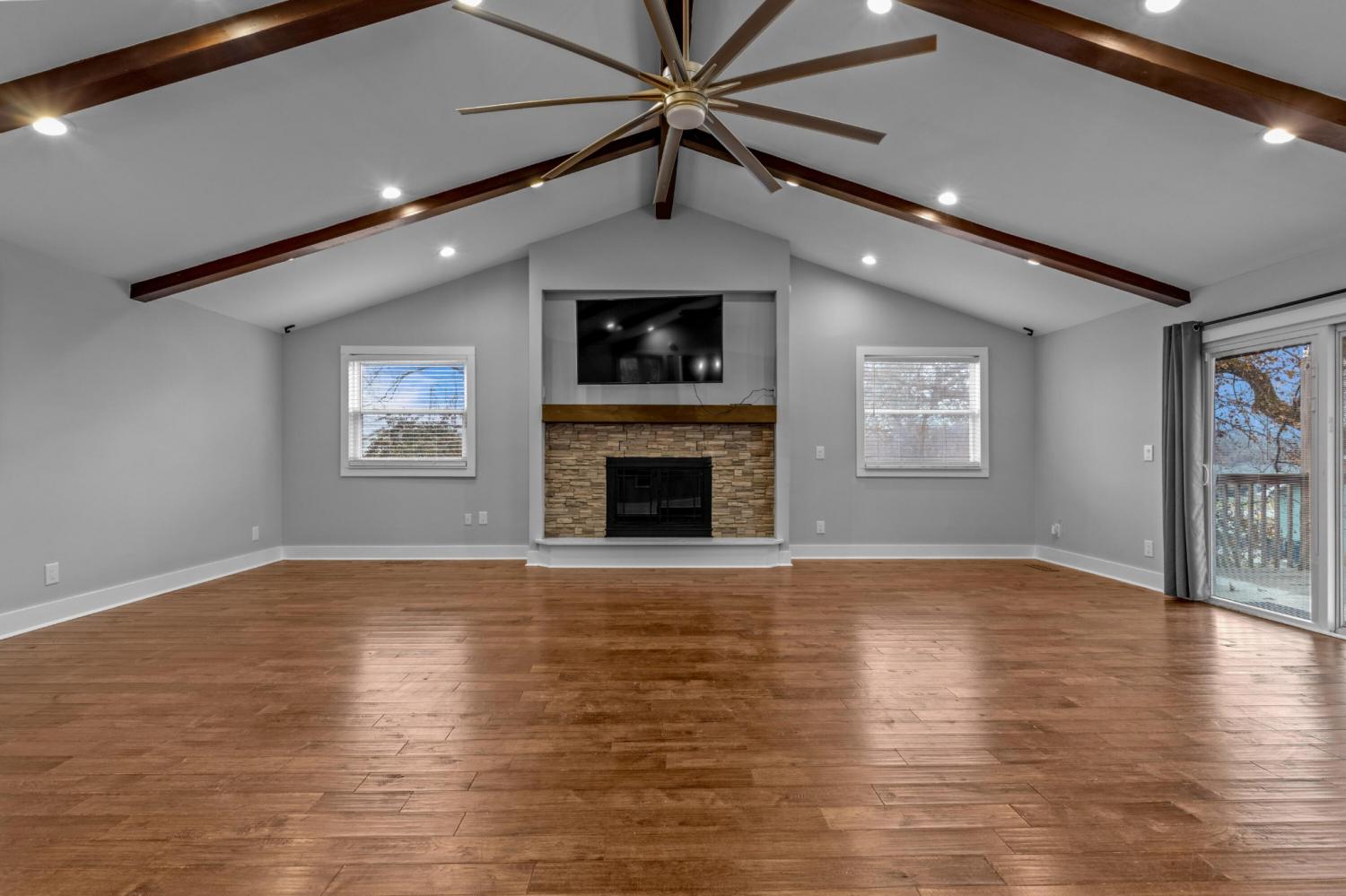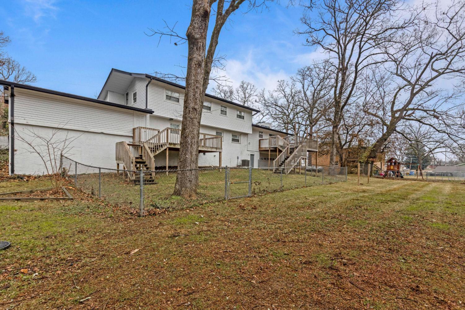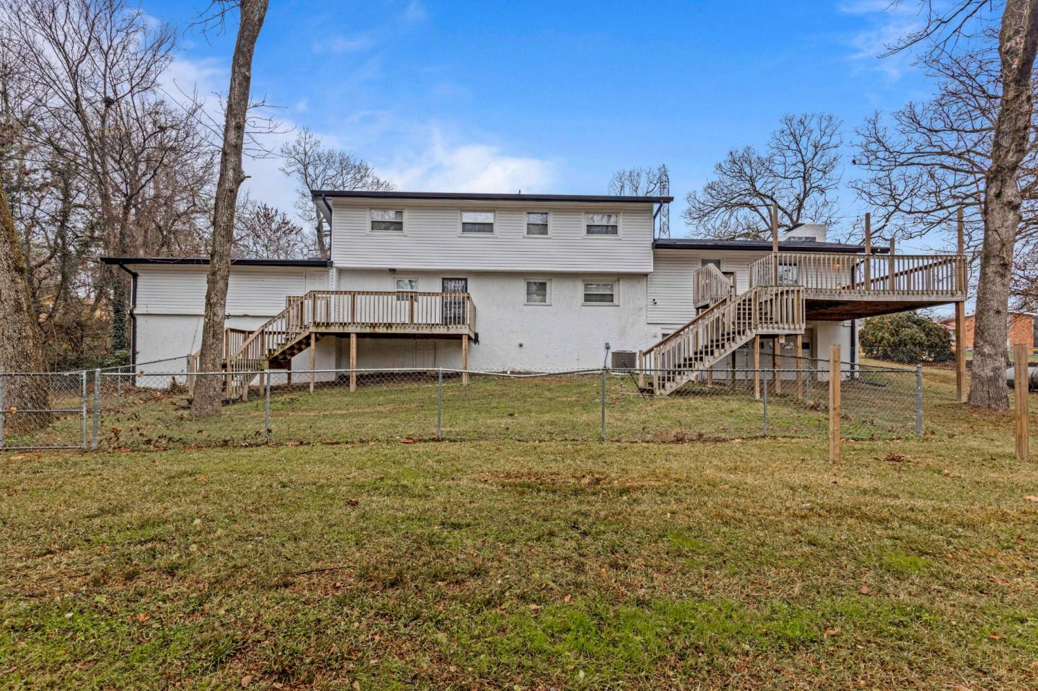 Welcome home to 4520 Locksley Lane, a spacious and thoughtfully designed 4-bedroom, 3.5-bath ranch home offering 2,552 square feet of versatile living space, including a fully finished basement—perfect for everyday living and entertaining alike. Step inside to soaring vaulted, beamed ceilings that frame a stunning stone fireplace, creating a warm and inviting focal point in the main living area. The open layout flows seamlessly into a large living and entertaining space featuring a custom built-in wet bar complete with shelving, wine fridge, ice maker, and wine racks—ideal for hosting gatherings or relaxing at home. The kitchen connects directly to the living room through a pass-through window, enhancing the open feel, and boasts an oversized island that provides ample prep space and seating. Enjoy indoor-outdoor living with two expansive decks—one located off the main living area and another off the basement—offering multiple spaces to relax or entertain. The home also features the rare convenience of two garages, with both main-level and basement-level access. Outside, you'll find a fenced-in backyard with a shed that conveys, perfect for storage or hobbies. Conveniently located just off Highway 58, this home offers easy access to shopping and restaurants and is less than a mile from the new Food City. A unique blend of space, character, and location—this is a home you don't want to miss.