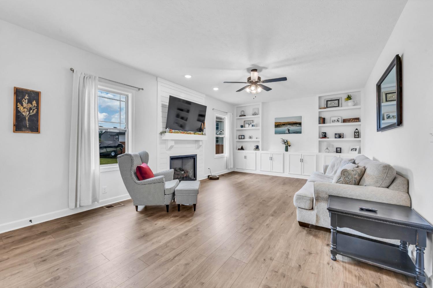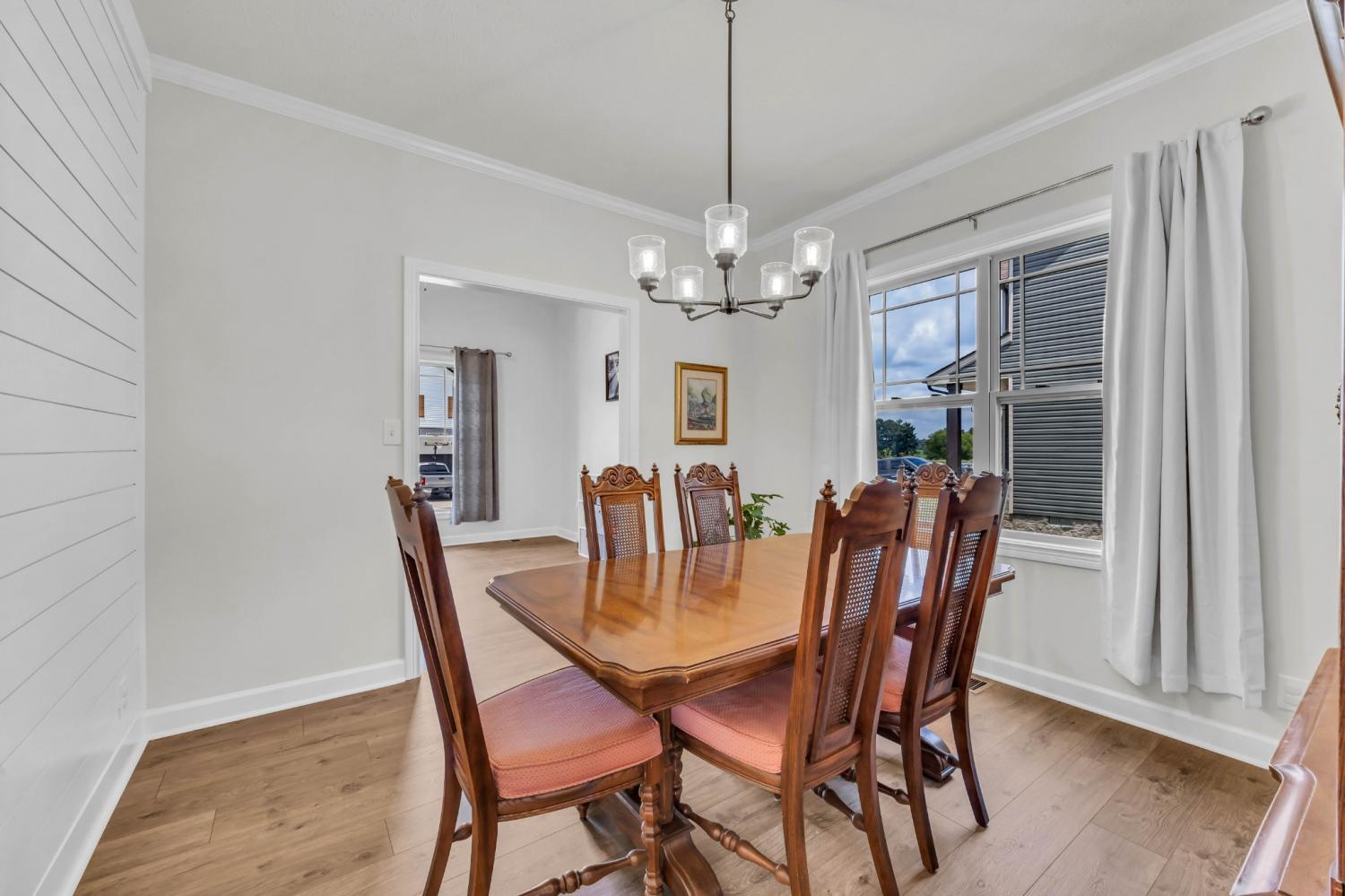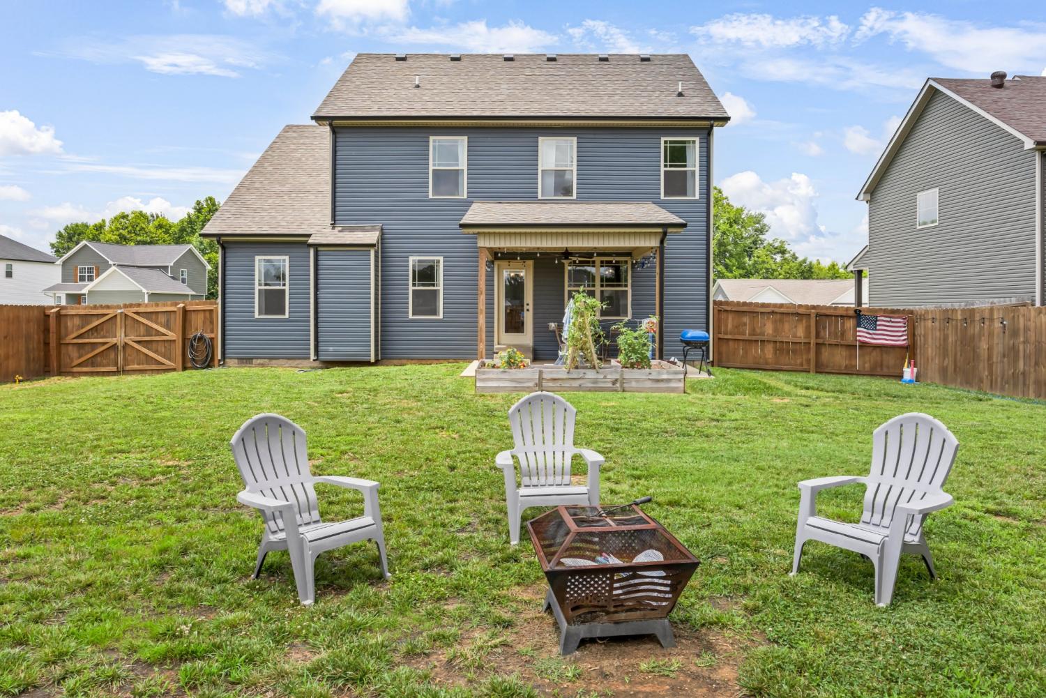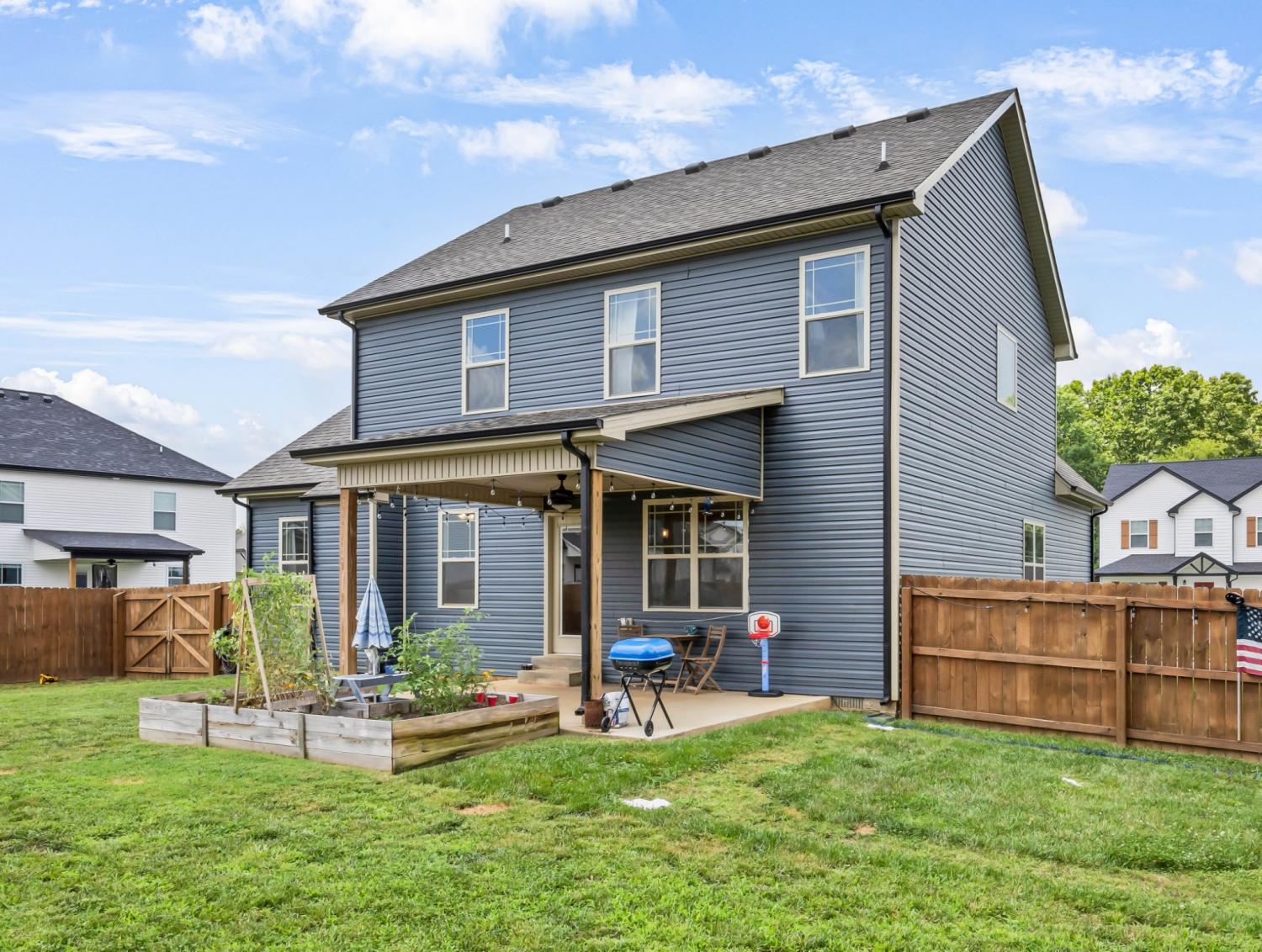 Beautifully designed and move-in ready, this Cherry Fields home offers standout curb appeal and thoughtful upgrades throughout. From the moment you arrive, the welcoming exterior sets the tone for what’s inside. Step into a bright foyer featuring a striking accent wall that blends style and function, creating an immediate wow factor. Durable and stylish LVP flooring flows throughout the main level, leading into a spacious living room with custom built-in cabinetry for both storage and a polished, custom feel. The kitchen is a true highlight, featuring soft close cabinetry, granite countertops, a modern tile backsplash, stainless steel appliances, and a generously sized pantry, perfect for everyday living and entertaining. The adjacent dining area is accented with a shiplap feature wall, adding a touch of modern farmhouse charm. Upstairs, the primary suite offers a relaxing retreat with a tray ceiling and elegant crown molding. The ensuite bath includes double vanities with granite countertops and ample storage. Additional bathrooms also feature granite countertops, maintaining a cohesive and upscale finish throughout the home. A large linen closet adds even more practical storage. Notable upgrades include a floored attic for extra storage and an enhanced crawlspace with moisture barrier, providing added peace of mind. Outside, enjoy a fully fenced backyard, ideal for relaxing, gardening, or entertaining. Located in the desirable Cherry Fields community in Clarksville, this home offers convenient access to shopping, dining, schools, and Fort Campbell, while still providing a neighborhood feel. Stylish, functional, and well cared for, this is one you’ll want to see in person. VA assumable loan is also an option.