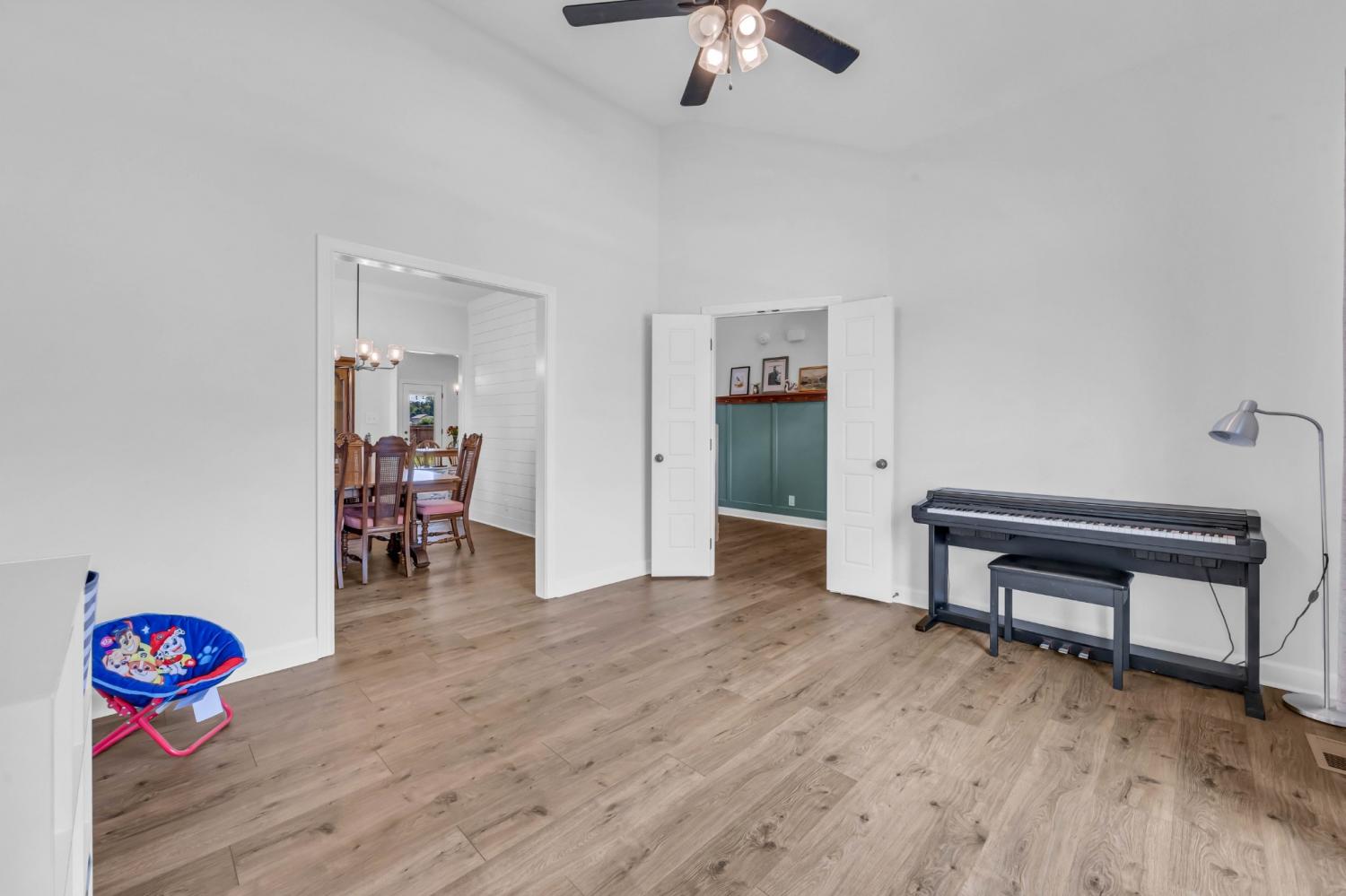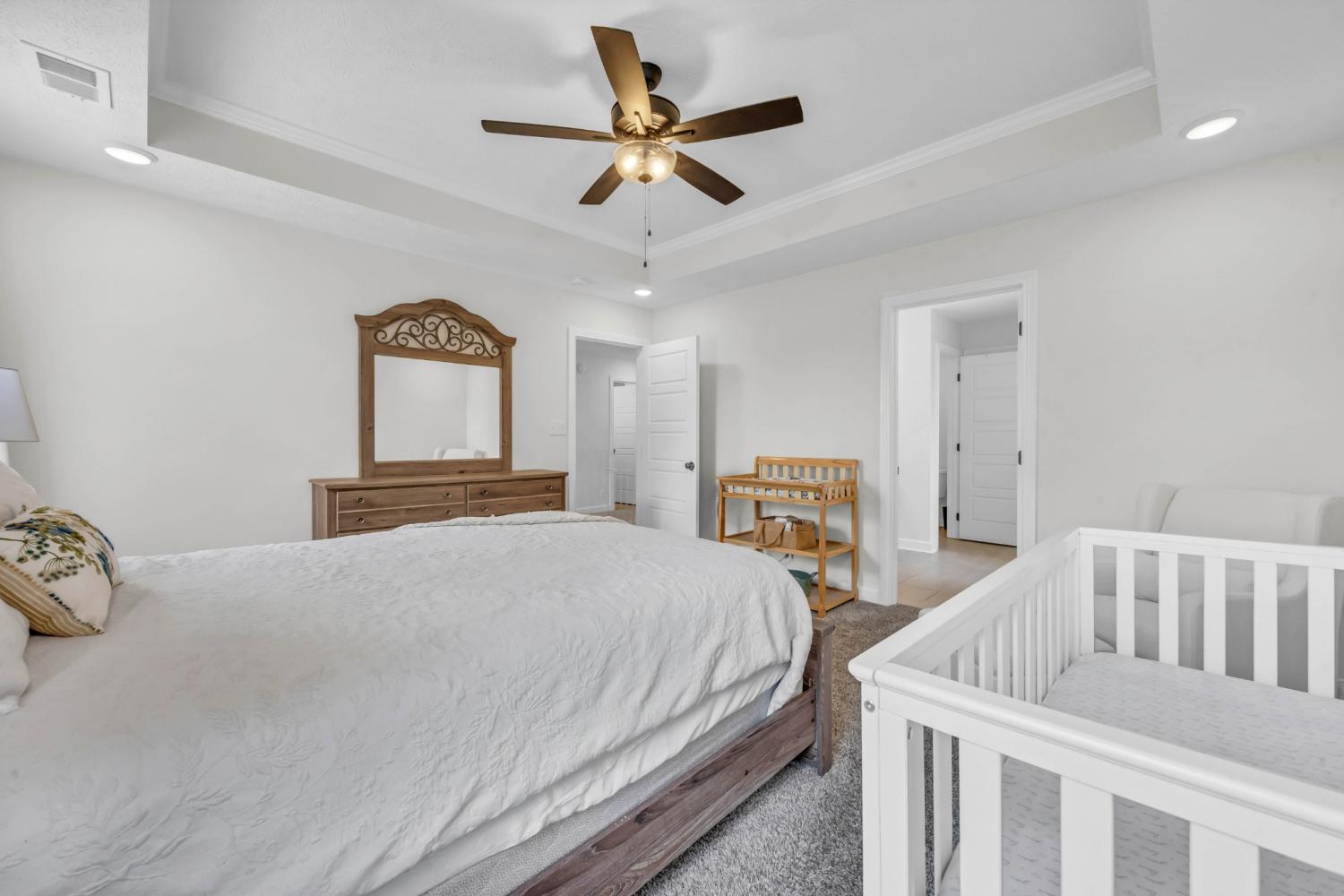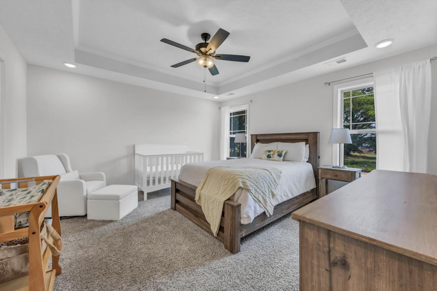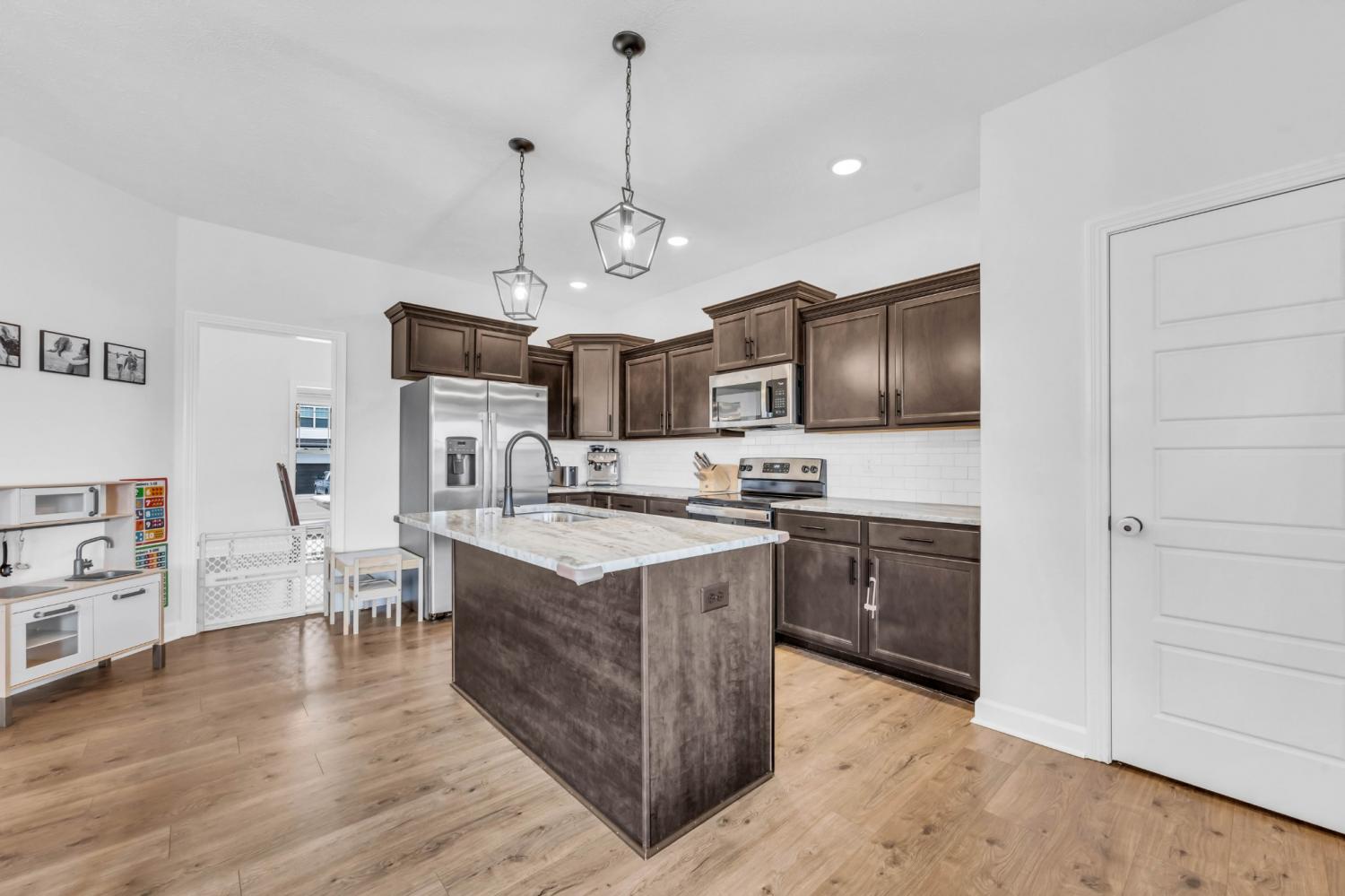 Beautifully designed and move-in ready, this Cherry Fields home offers standout curb appeal and thoughtful upgrades throughout. From the moment you arrive, the welcoming exterior sets the tone for what’s inside. Step into a bright foyer featuring a striking accent wall that blends style and function, creating an immediate wow factor. Durable and stylish LVP flooring flows throughout the main level, leading into a spacious living room with custom built-in cabinetry for both storage and a polished, custom feel. The kitchen is a true highlight, featuring soft close cabinetry, granite countertops, a modern tile backsplash, stainless steel appliances, and a generously sized pantry, perfect for everyday living and entertaining. The adjacent dining area is accented with a shiplap feature wall, adding a touch of modern farmhouse charm. Upstairs, the primary suite offers a relaxing retreat with a tray ceiling and elegant crown molding. The ensuite bath includes double vanities with granite countertops and ample storage. Additional bathrooms also feature granite countertops, maintaining a cohesive and upscale finish throughout the home. A large linen closet adds even more practical storage. Notable upgrades include a floored attic for extra storage and an enhanced crawlspace with moisture barrier, providing added peace of mind. Outside, enjoy a fully fenced backyard, ideal for relaxing, gardening, or entertaining. Located in the desirable Cherry Fields community in Clarksville, this home offers convenient access to shopping, dining, schools, and Fort Campbell, while still providing a neighborhood feel. Stylish, functional, and well cared for, this is one you’ll want to see in person. VA assumable loan is also an option.