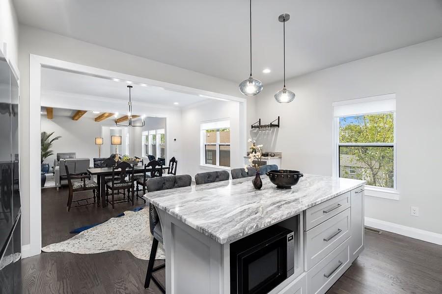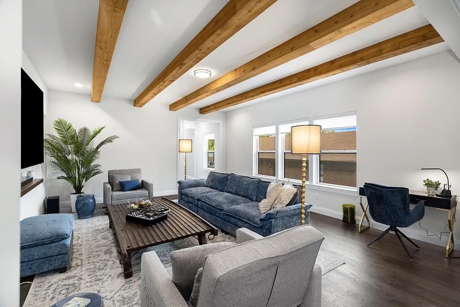 This thoughtfully designed home offers the perfect mix of style, comfort, and location. From the moment you walk in, the wood beams in the living room add warmth and character, while the open floor plan creates an easy flow from the living space to the dining area and kitchen—ideal for both everyday living and entertaining. The kitchen is a standout, featuring stainless steel appliances, granite countertops, a tile backsplash, upscale fixtures, a pantry, and a large island with seating that naturally becomes the heart of the home. A spacious, dedicated laundry room with a washer and dryer included makes day-to-day life even easier. The primary suite feels like a peaceful retreat with its recessed ceiling, large walk-in closet, and spa-inspired ensuite bath complete with a double-sink vanity and a beautifully finished shower. Three additional bedrooms offer flexibility for guests, work-from-home space, or whatever fits your lifestyle. The main bathroom also features a double-sink vanity, and a convenient powder room is perfect for visitors. Step outside to a fully fenced backyard and large deck—great for relaxing evenings or casual get-togethers. A one-car garage and concrete driveway provide easy parking. Located just minutes from local favorites like Sho Pizza Bar and Curry Boys BBQ, and only 5 miles from downtown Nashville, this home puts you close to everything while still feeling like a retreat.