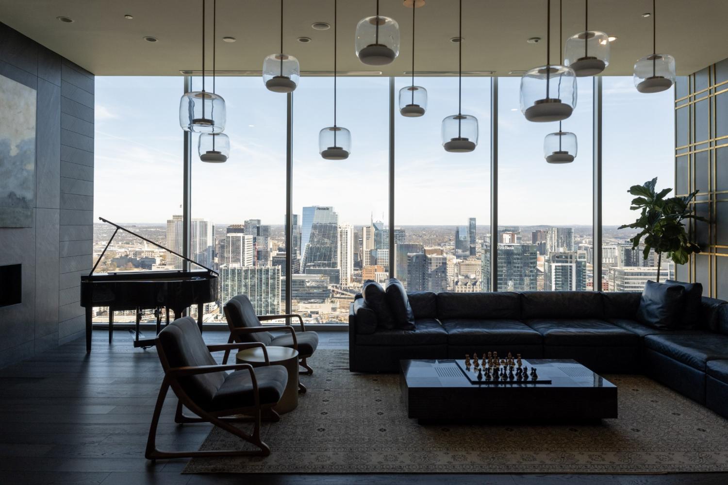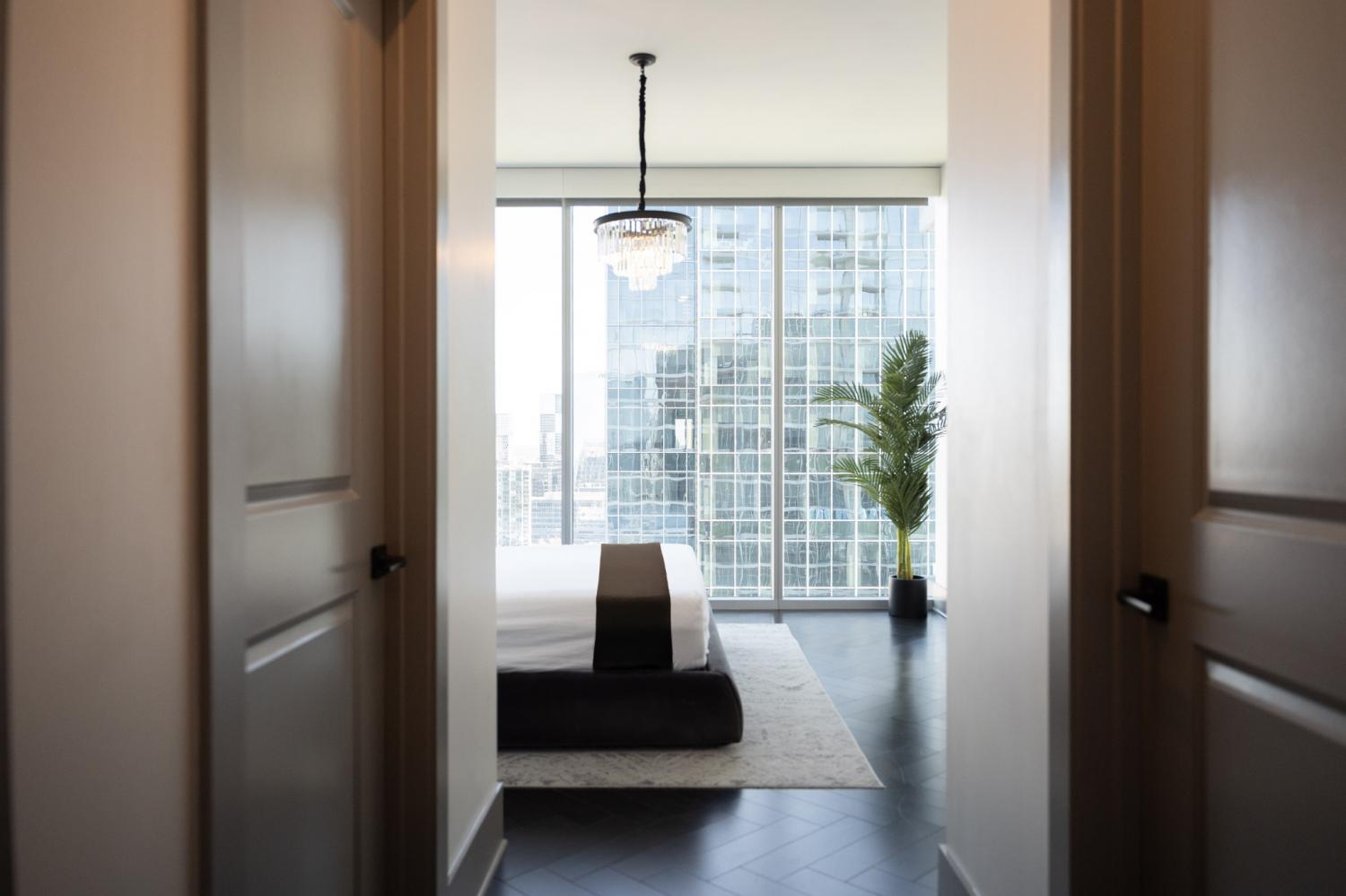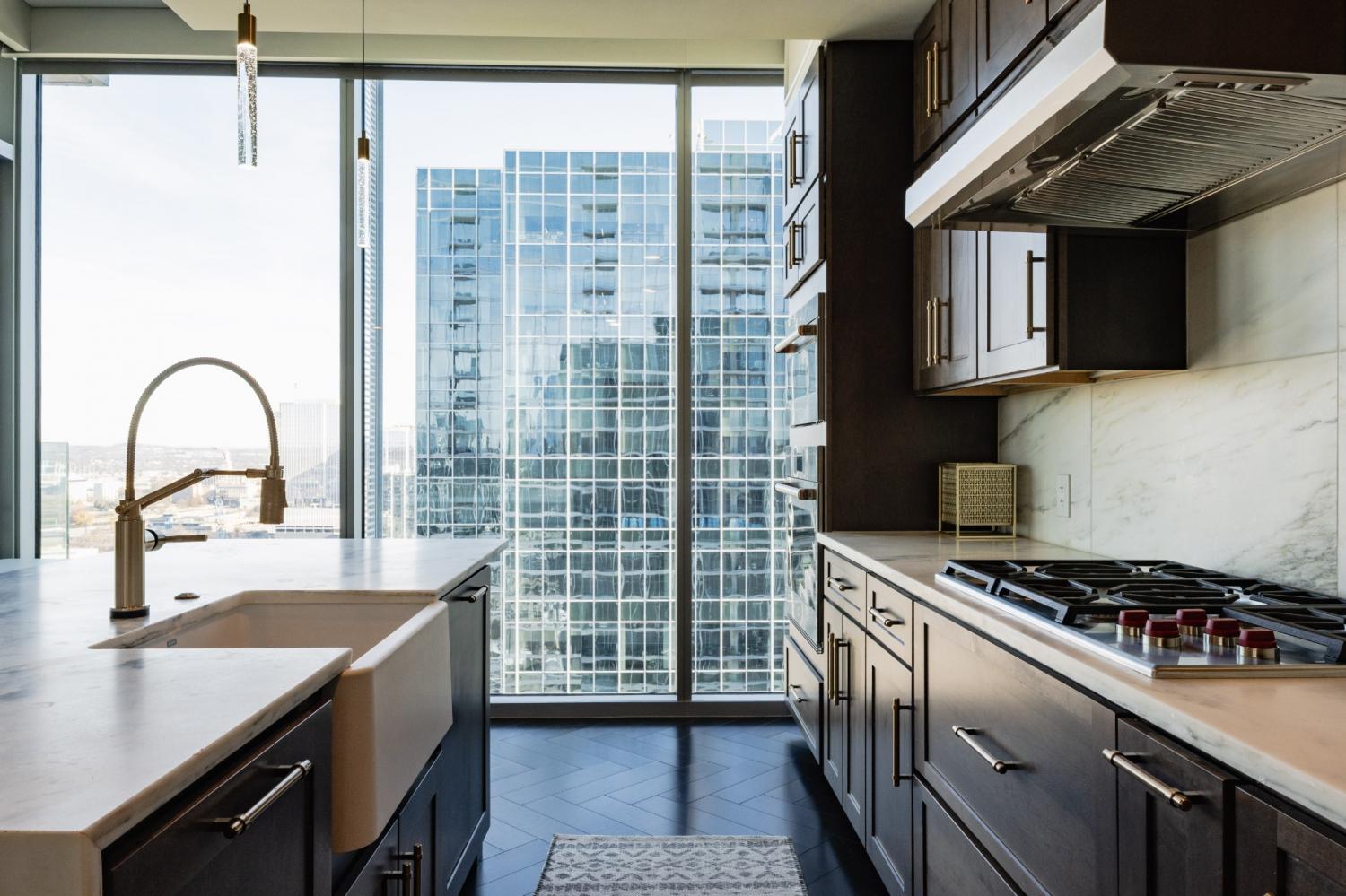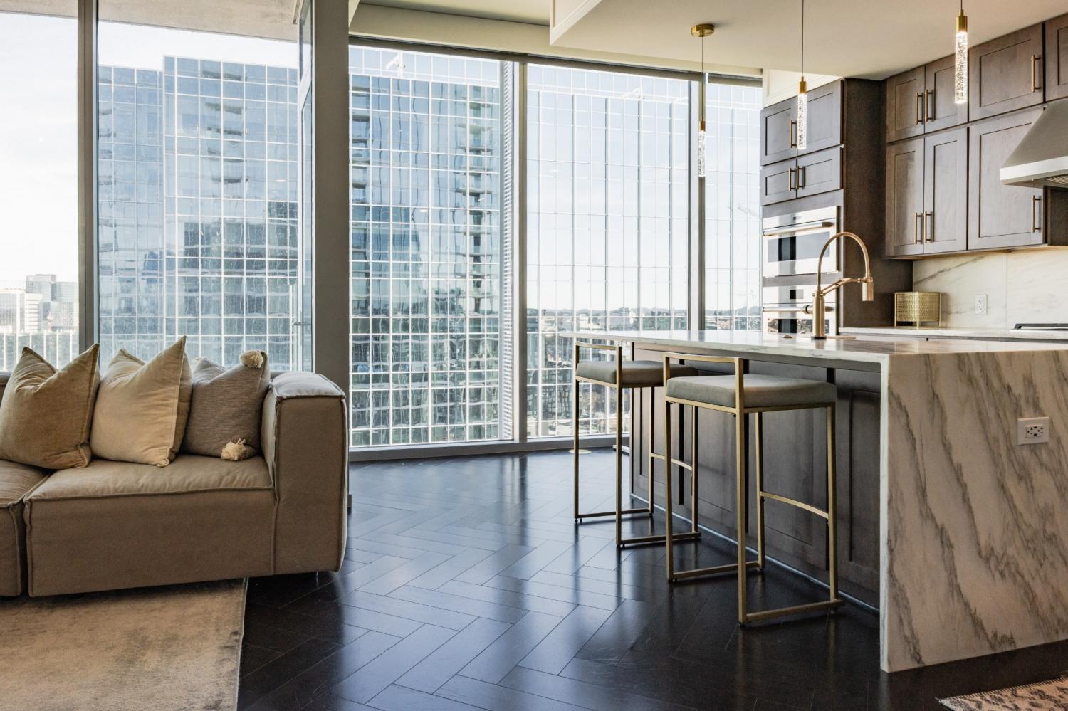 Welcome to elevated city living at Broadwest! This pristine 2/2.5 residence offers over 1,400 square feet of refined living space with stunning downtown views and impeccable designer finishes throughout. The chef’s kitchen is outfitted with top of the line Sub-Zero Wolf appliances, refrigerated wine storage, and sleek modern cabinetry. Floor-to-ceiling windows flood the unit with natural light, while motorized shades provide effortless comfort and privacy. Tenant will receive access to TWO assigned parking spaces with EV charger access. Residents enjoy optional services including room service, housekeeping, and valet parking—bringing true resort living to the heart of the city. Exclusive amenities crown the 34th floor and are not shared with hotel guests, offering a private rooftop experience complete with resort-style spaces and panoramic views. Ideally located just minutes from Broadway, downtown dining and entertainment, and convenient access to I-40, this residence offers luxury, location, and lifestyle in one exceptional package. Available furnished and ready for immediate move in.