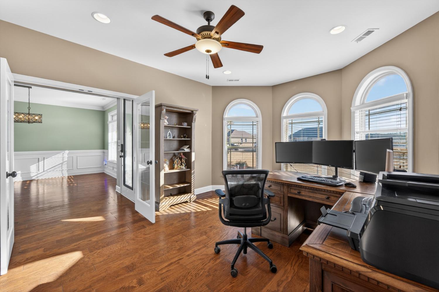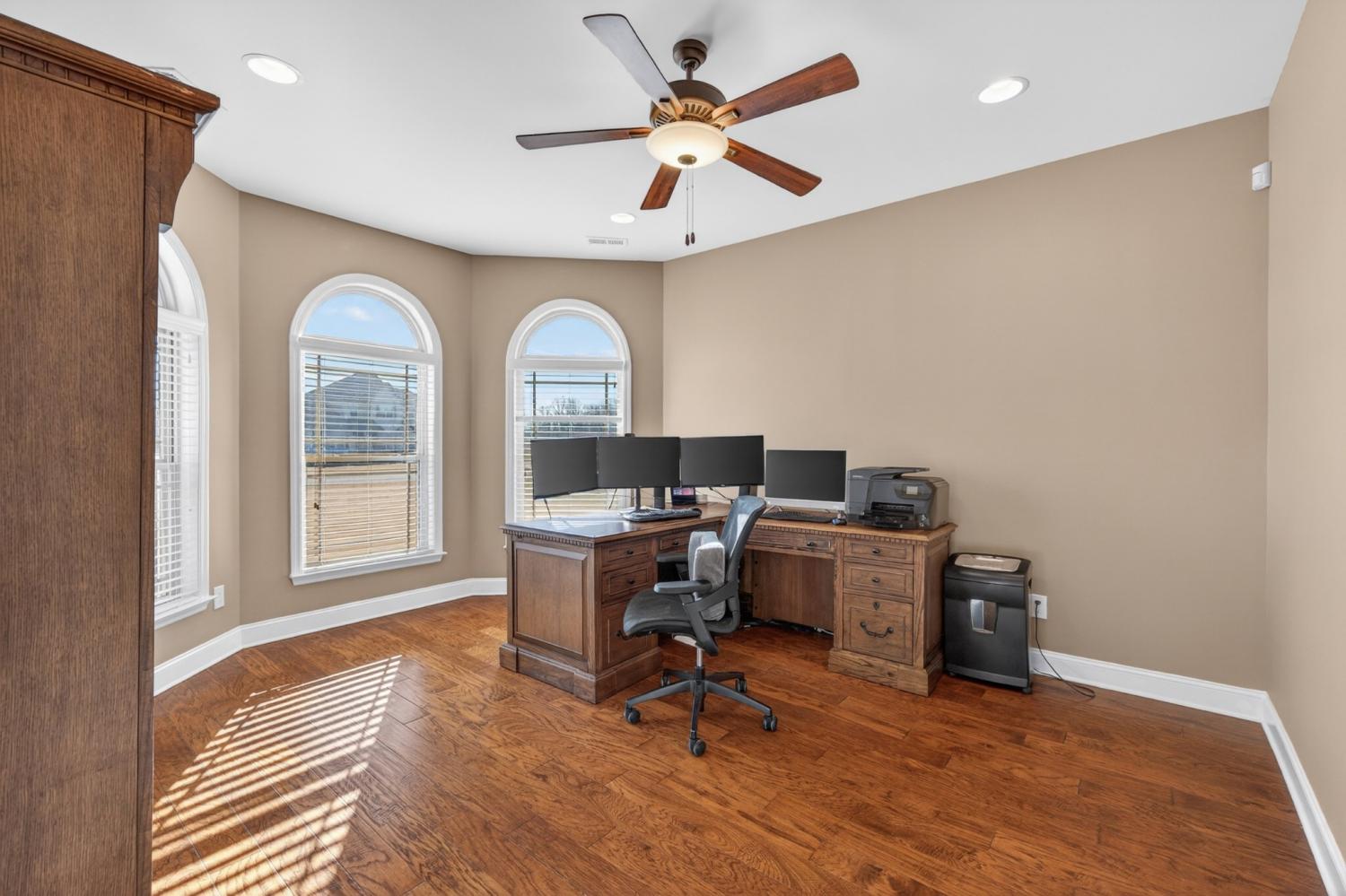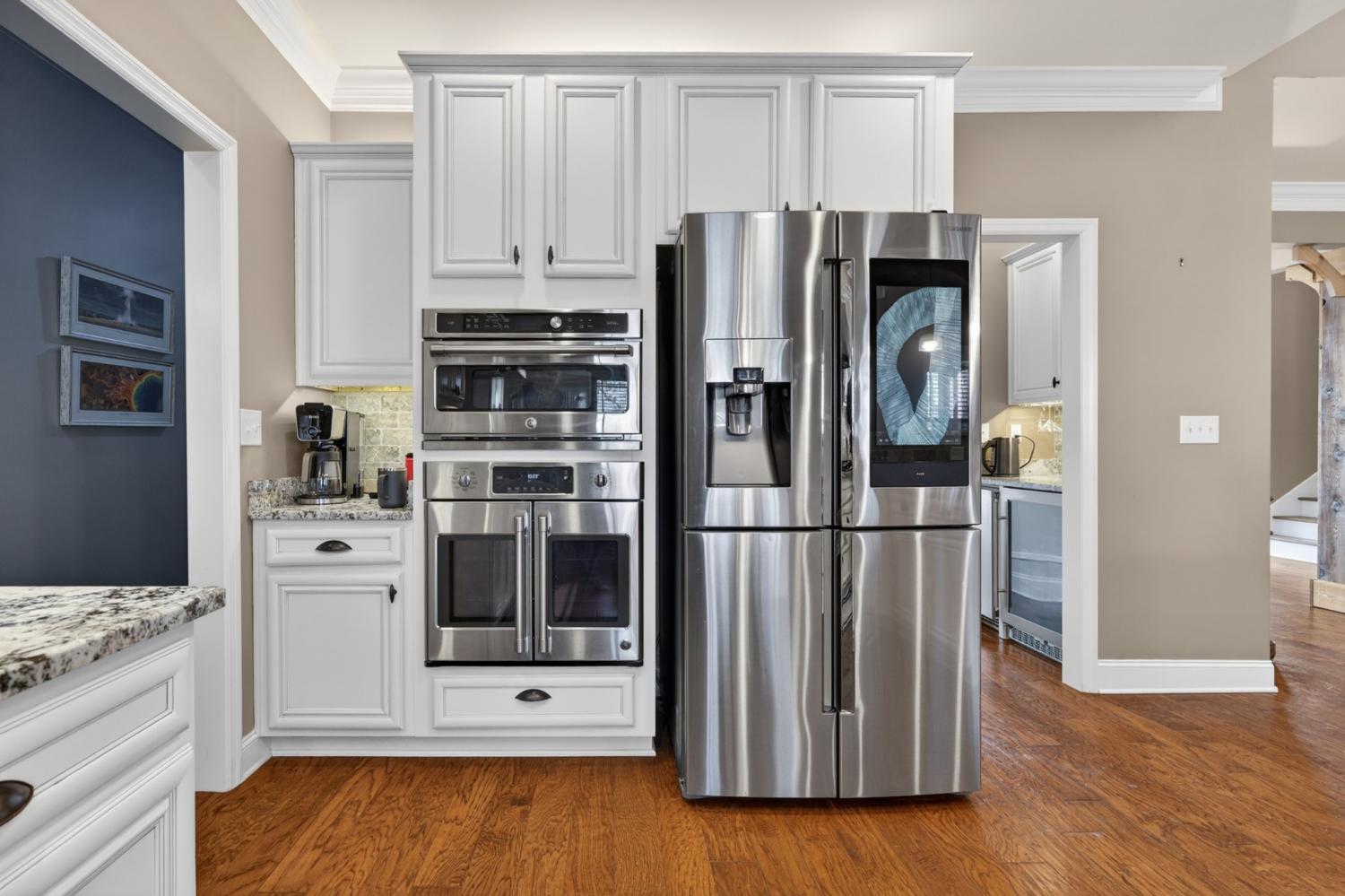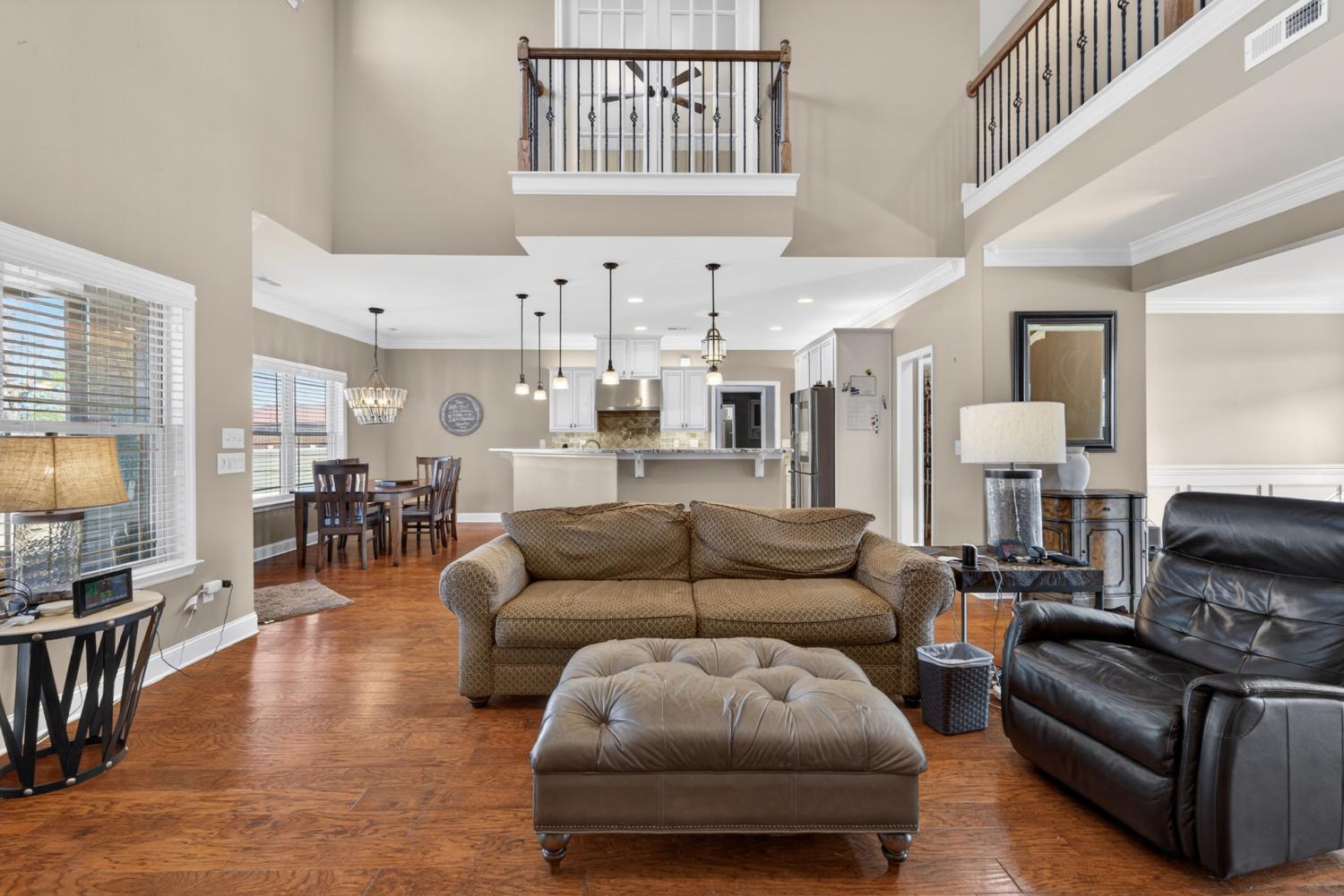 Beautifully designed 4-bedroom, 3-bath brick home featuring a fenced backyard for added privacy and a screened-in patio perfect for relaxing or entertaining. The great room boasts soaring 19-foot ceilings and a striking fireplace, creating an impressive yet inviting atmosphere. The open-concept floor plan flows seamlessly into a state-of-the-art kitchen equipped with premium Wolf appliances, including a gas stove, pot filler, double oven, and a convenient wet butler bar downstairs which features a wine fridge/beverage center and under the cabinet ice maker which makes clear top hat ice cubes for drinks —ideal for hosting. The main level offers two spacious primary suites, along with a large office highlighted by a charming bay window. Upstairs, you’ll find two additional bedrooms, a bonus area with its own wet bar with an ice maker, and a balcony overlooking the great room below. Additional features include a 3-car garage with a built in cobalt work station with wall cabinets and tool hanging system, smart home security system, USB plugs in every room, and thoughtful finishes throughout -mud bench/hall tree. Located in an established neighborhood on the south end of town, this home combines luxury, comfort, and functionality in one exceptional property.