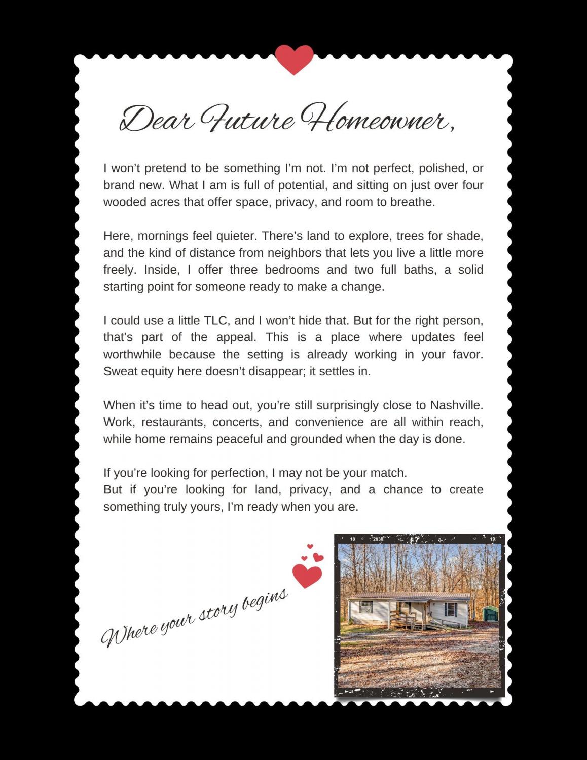 Affordable opportunity in Cheatham County on just over 4 acres of mostly wooded land. This 3-bedroom, 2-bath manufactured home on a permanent foundation offers a realistic entry into homeownership for buyers looking to get out of the rental cycle and into the market. The home provides a solid starting point with 1,188 sq ft, a manageable footprint, and room to make improvements over time. Located in Ashland City with a quick, workable commute to Nashville, this property offers space and freedom while still maintaining access to work, dining, and conveniences. Ideal for buyers who prioritize acreage, affordability, and potential. Priced at $199,000, this is an opportunity to get in the game and build equity at your own pace. See “Dear Future Homeowner” letter for a closer look at the lifestyle this property offers.
