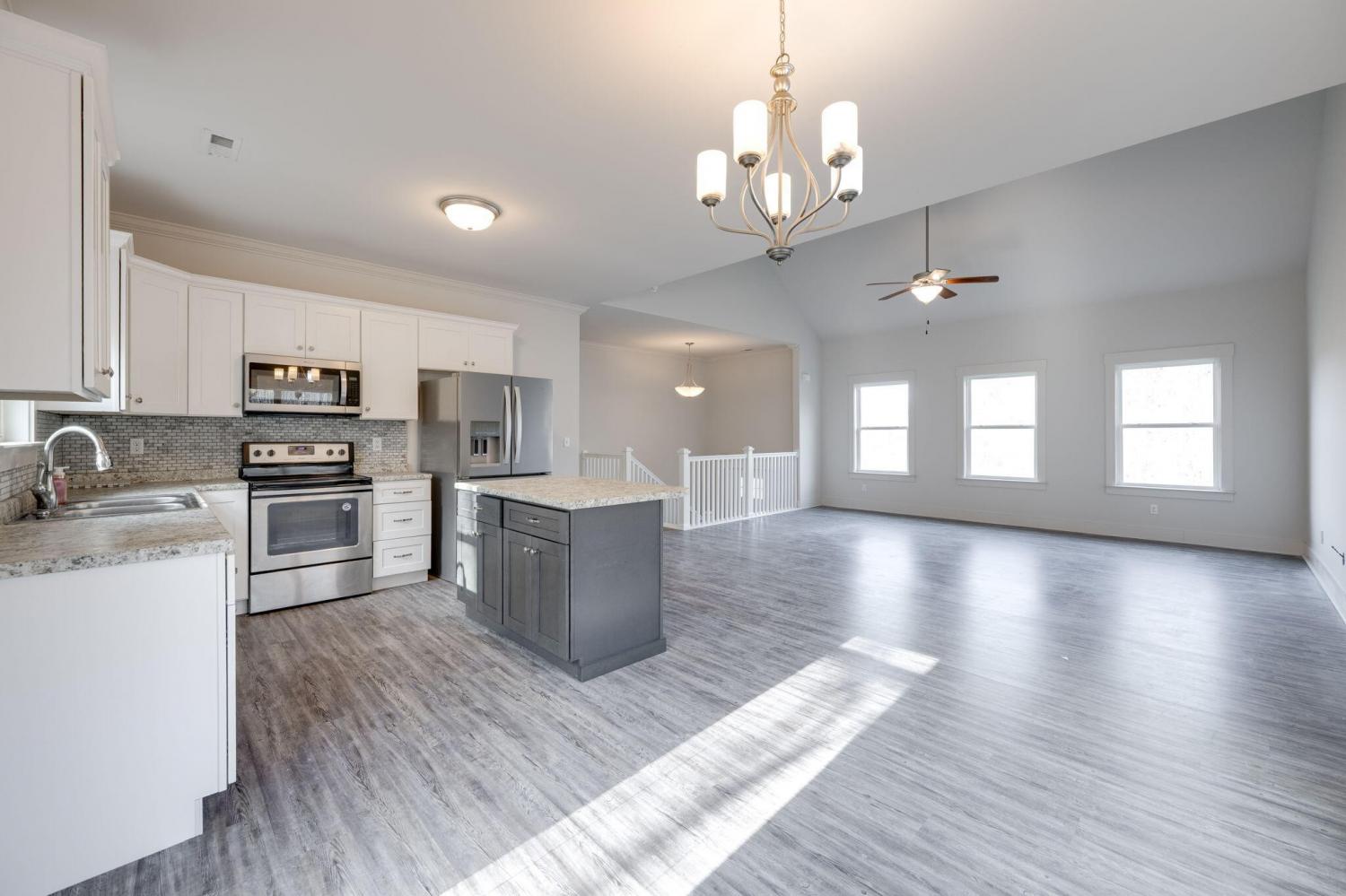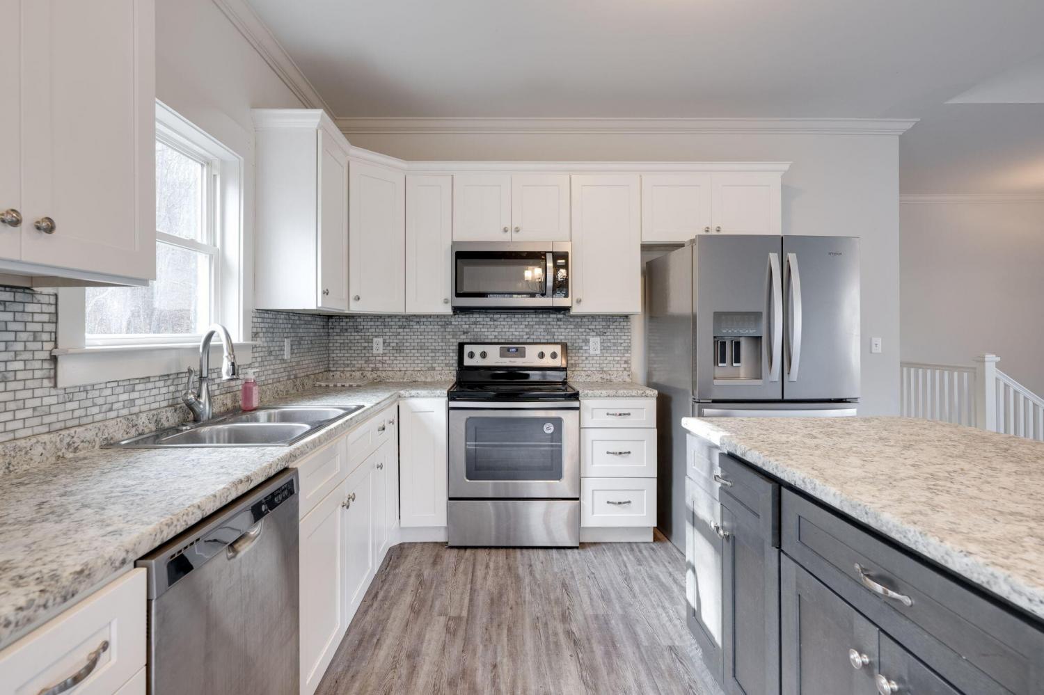 Nestled on nearly an acre, this home offers a wonderful private setting and a thoughtfully designed split-foyer floor plan, complemented by all-new interior paint. The vaulted great room flows seamlessly into the dining area and kitchen, creating an open and airy space ideal for both everyday living and entertaining. The spacious primary suite features an elegant tray ceiling and a private bath with double vanities, a separate shower, and a walk-in closet. Two additional bedrooms are generously sized and offer ample closet space. The kitchen showcases white cabinetry with a contrasting dark center island, abundant countertop space, and a stylish tile backsplash. Stainless steel appliances include a double-door, side-by-side refrigerator. Light gray laminate flooring enhances the main living areas, adding a modern touch. An unfinished basement provides endless possibilities for future expansion, with the potential to add approximately 300-400 square feet for a bonus area or even a fourth bedroom. The home also features a large, two-car side-loading garage. Step out onto the newly finished rear deck and enjoy the peaceful privacy and views of local wildlife.