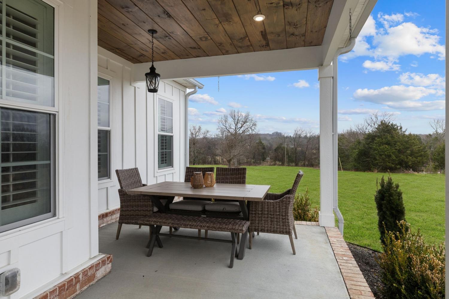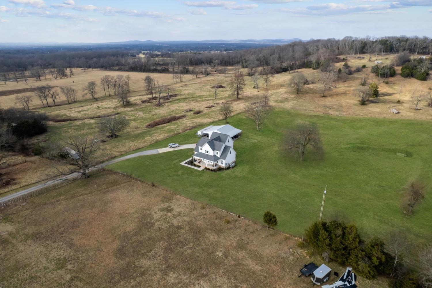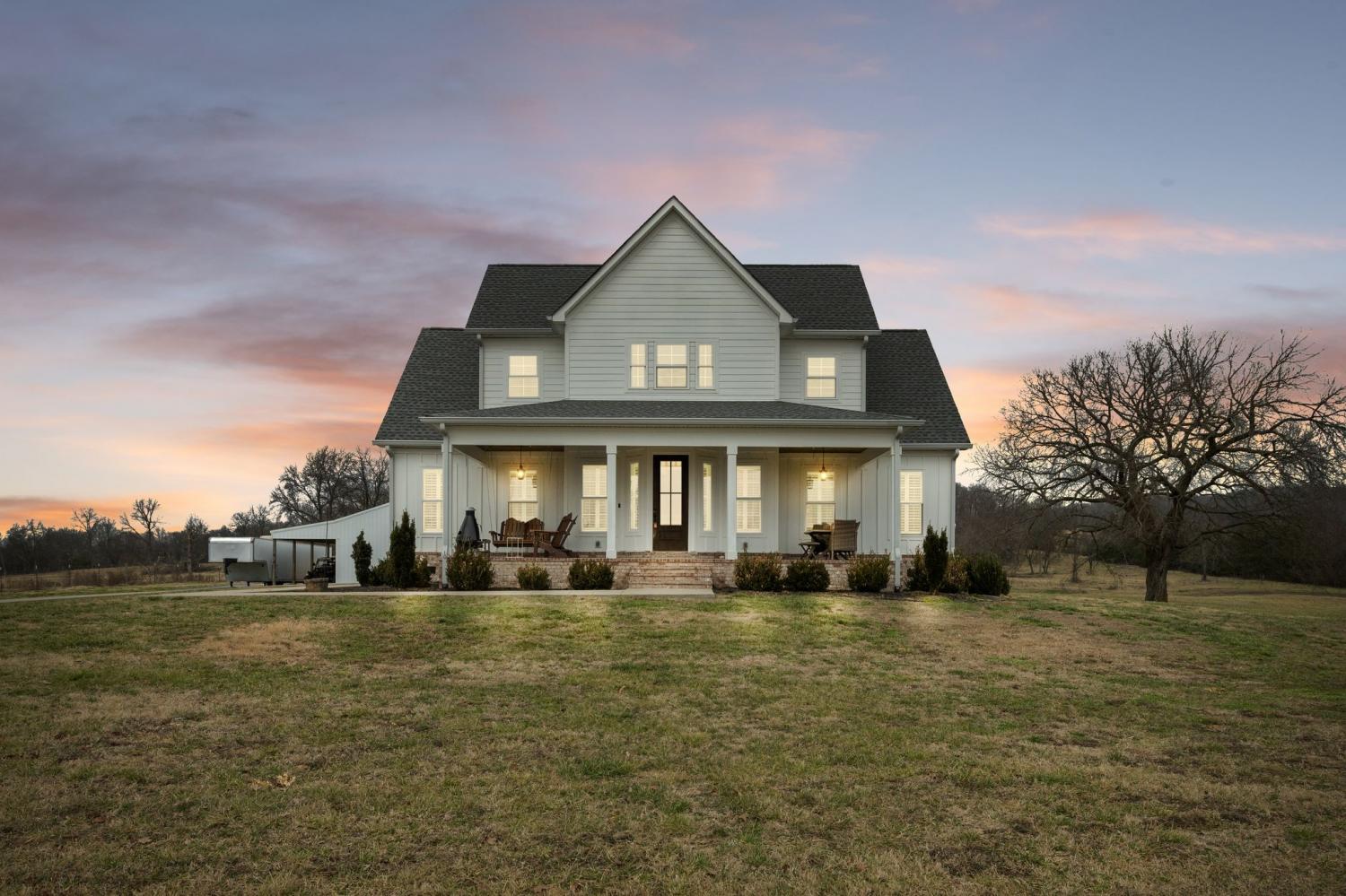 Farmhouse living with gorgeous sunsets awaits you. This custom-built 2022 home sits on 7.65 scenic acres and offers the perfect blend of privacy and convenience. Light and bright throughout, the home features soaring ceilings, wide welcoming porches, and a screened back porch ideal for taking in the views for miles. The main floor offers a private primary suite, while the second floor boasts generously sized bedrooms, each with its own bathroom, providing plenty of space for family and guests. The large kitchen island is the heart of the home, perfect for gathering and entertaining, and plantation shutters add timeless style throughout. Outside, you’ll love the 30' x 40' customized detached building ideal for a workshop, storage, hobbies, or equipment. With high-speed internet, this property supports work-from-home living without giving up country serenity. Bring your horses, four-wheelers, or simply your desire for space and quiet, this modern farmhouse offers it all. Home is zoned for the highly desirable Rockvale Schools.