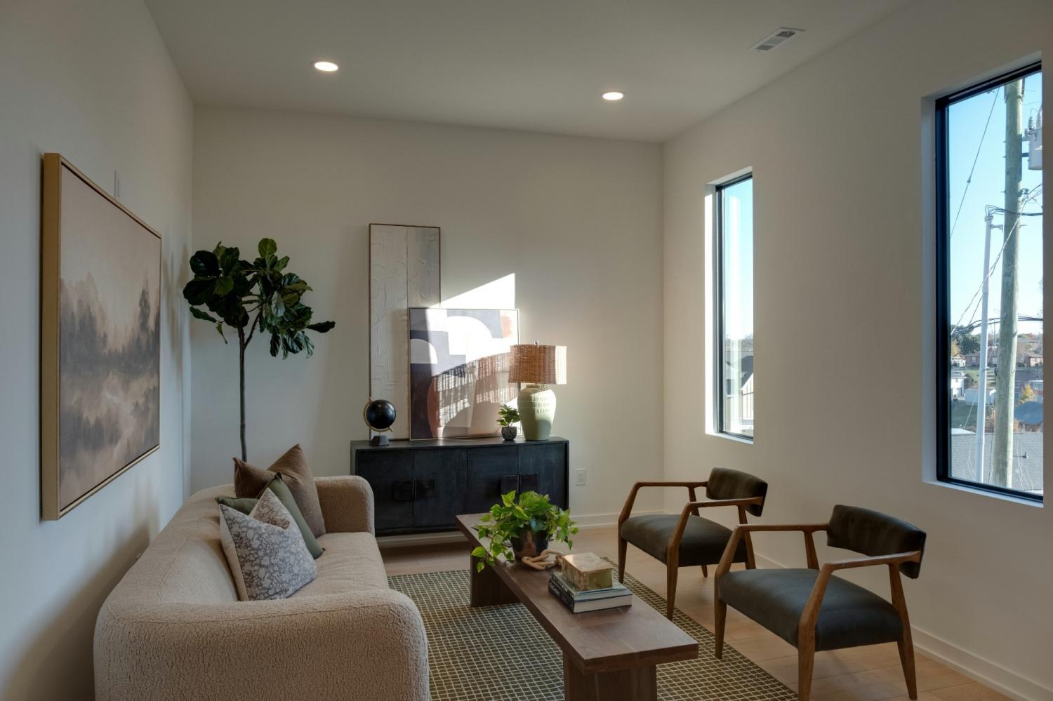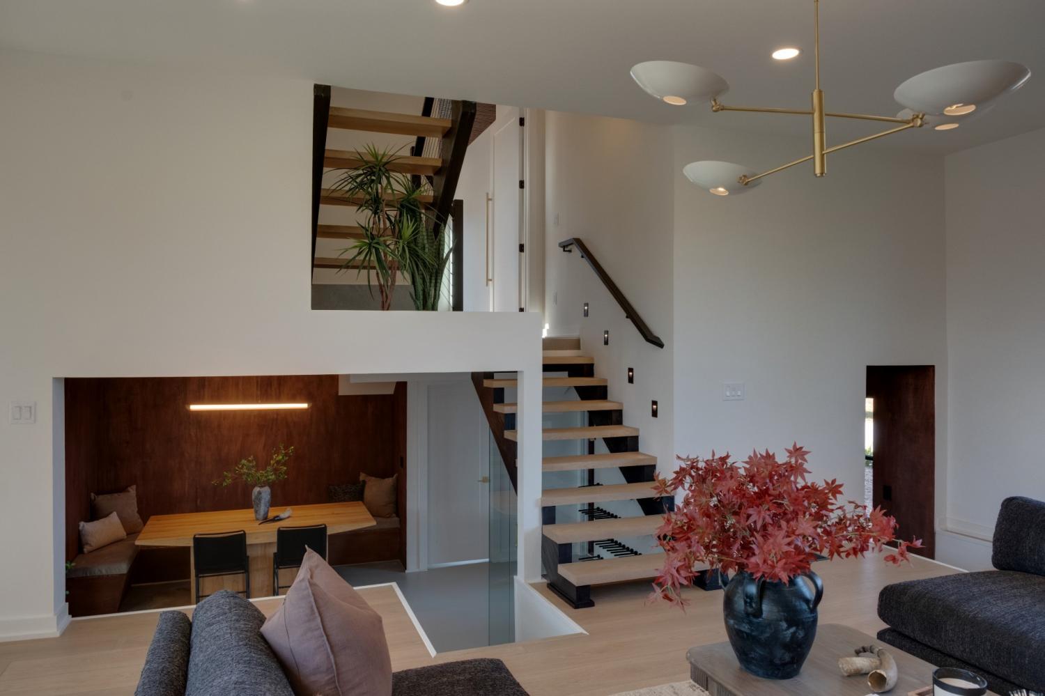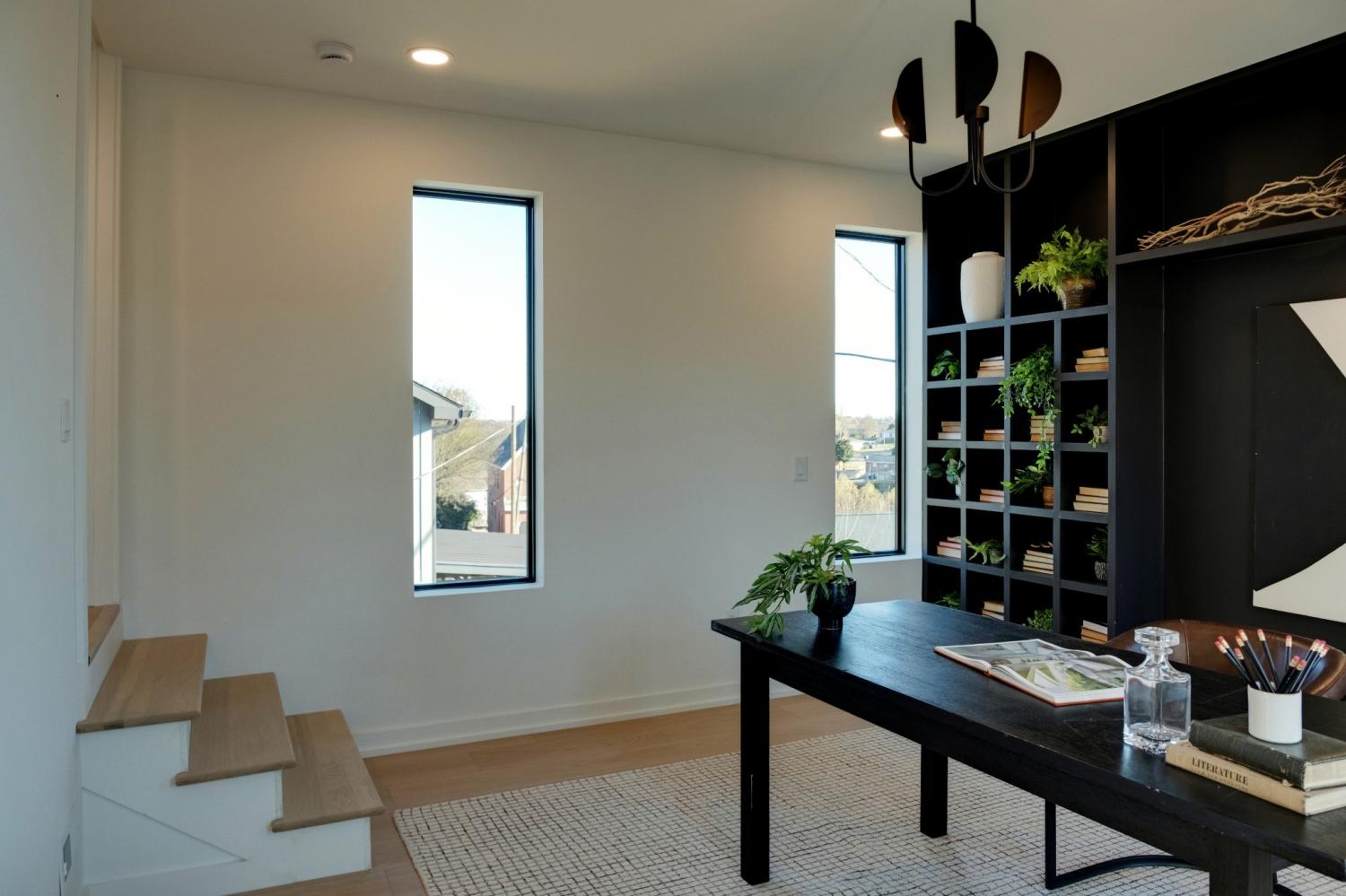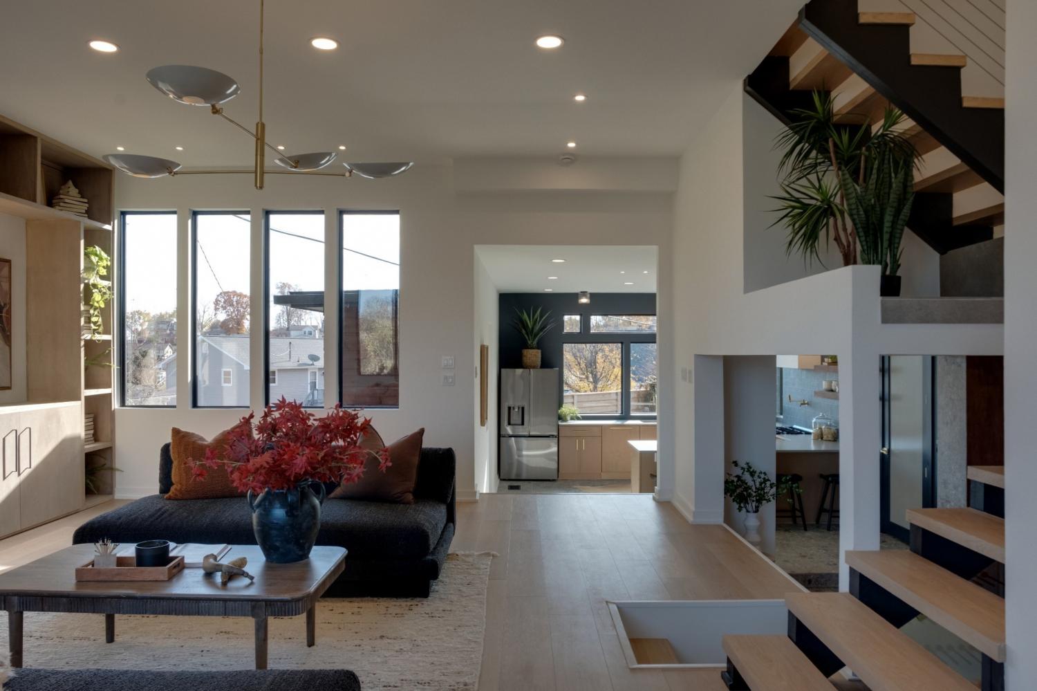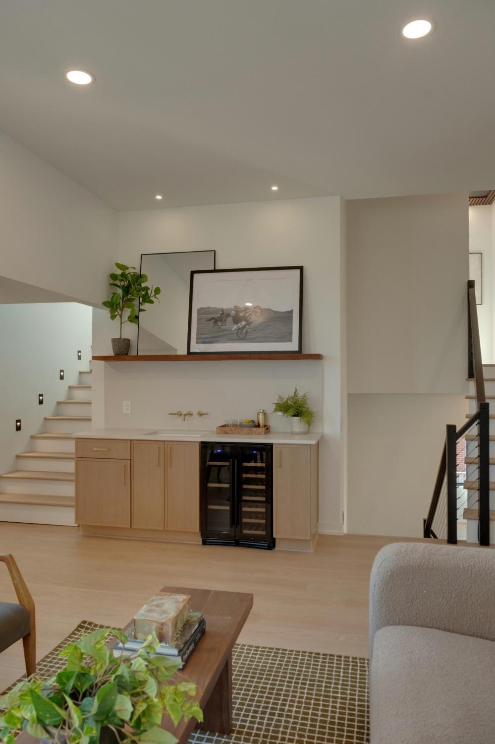 Welcome to House Nexus by Archie & Boyd. A warm, light-filled modern home designed for everyday living and elevated entertaining, House Nexus blends sculptural architecture with comfort, privacy, and timeless materials in one of East Nashville’s most desirable settings. A private electric gate creates a quiet sense of arrival, setting the tone for the thoughtfully curated spaces beyond. Inside, natural light pours through oversized windows into a striking living room anchored by a sleek gas fireplace. Sculptural floating stairs rise through the space, creating a dramatic yet welcoming architectural moment—ideal for slow mornings, intimate evenings, and effortless hosting. At the heart of the home, the architectural kitchen balances clean geometry with true functionality. Luxury FORNO appliances, a full gas range, custom cabinetry, refined surfaces, and terrazzo flooring selected for durability and texture create a chef-caliber environment that feels both elevated and livable. Just beyond, a sculptural dining space unfolds with custom wood detailing, built-in seating, and an intimate wine cellar—an inviting setting designed for gathering and conversation. The primary suite follows as a private retreat, featuring a naturalistic spa-inspired bath with sculptural fixtures, custom tilework, earthy finishes, a soaking tub, dual closets, and a discreet all-in-one washer and dryer within the dressing wing. One flight above, a secondary living room offers a flexible, light-filled retreat with a wet bar and direct access to a private balcony overlooking East Nashville. An adjacent guest suite and discreet office complete the level, creating an inspiring indoor–outdoor environment suited for visitors, work, or quiet moments of pause. Steps from Shelby Park, Shelby Golf Course, and top restaurants, House Nexus offers architectural distinction without sacrificing warmth, livability, or ease.